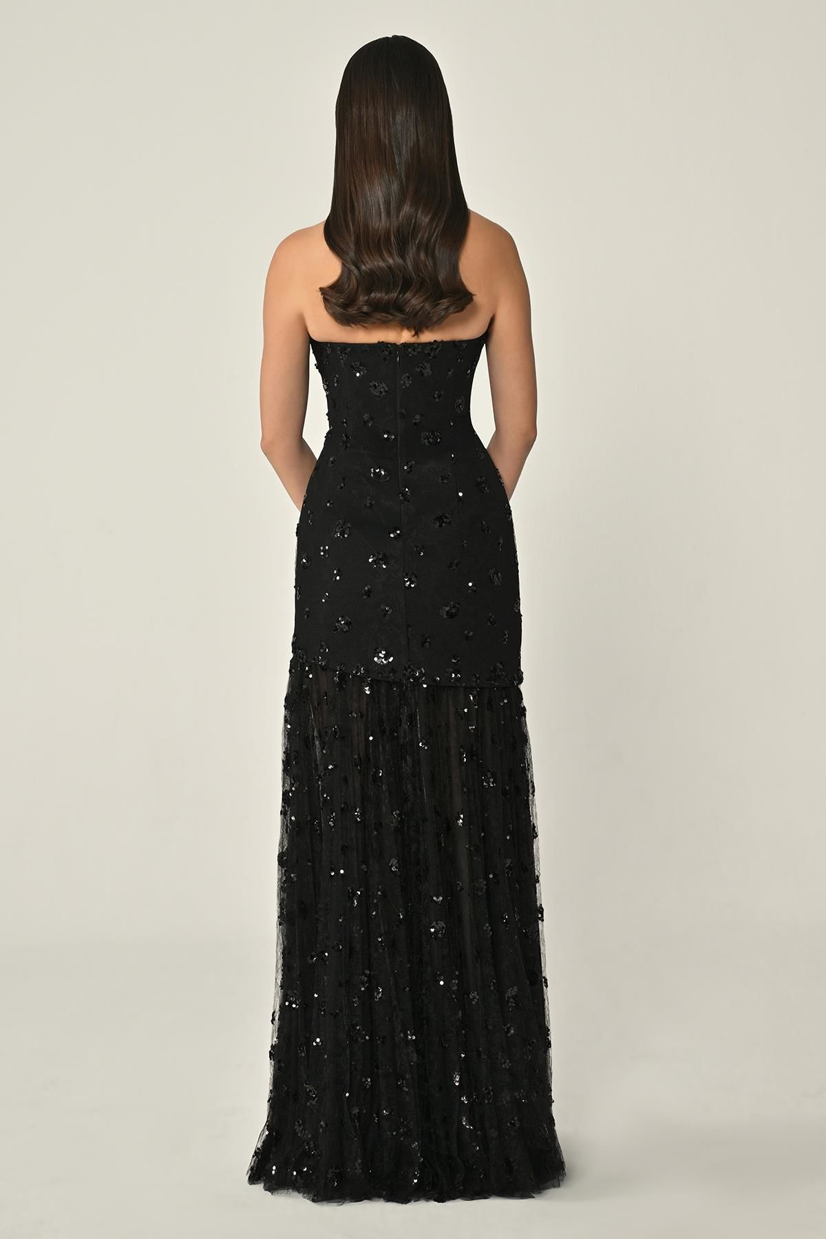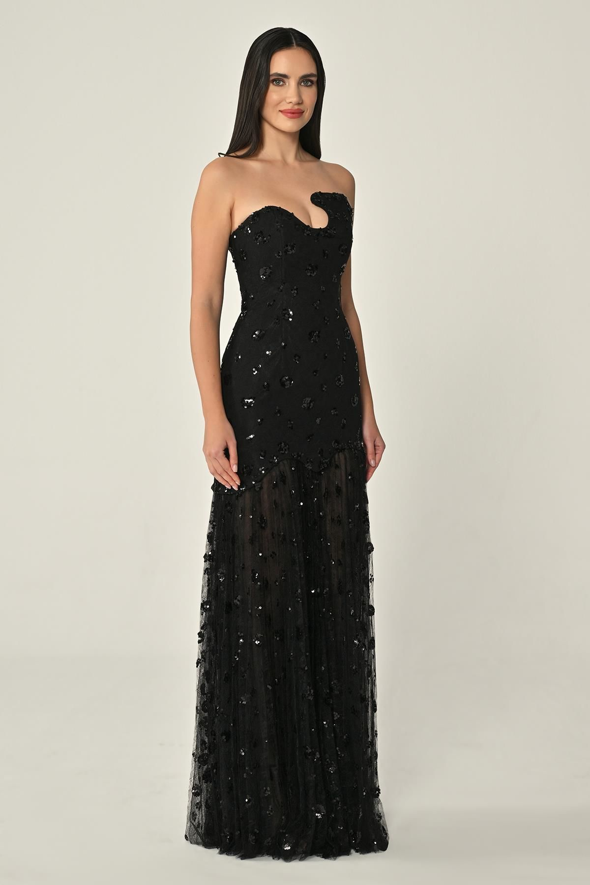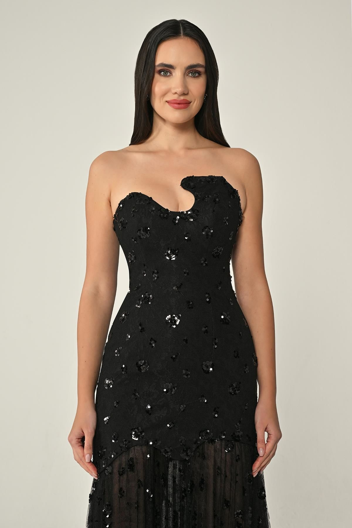 Straplez Göğüs Asimetrik Kesim Eteği Payetli Tül Abiye Elbise Alfa Beta