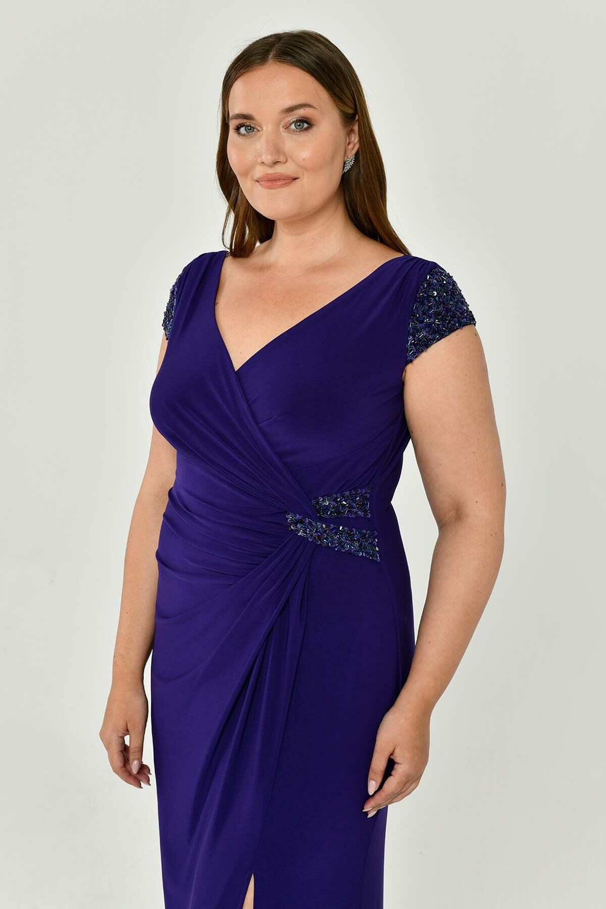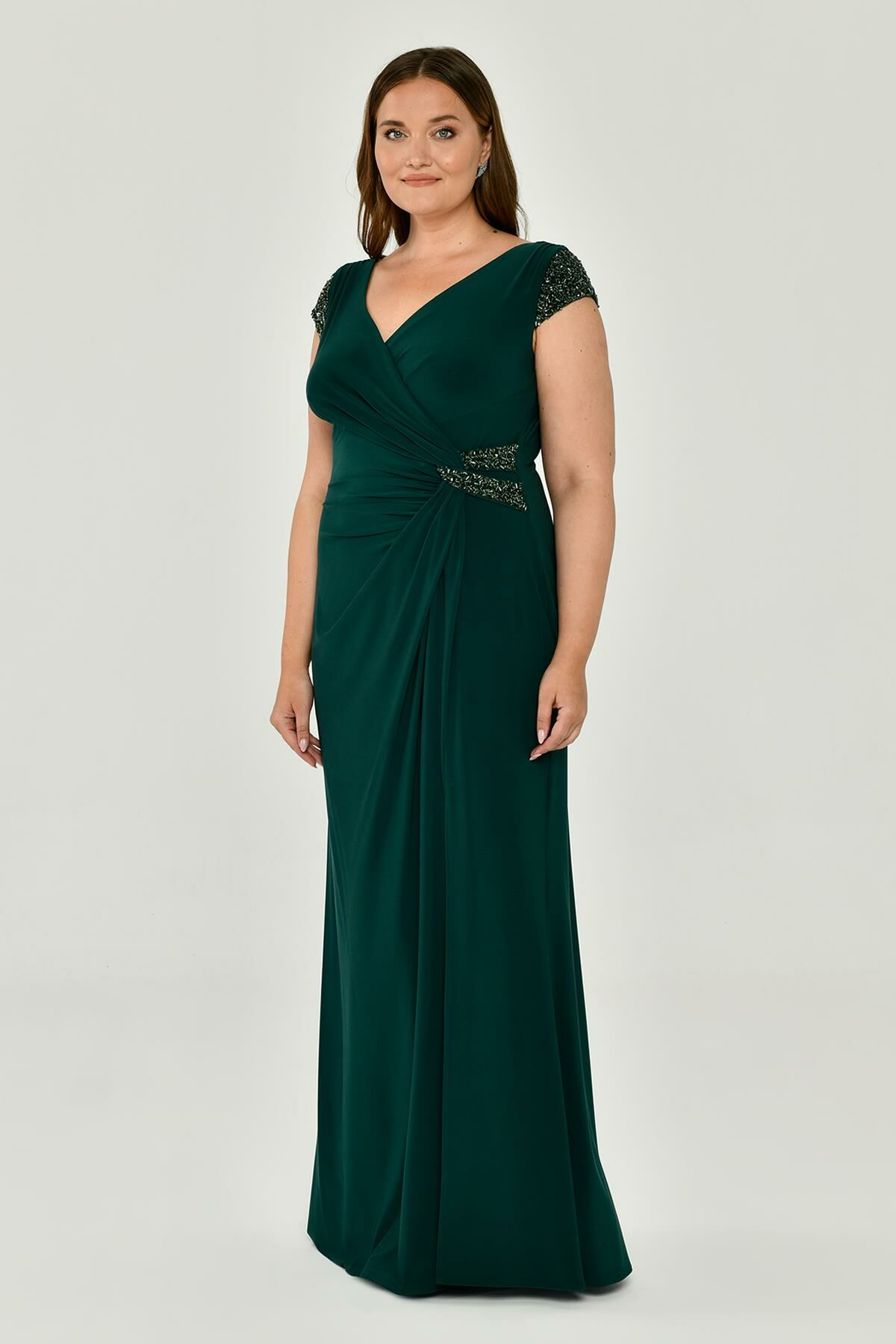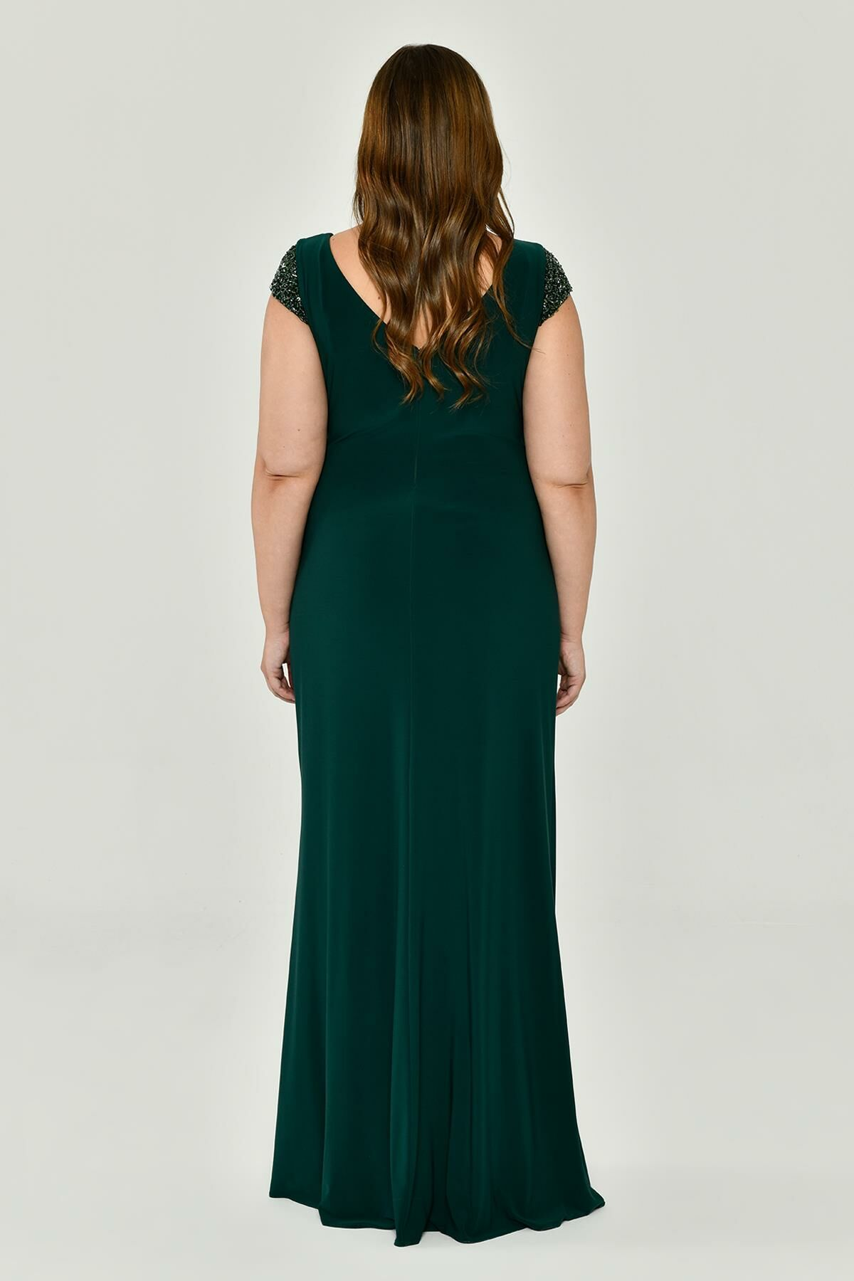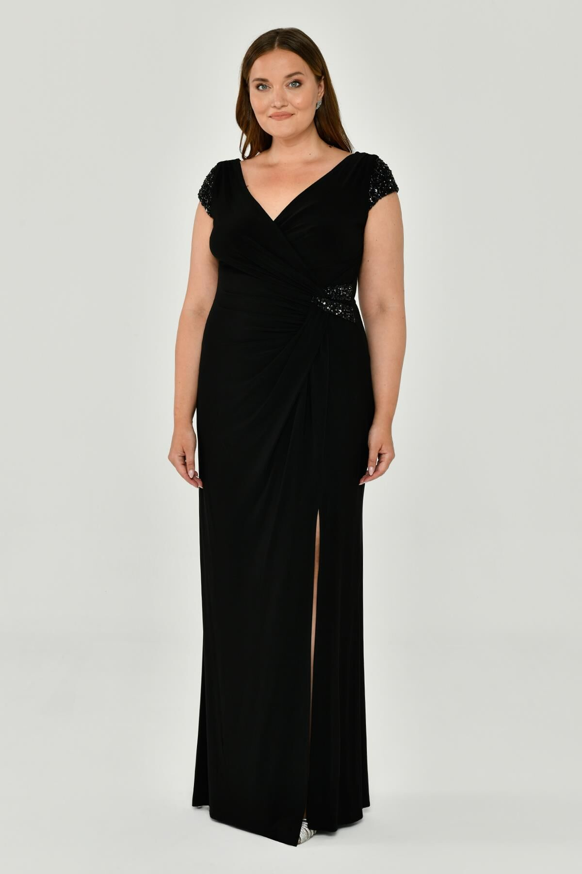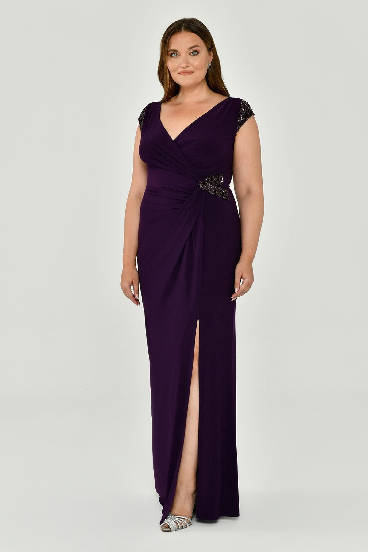 V Yaka Kısa Kollu Aksesuarlı Yırtmaçlı Uzun Abiye Elbise Alfabeta