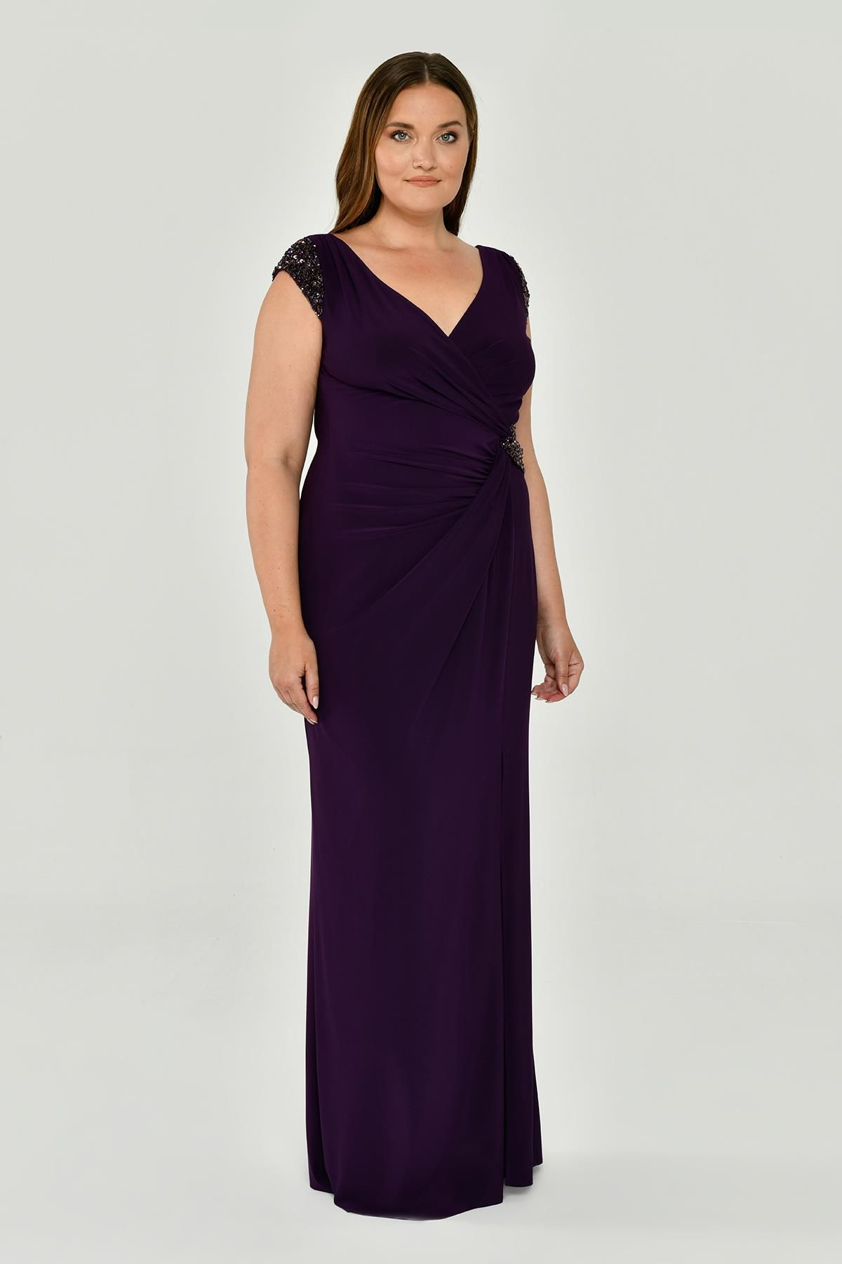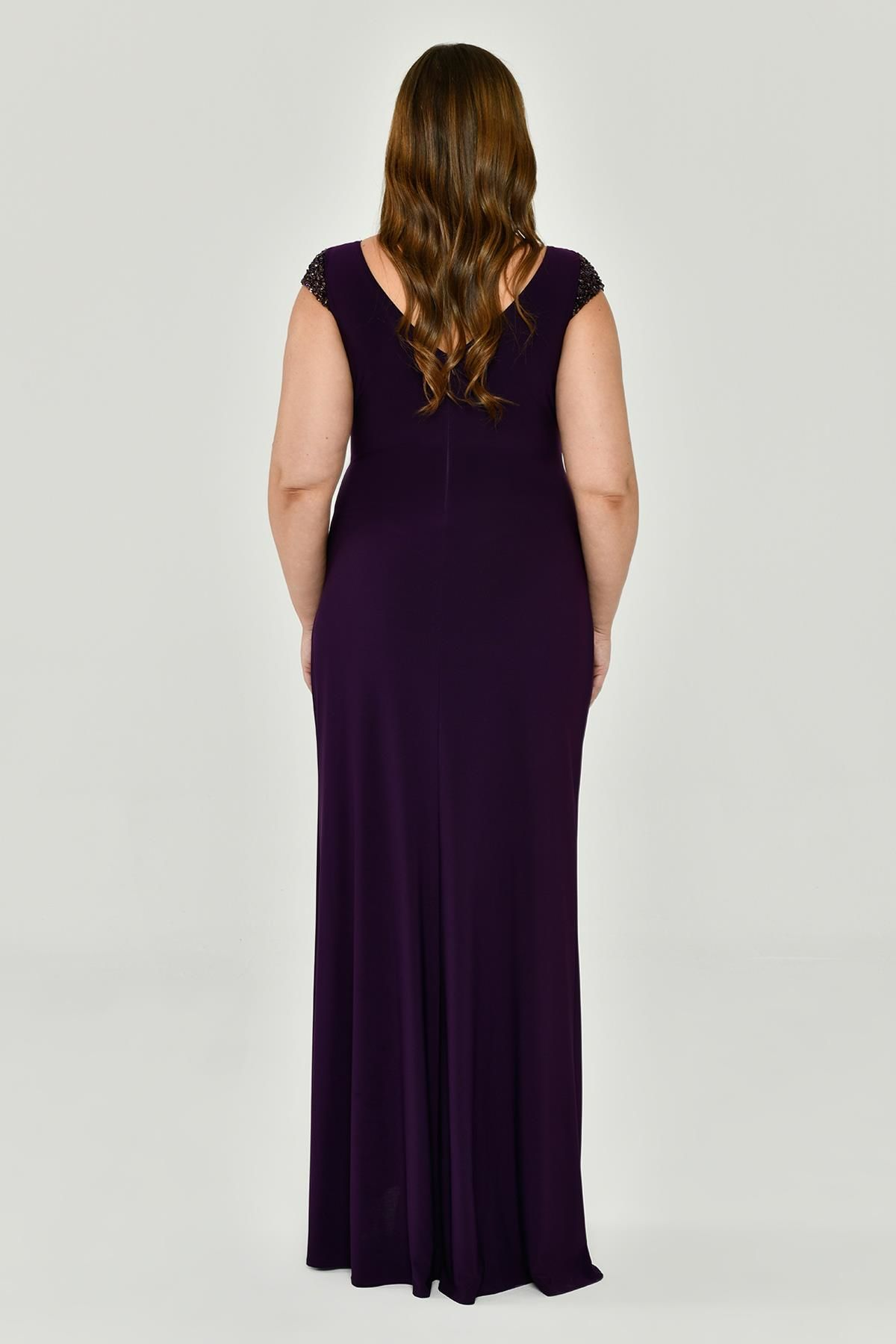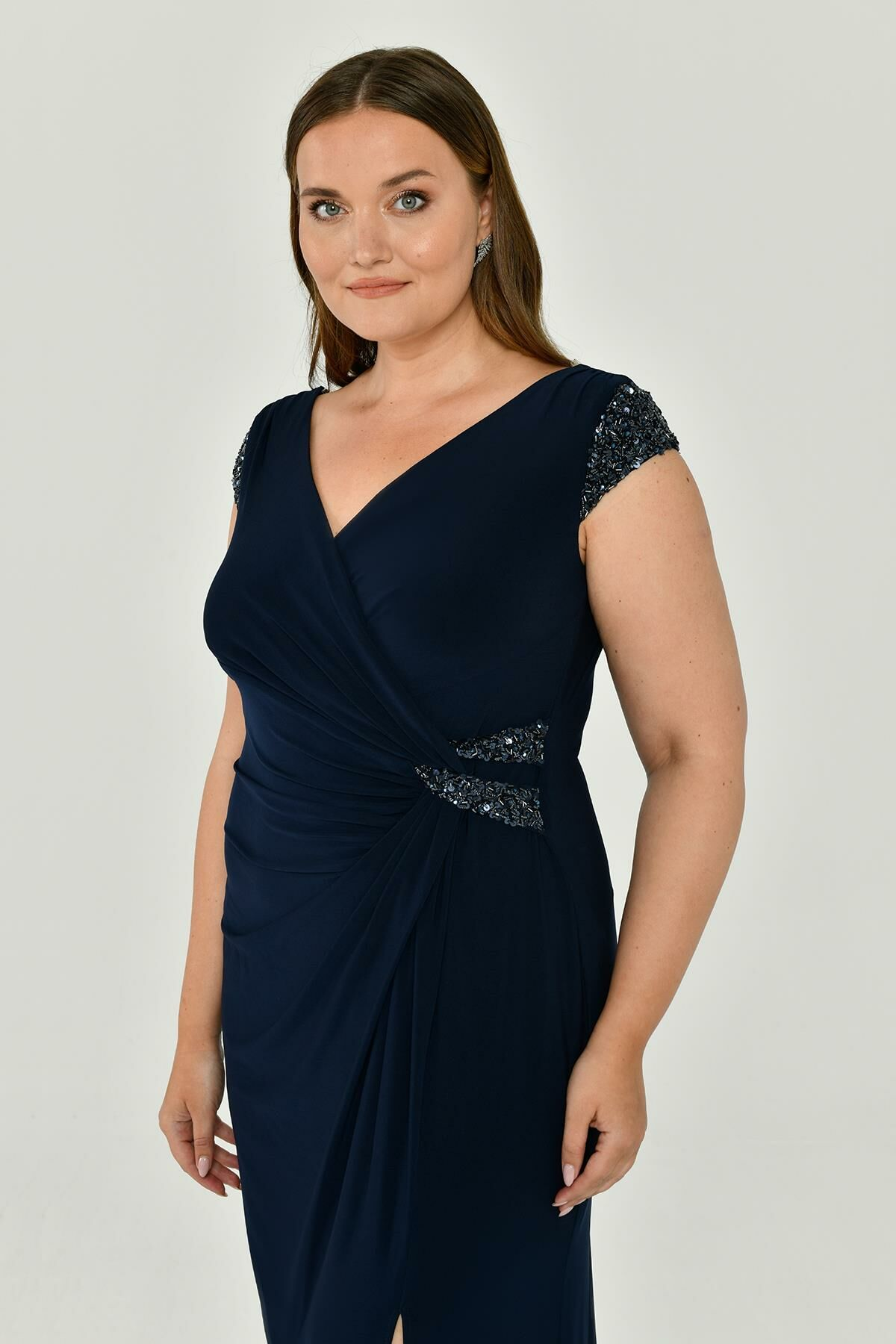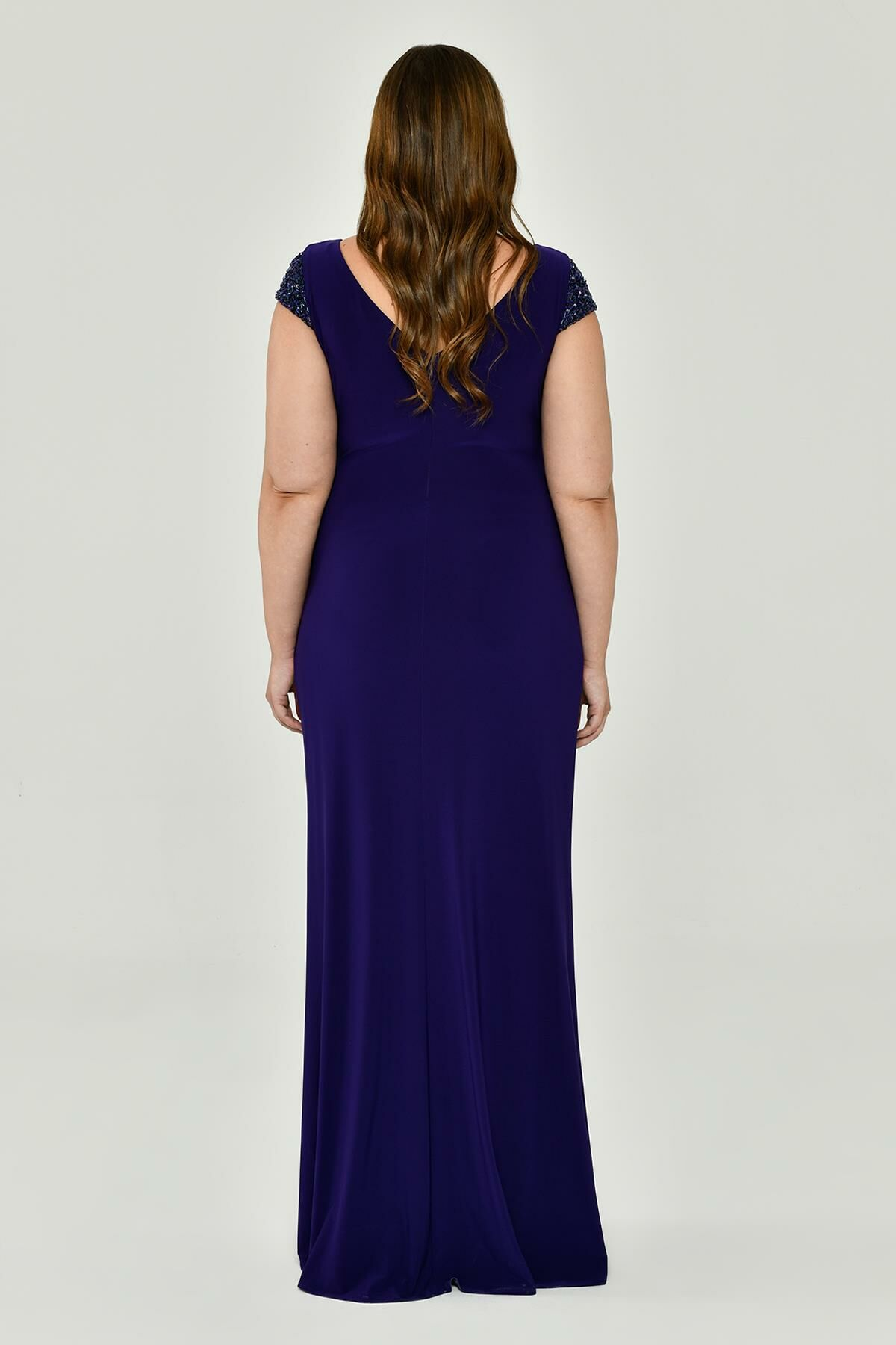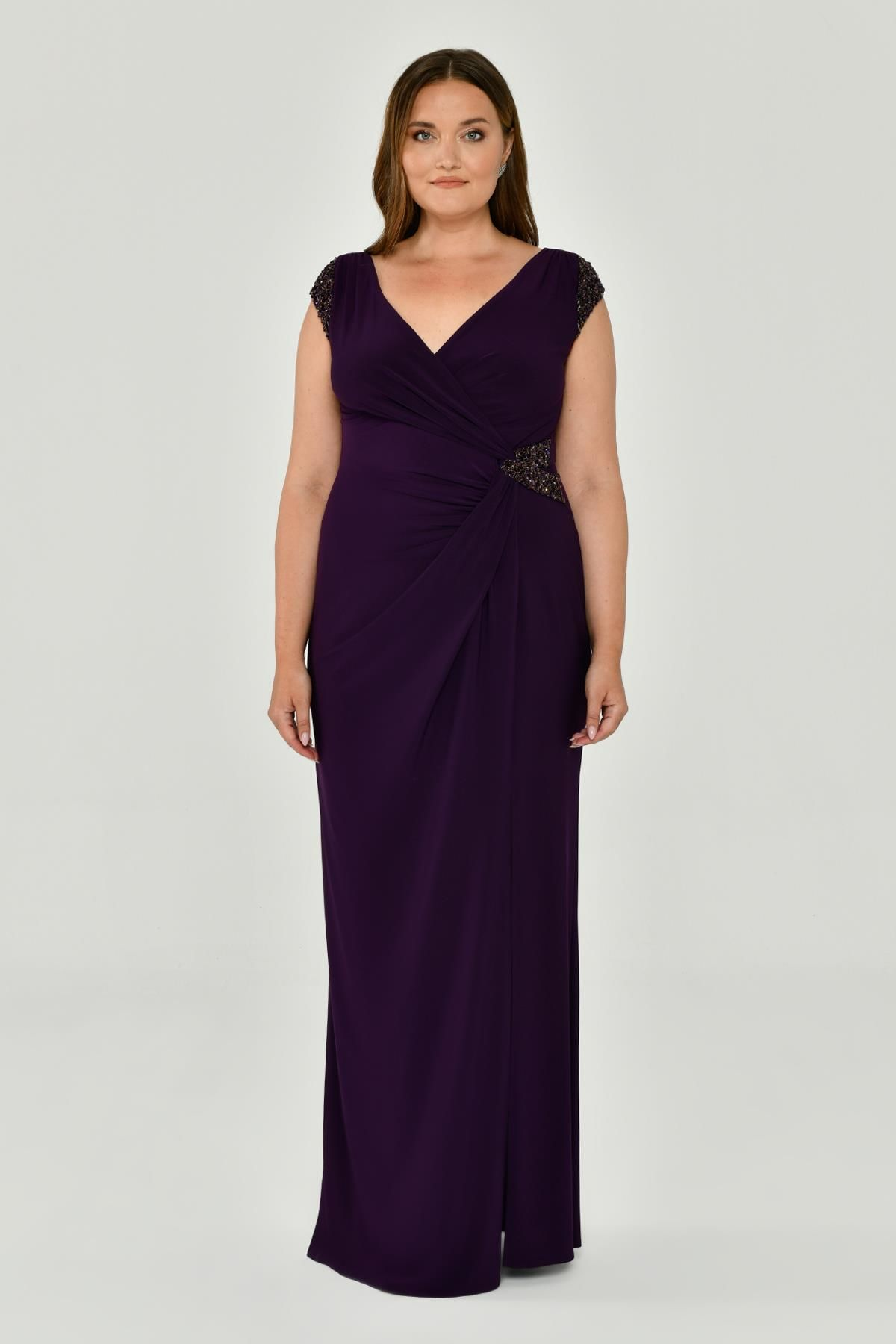 V Yaka Kısa Kollu Aksesuarlı Yırtmaçlı Uzun Abiye Elbise Alfabeta