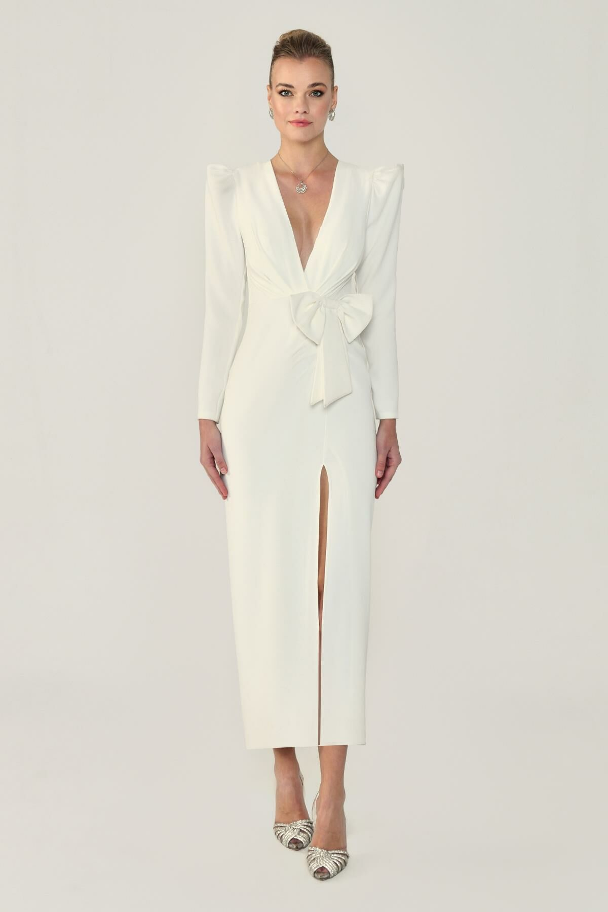 V Yaka Uzun Kollu Yırtmaçlı Uzun Abiye Elbise Alfabeta