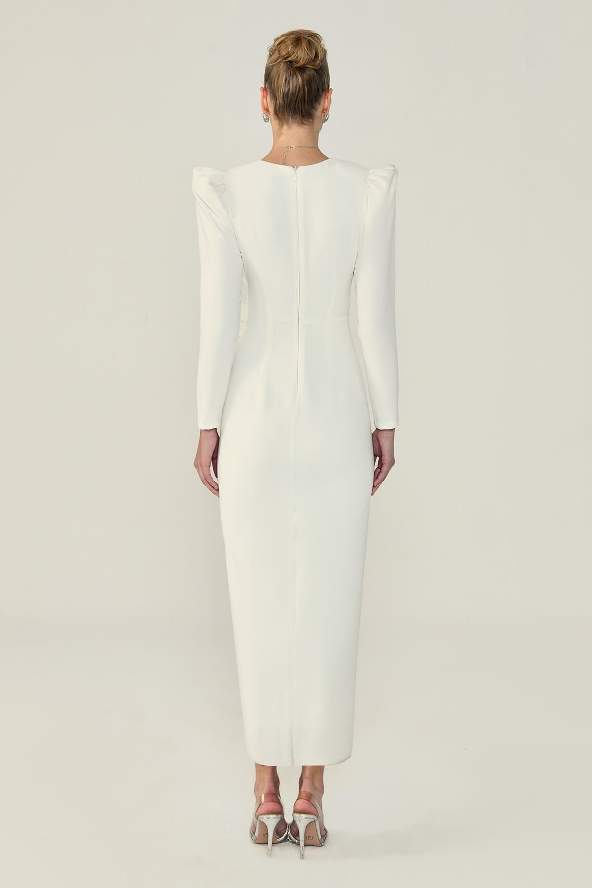 V Yaka Uzun Kollu Yırtmaçlı Uzun Elbise