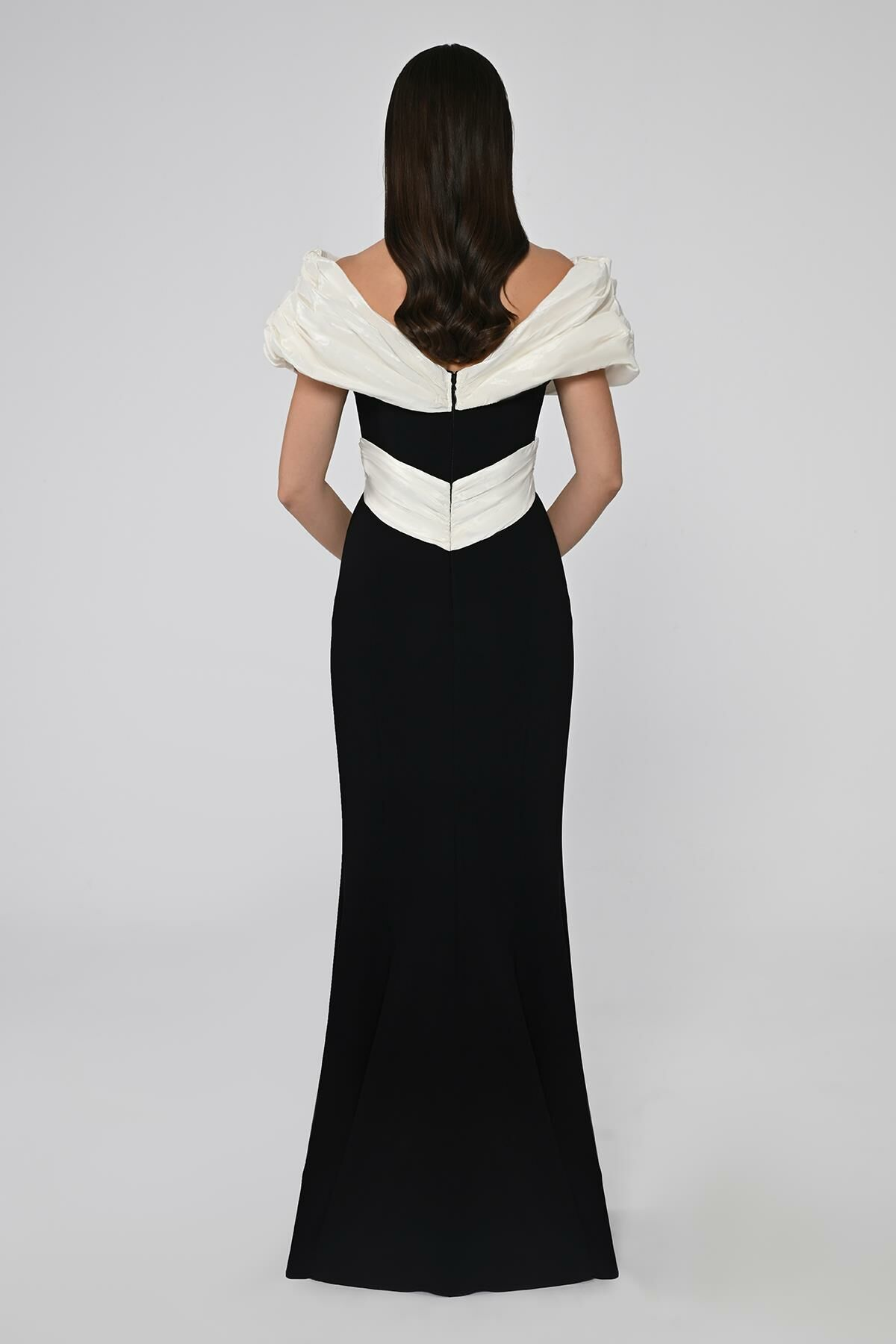 Alfa Beta Düşük Omuz Önden Yırtmaçlı Krep Uzun Elbise Abiye