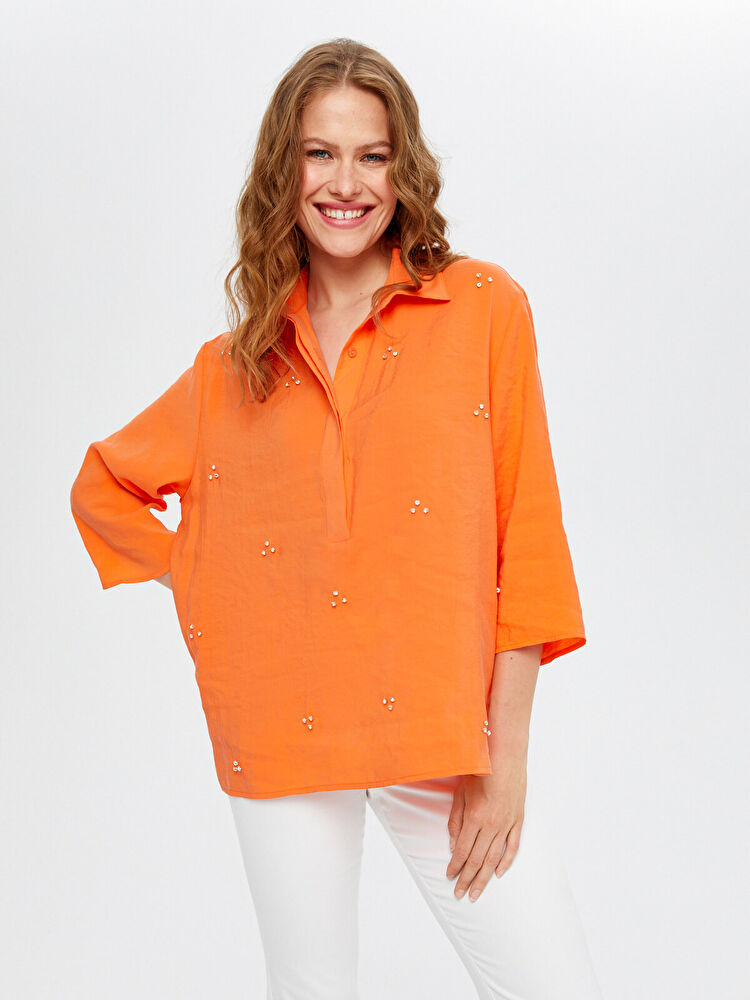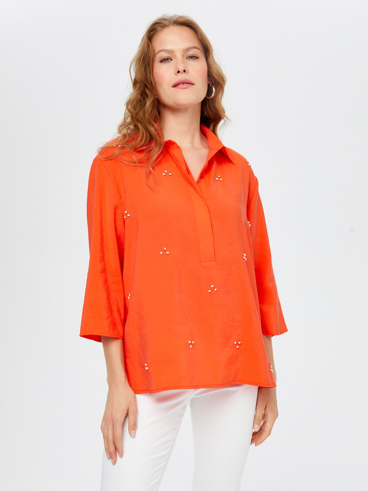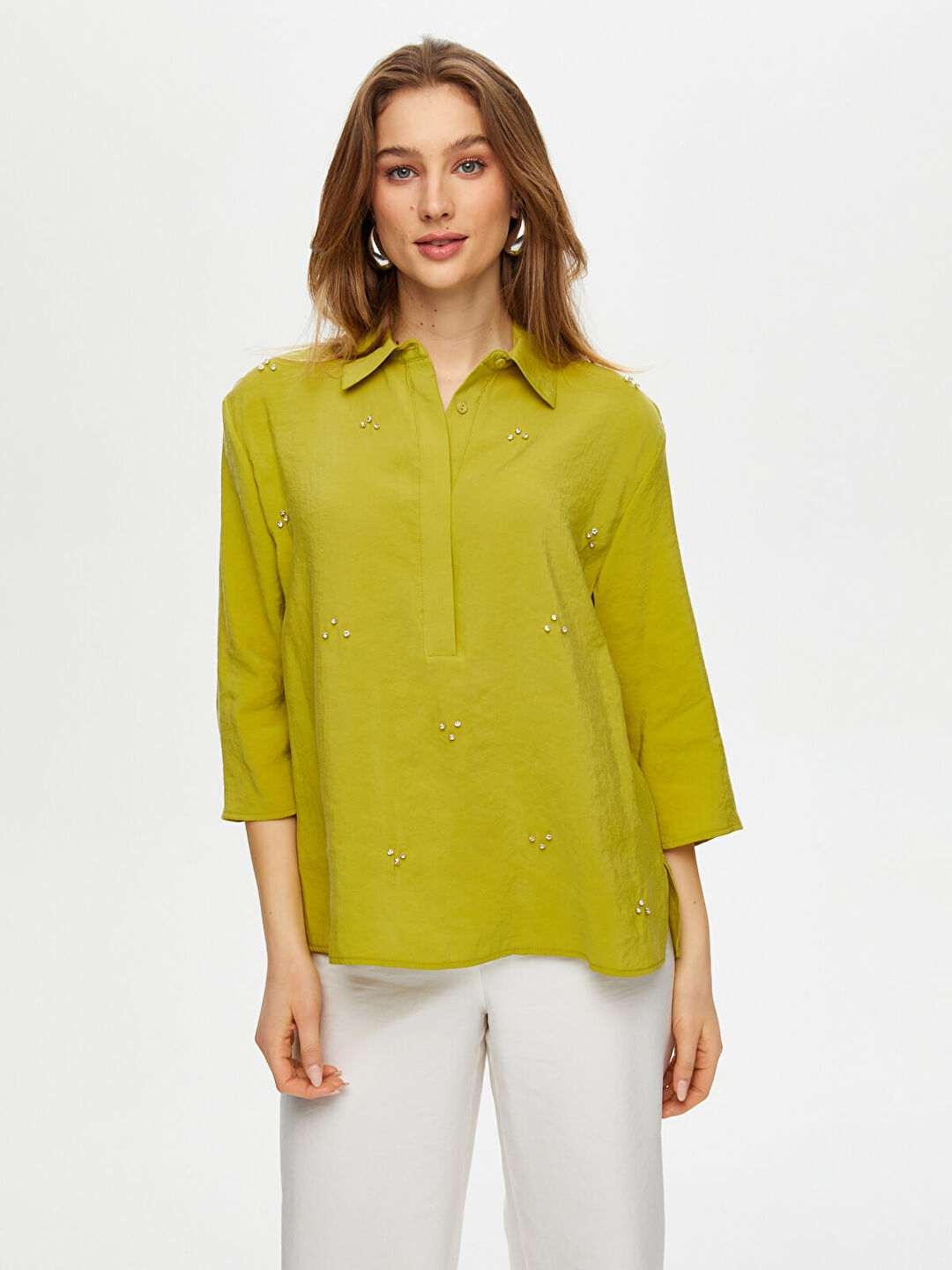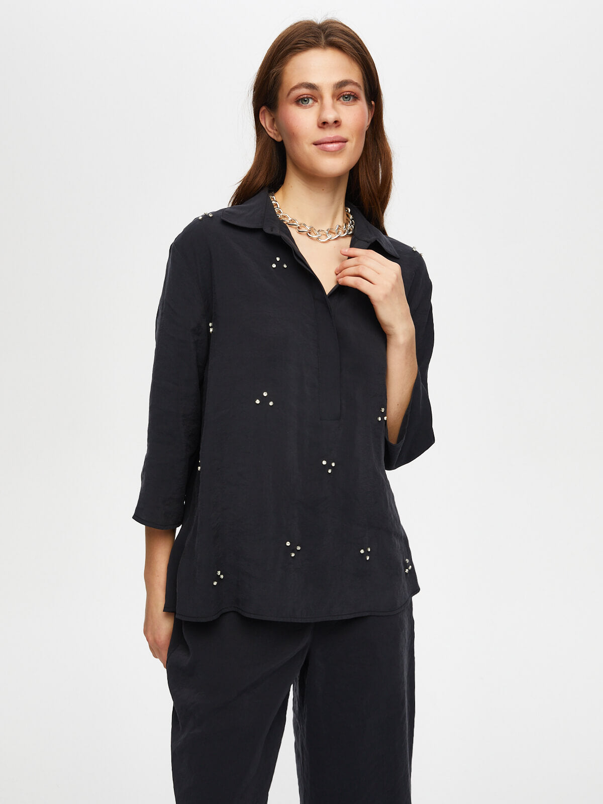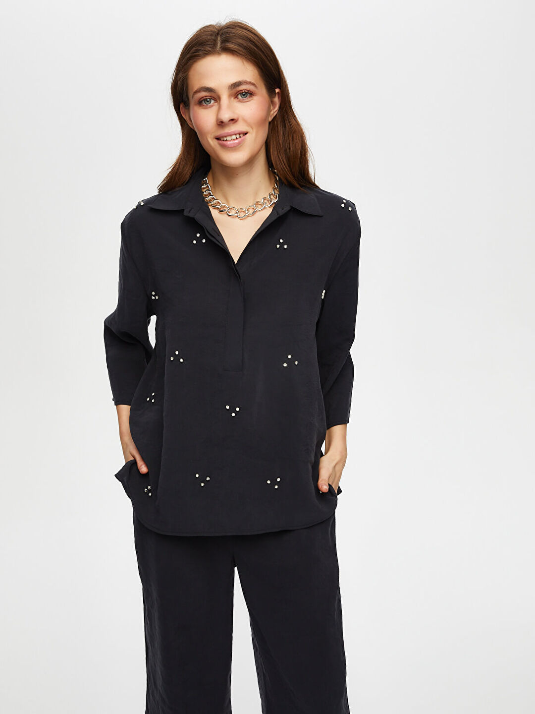 Bluz Yarım Patlı Taş Detaylı 3/4 Kol Modallı Bluz Faik Sönmez
