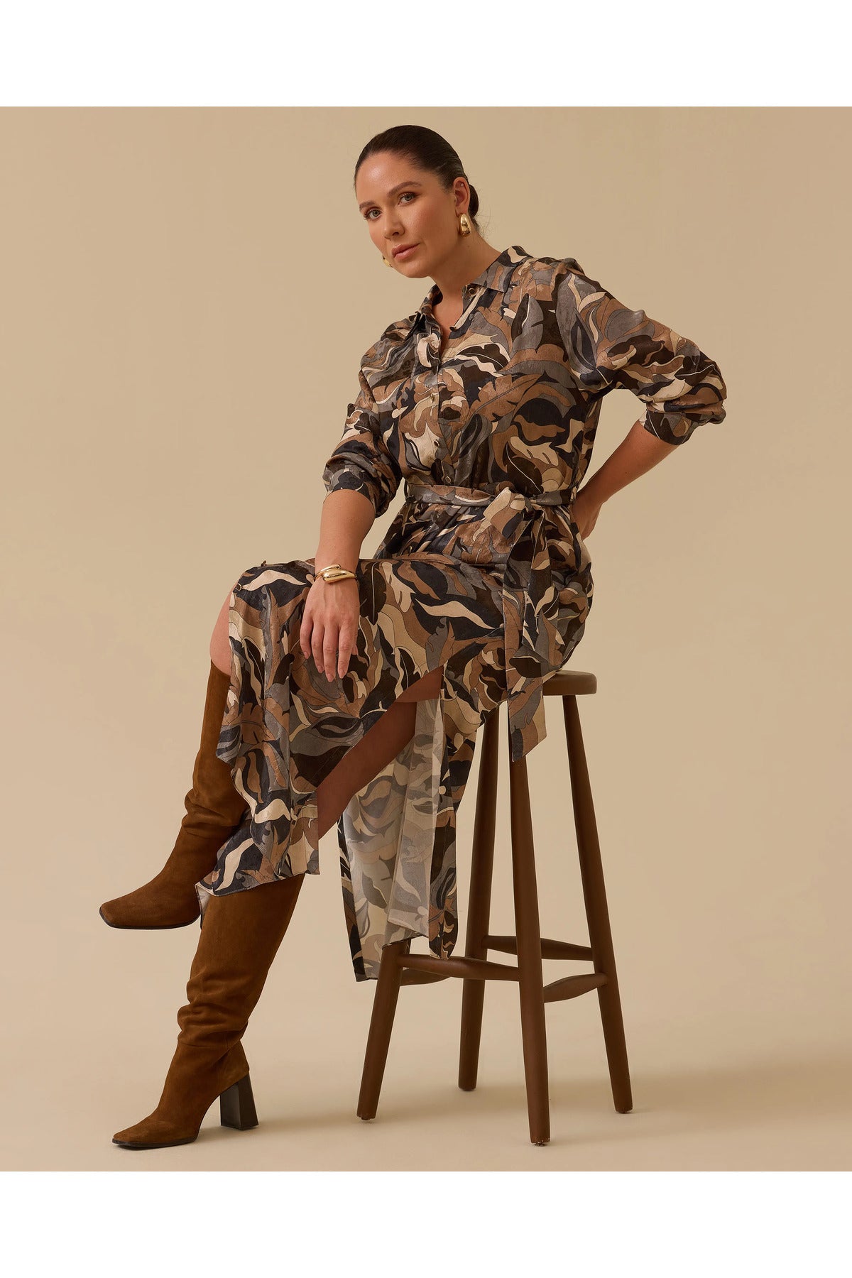 Büyük Beden Desenli Kuşaklı Jakar Elbise Gala-Xi