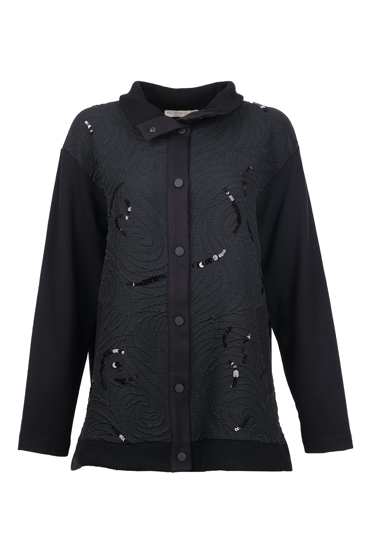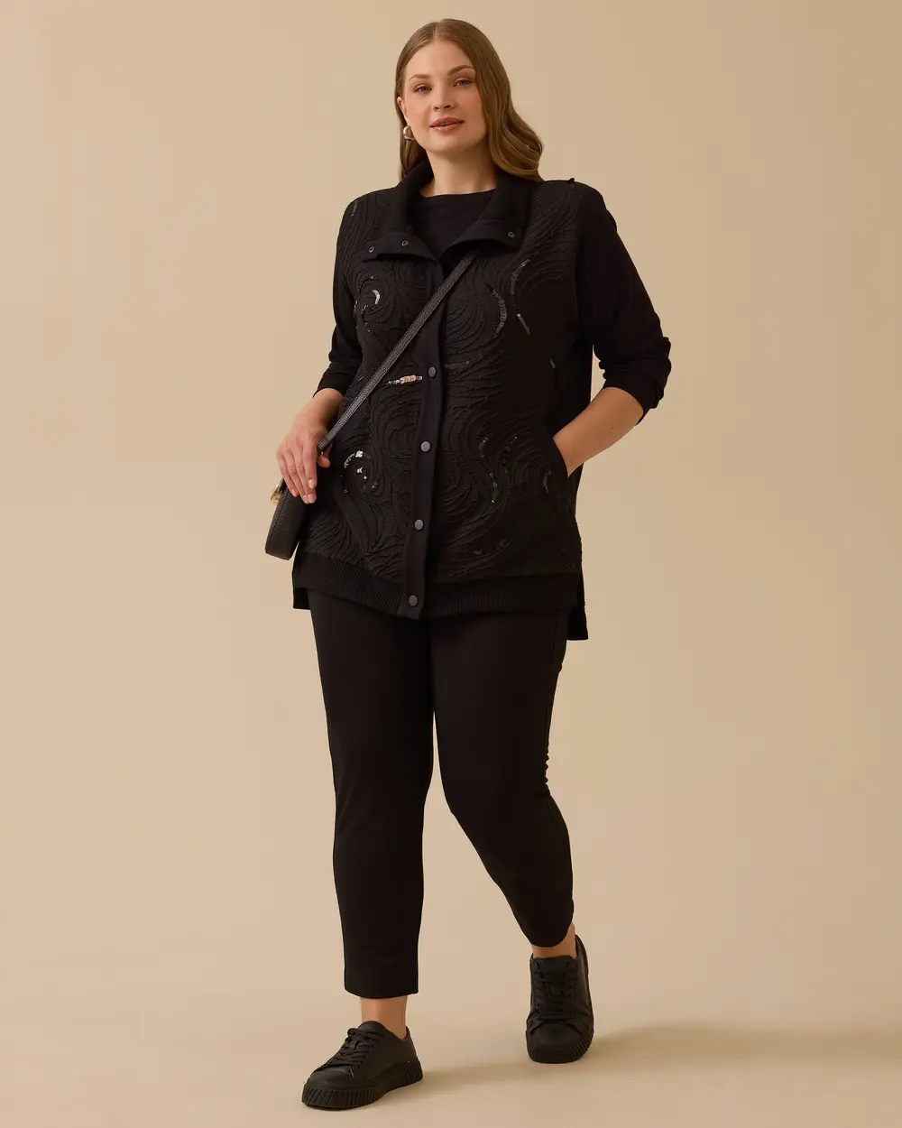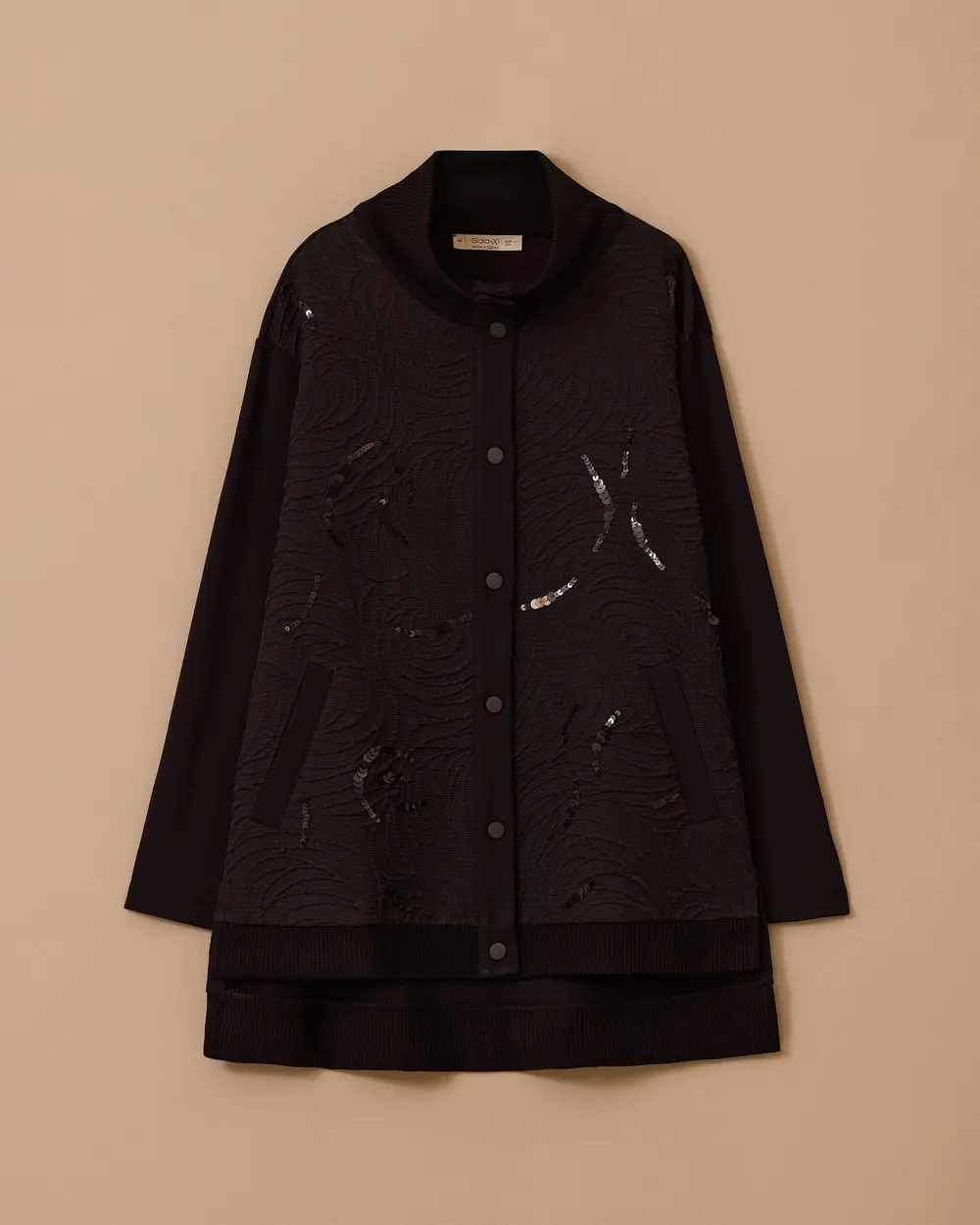 Büyük Beden Pul Detaylı İşlemeli Ceket, rahat kalıbı ve desenli yüzeyiyle günlük kullanıma uygun.