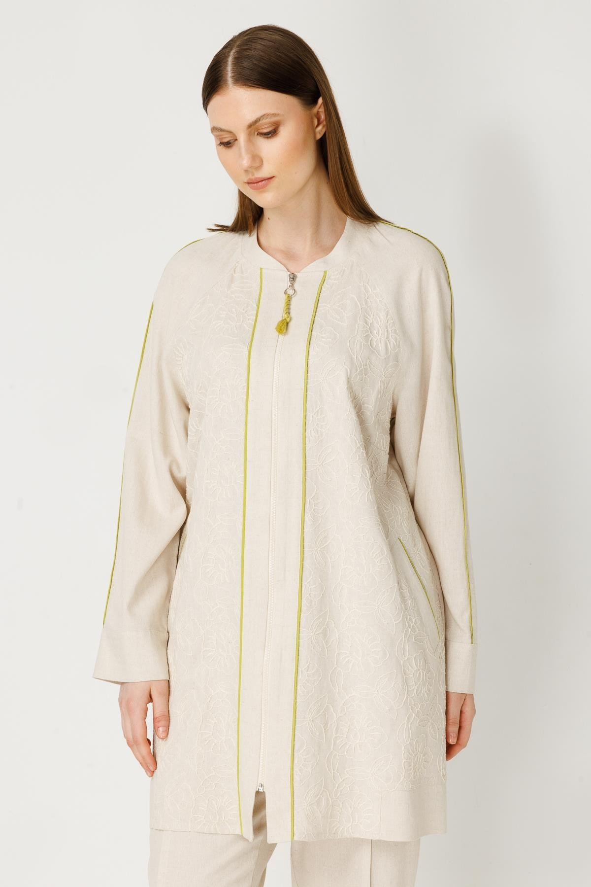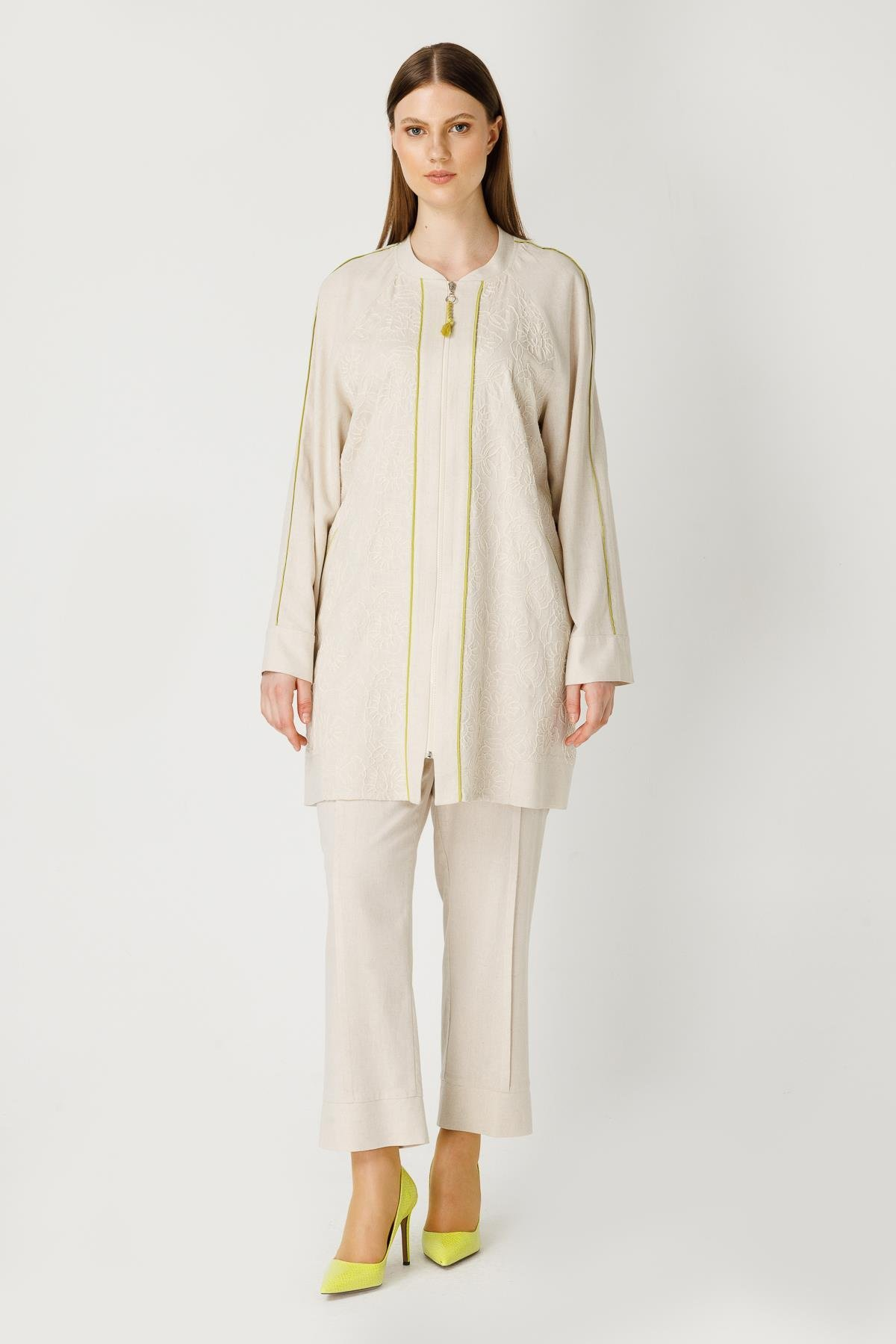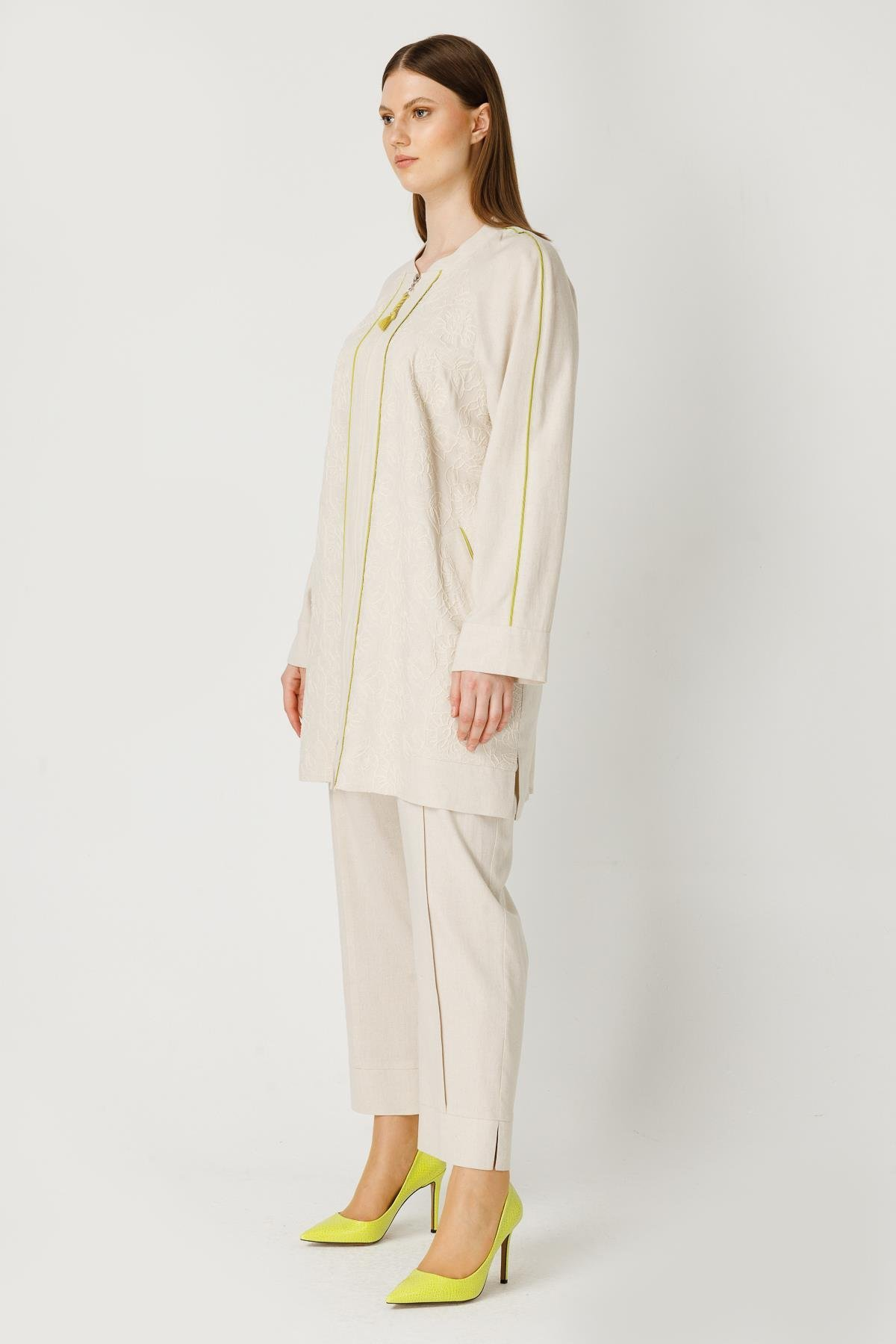 Ürün Açıklaması : Doğal içerik dokuma keten kumaş takım modelimizin, Arka bedeninde tasarım nakış işleme detayı mevcuttur. Ön kapaması fermuarlıdır. Ön formunda desenli kumaş ve renkli biye detayı ile hareketlendirilmiştir.