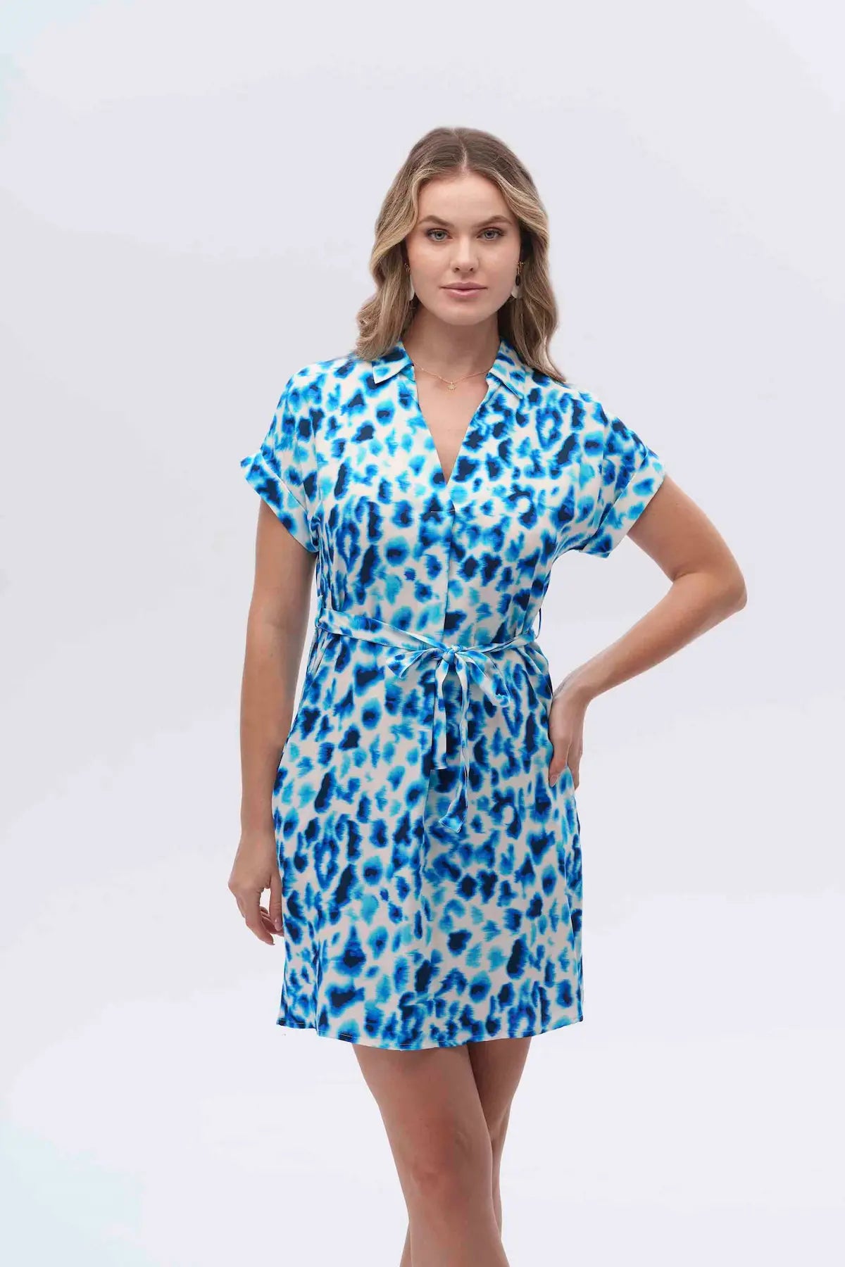 Canel Leopar Desenli Mini Elbise - Kısa Kol Gömlek Yaka Günlük