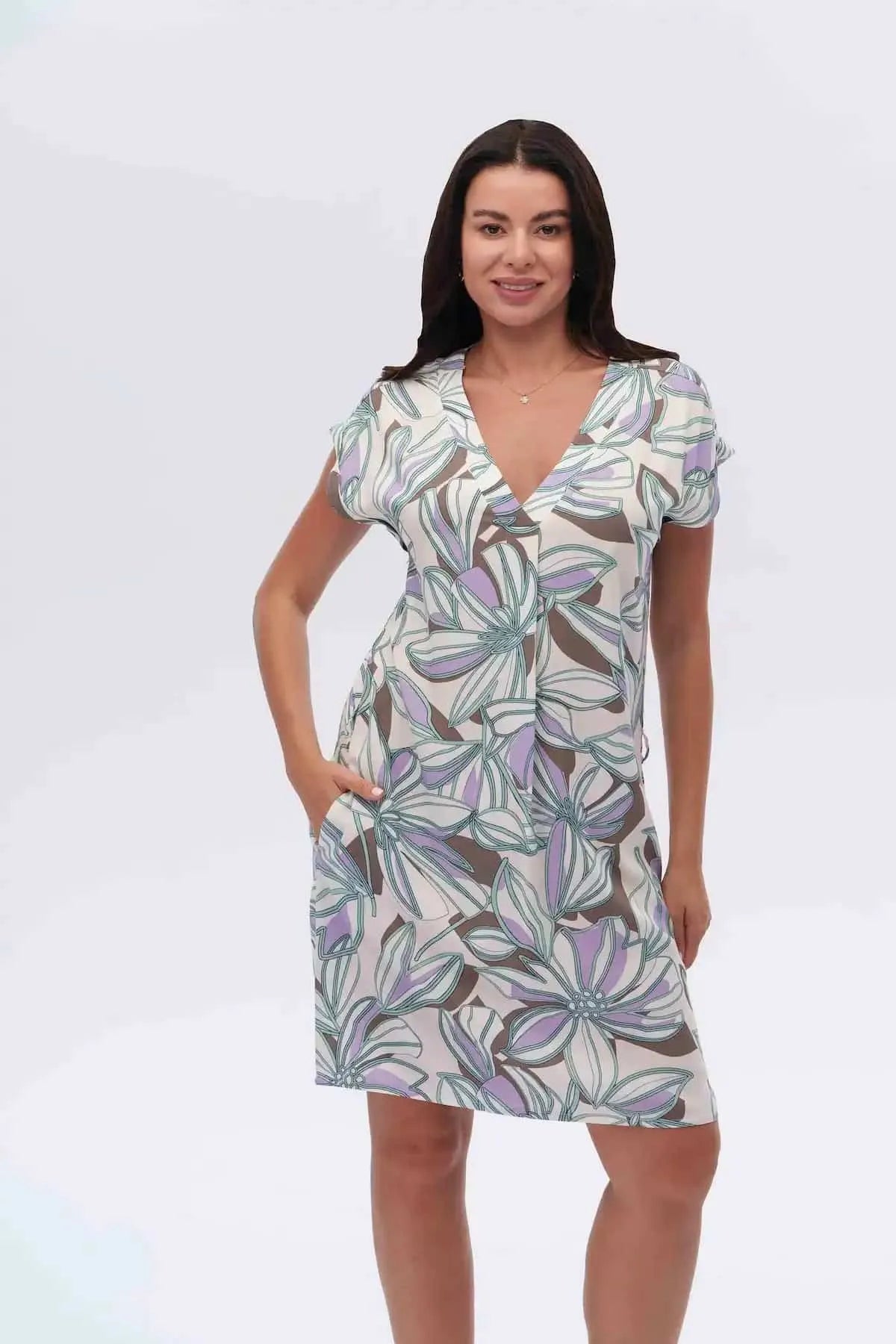 Canel V Yaka Kısa Kol Midi Çiçek Desenli Elbise - Günlük Şık