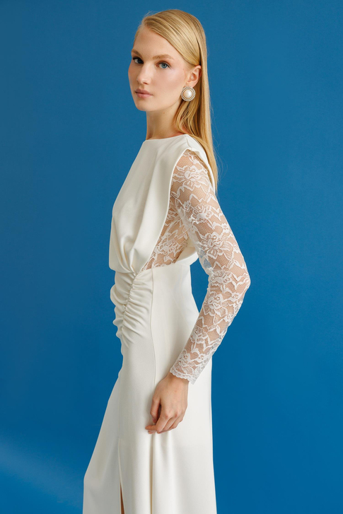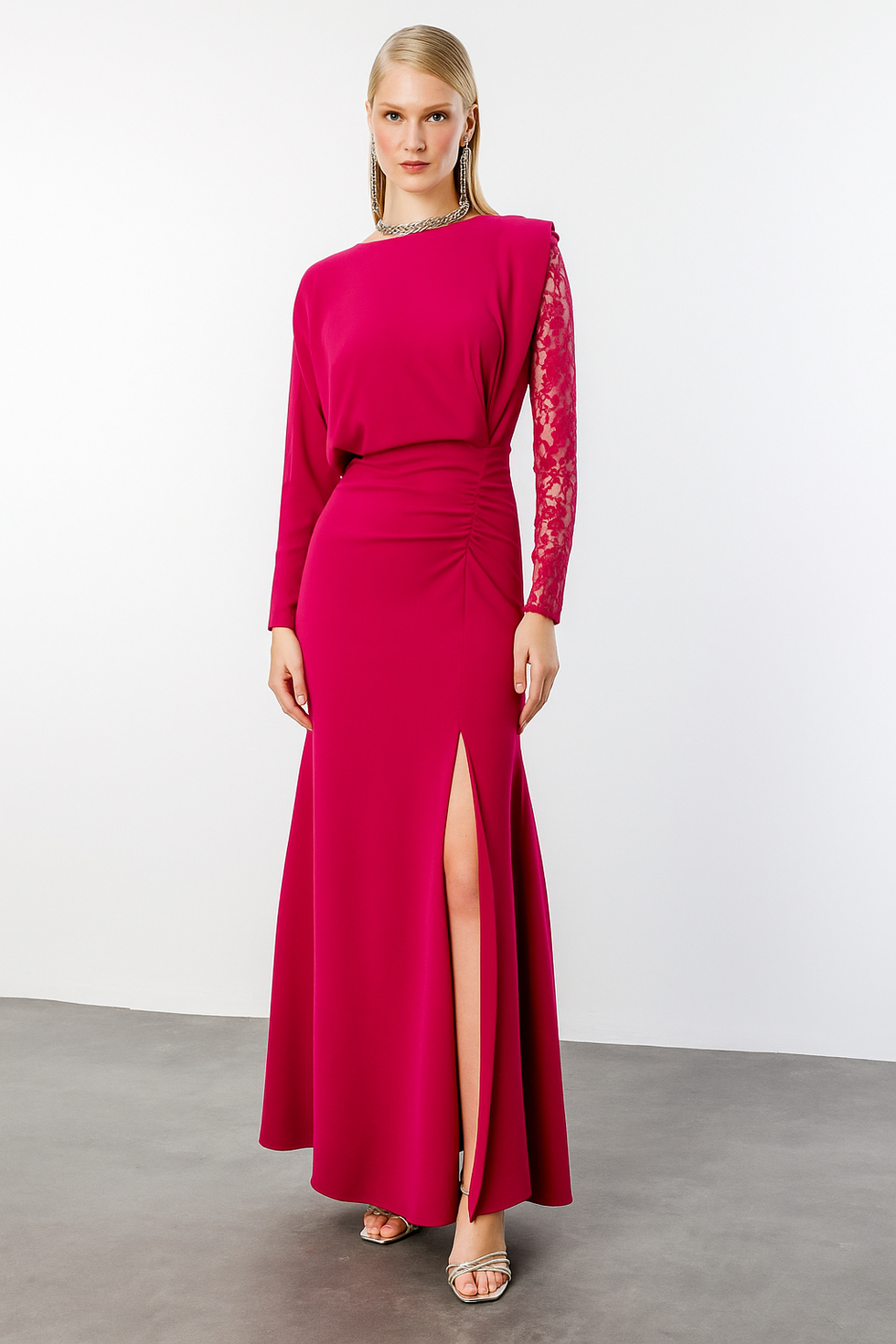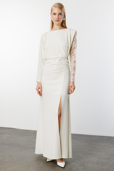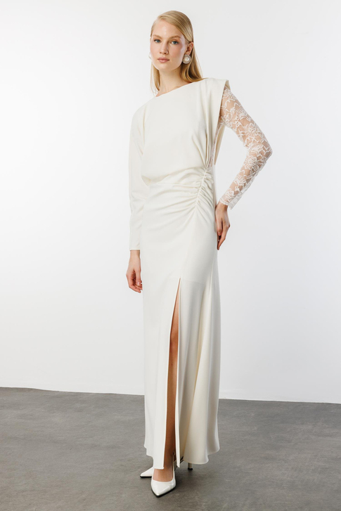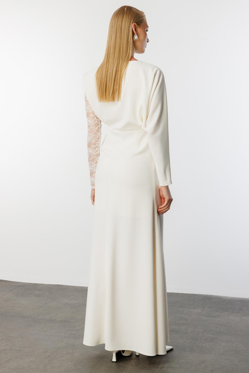 Detay: Tek kolu dantel detaylı, asimetrik kesim, yırtmaç detaylı