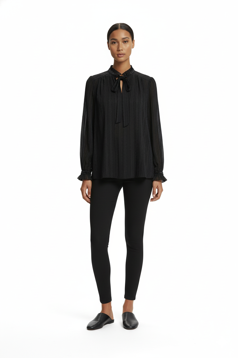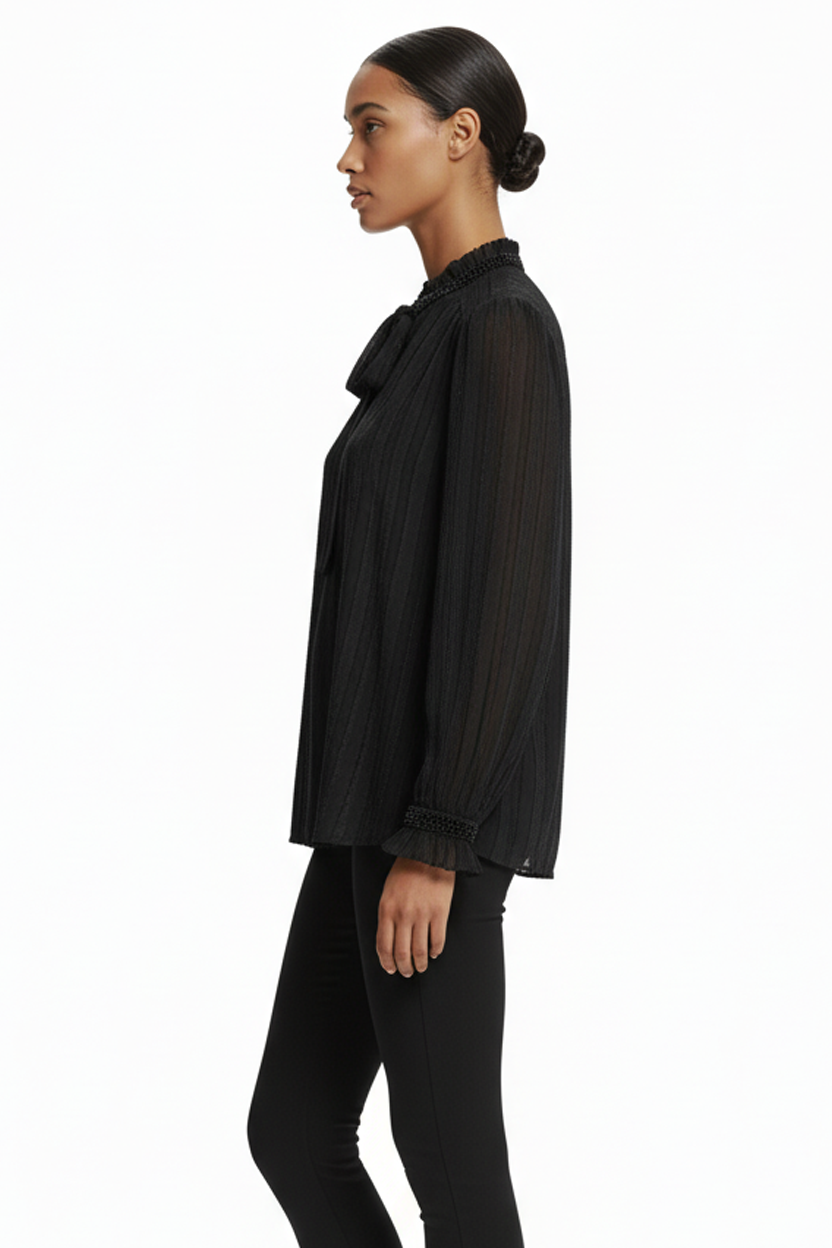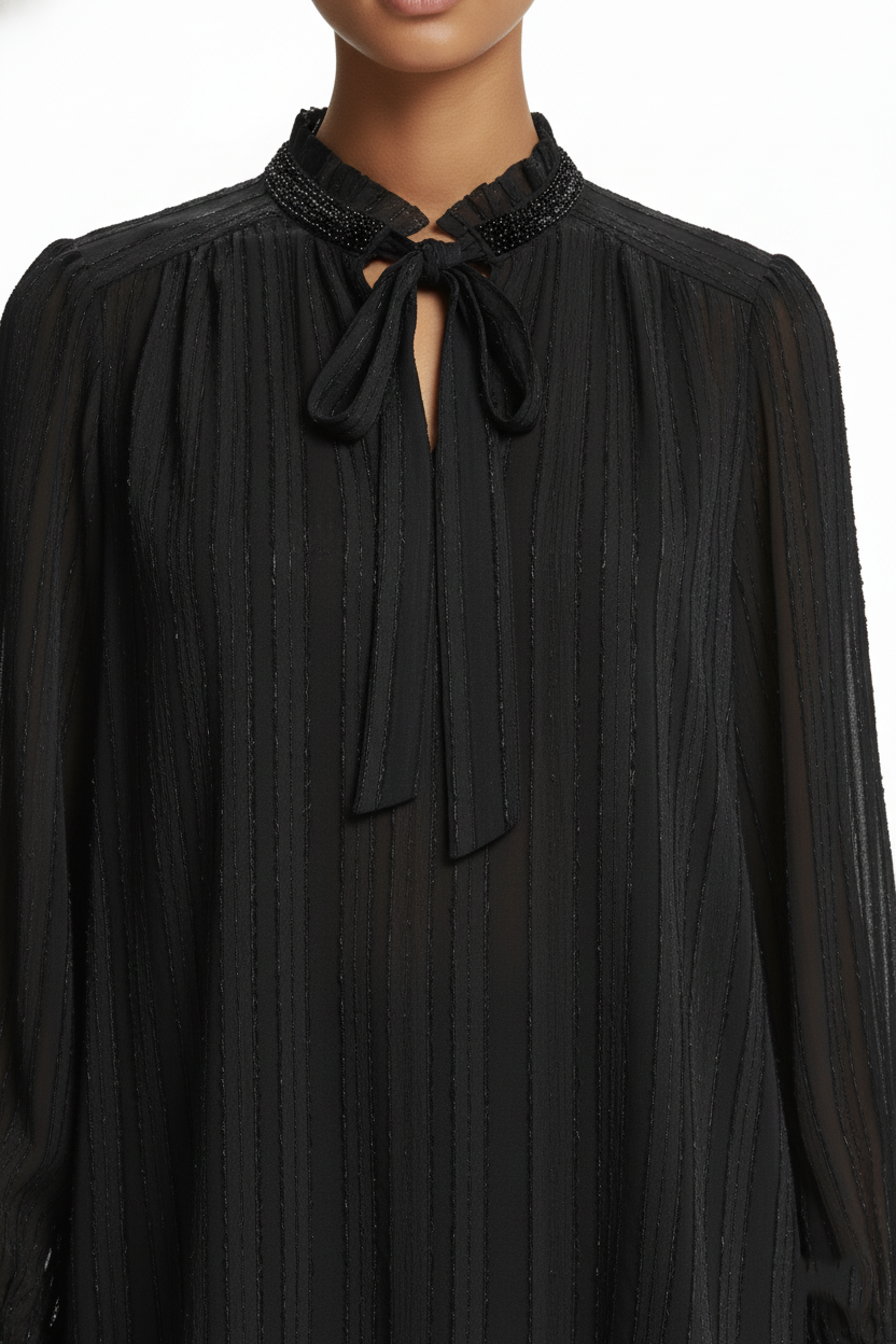 Dokulu Şifon Fular Detaylı Tunik, zarif dokusu ve fular yaka detayıyla modern bir şıklık sunar.
