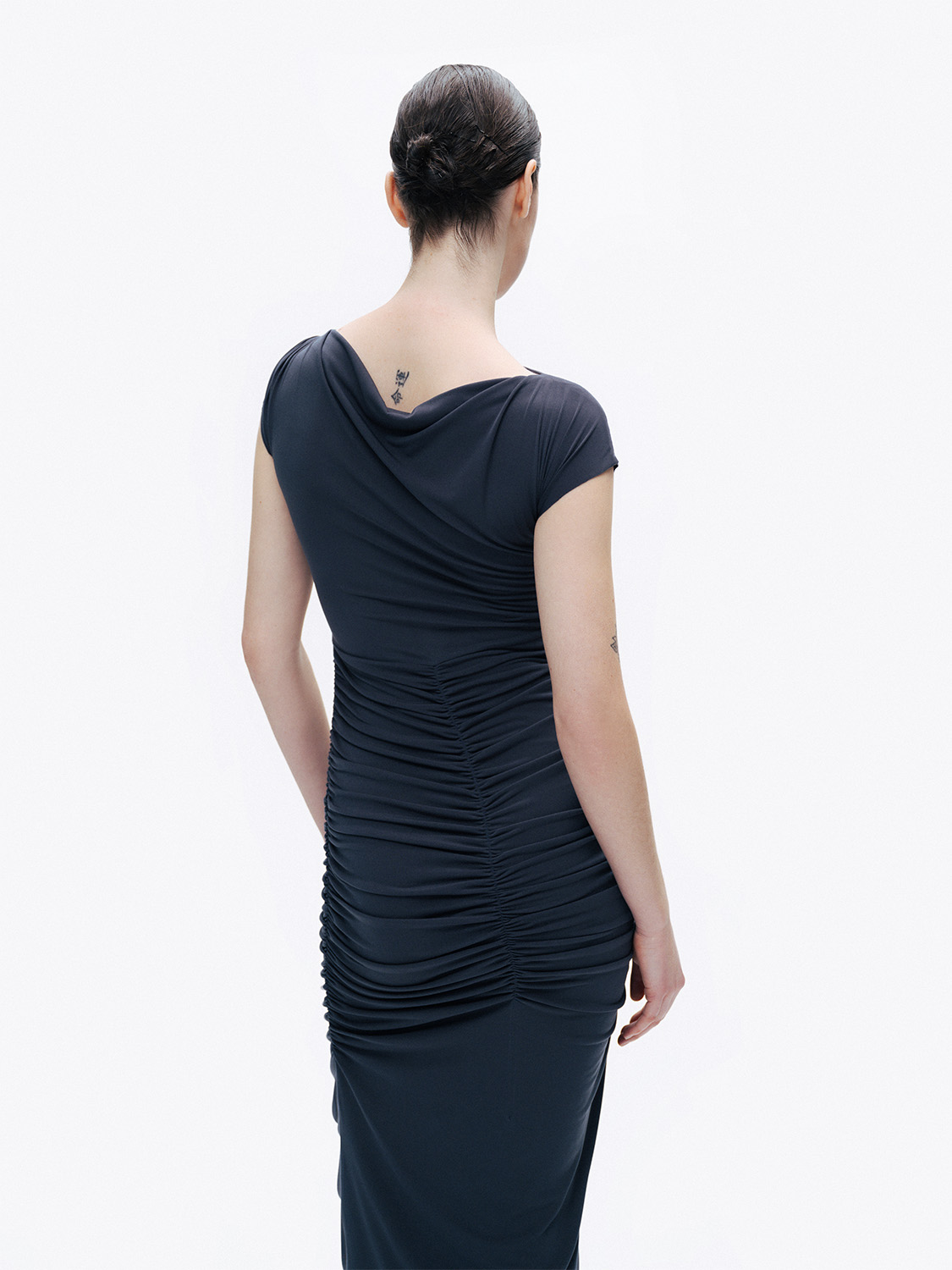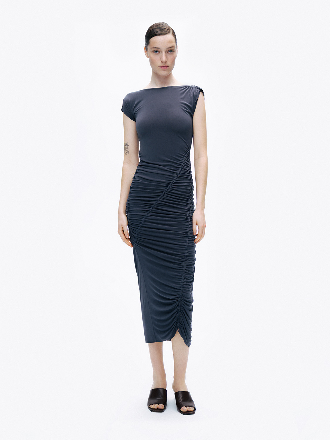 Ürün Açıklaması: Slim fit, tam kalıp, astarsız, bisiklet yaka, drape ve büzgü detaylı maxi boy elbise