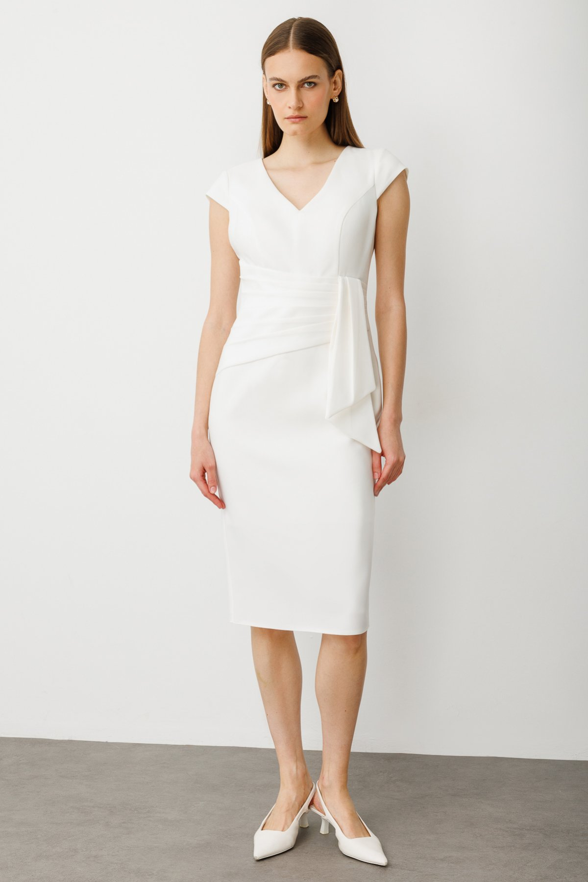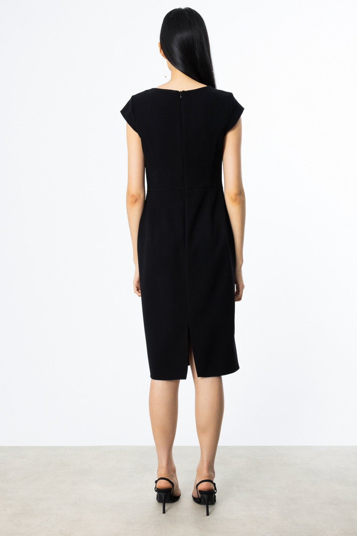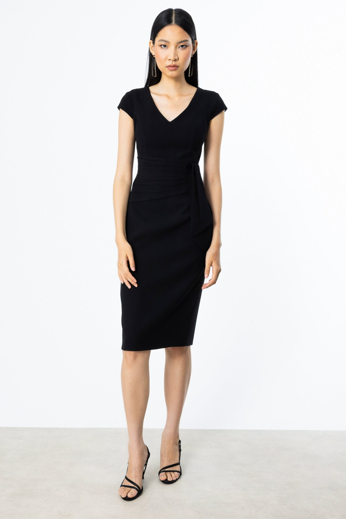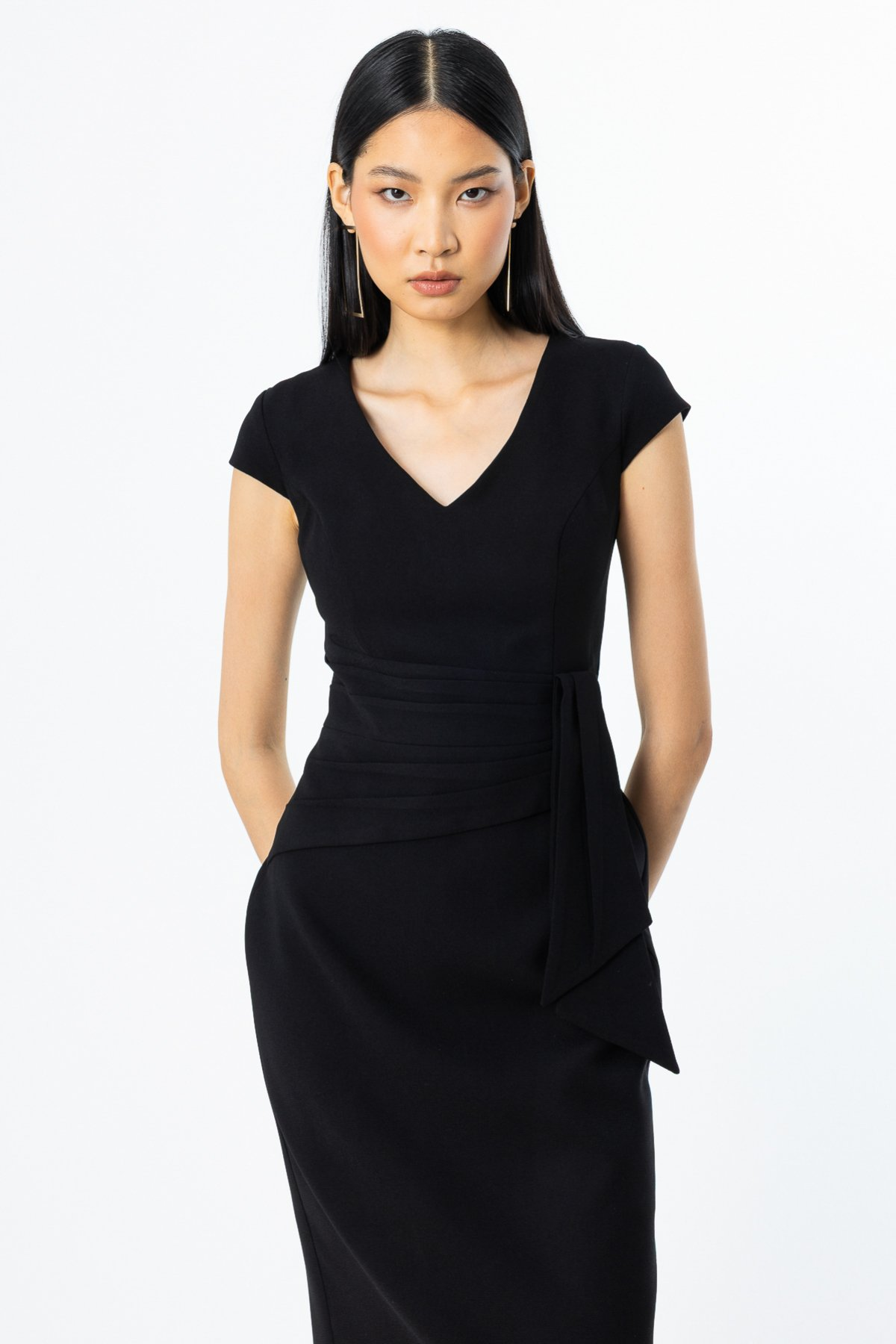 Ürün Özellikleri: V yaka, kolsuz, midi boy, göğsü globlu, beli kuşak detaylı, fermuar kapamalı, arkadan yırtmaç detaylı, astarlı