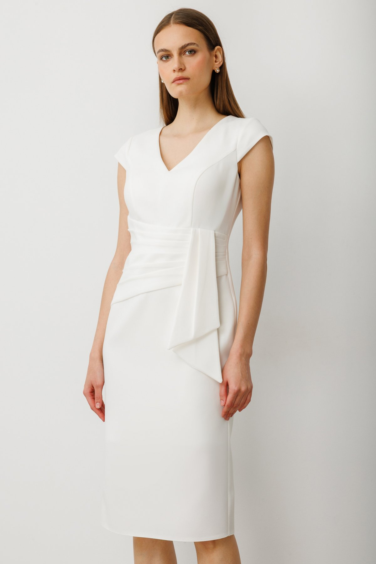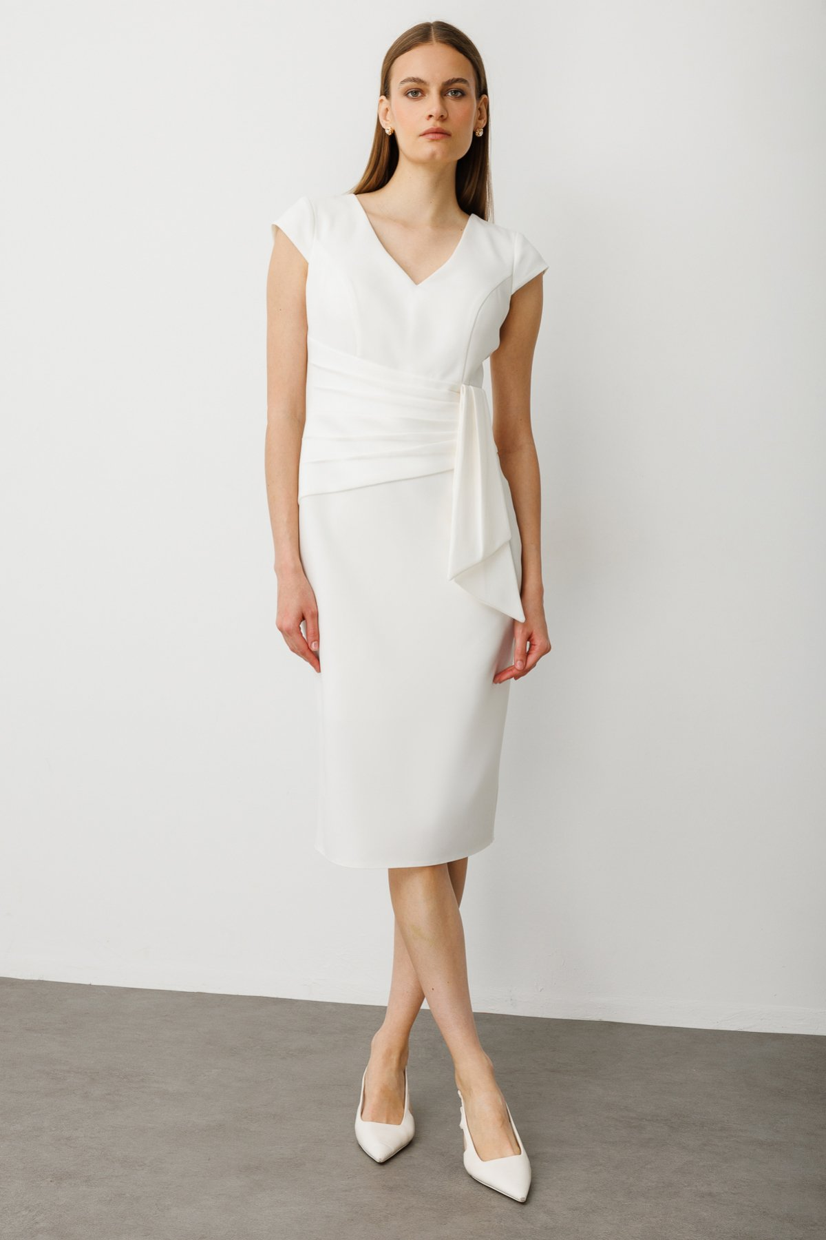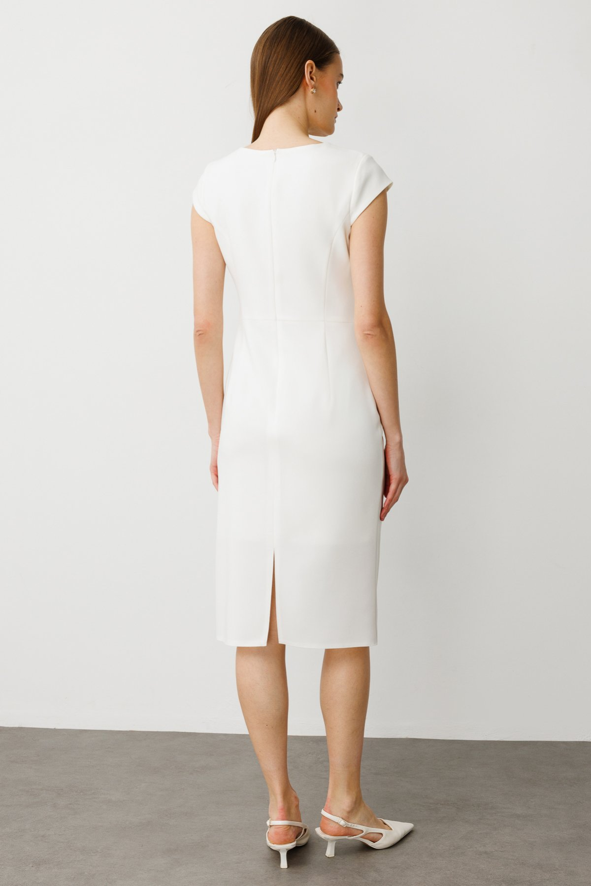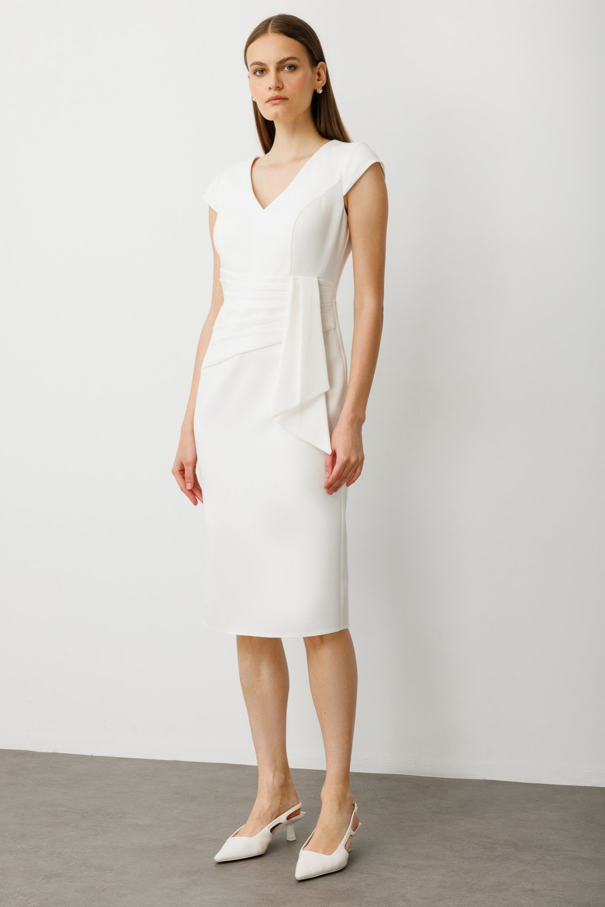 Ürün Özellikleri: V yaka, kolsuz, midi boy, göğsü globlu, beli kuşak detaylı, fermuar kapamalı, arkadan yırtmaç detaylı, astarlı