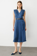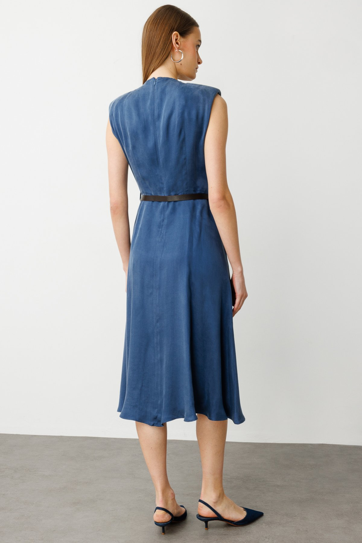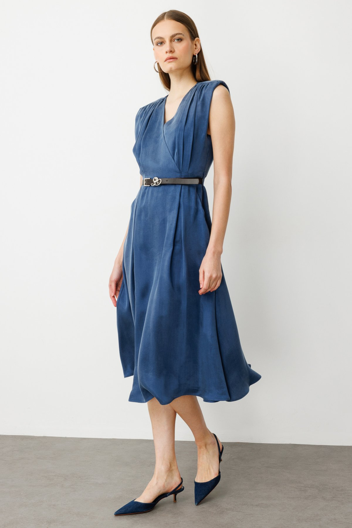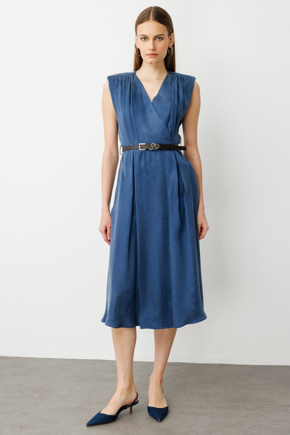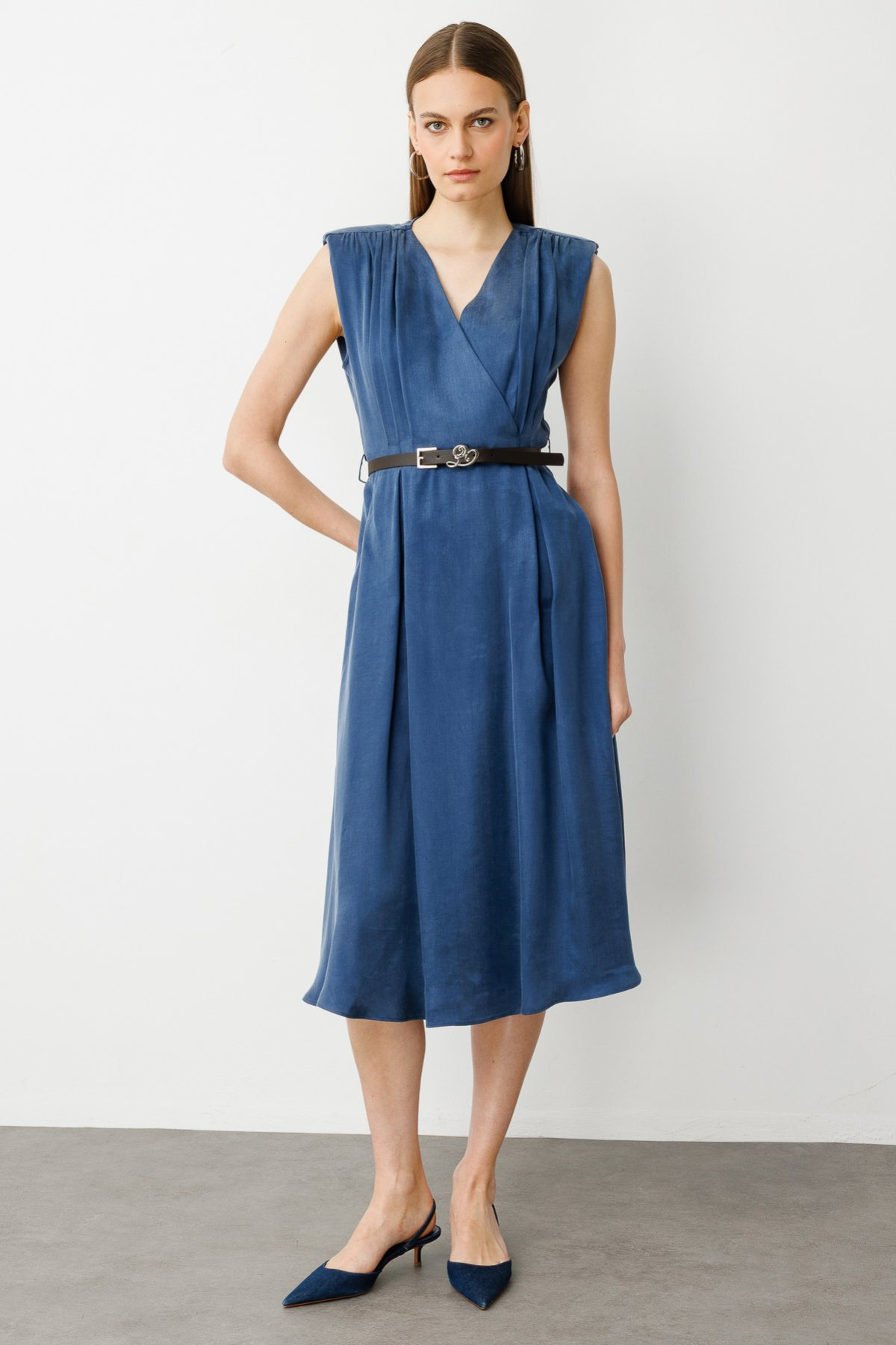 Ürün Özellikleri: Kruvaze kesim, kolsuz, omzu vatkalı, önü drapeli, fermuar kapamalı, astarsız, yan cepli, eteği volanlı, beli kemerli