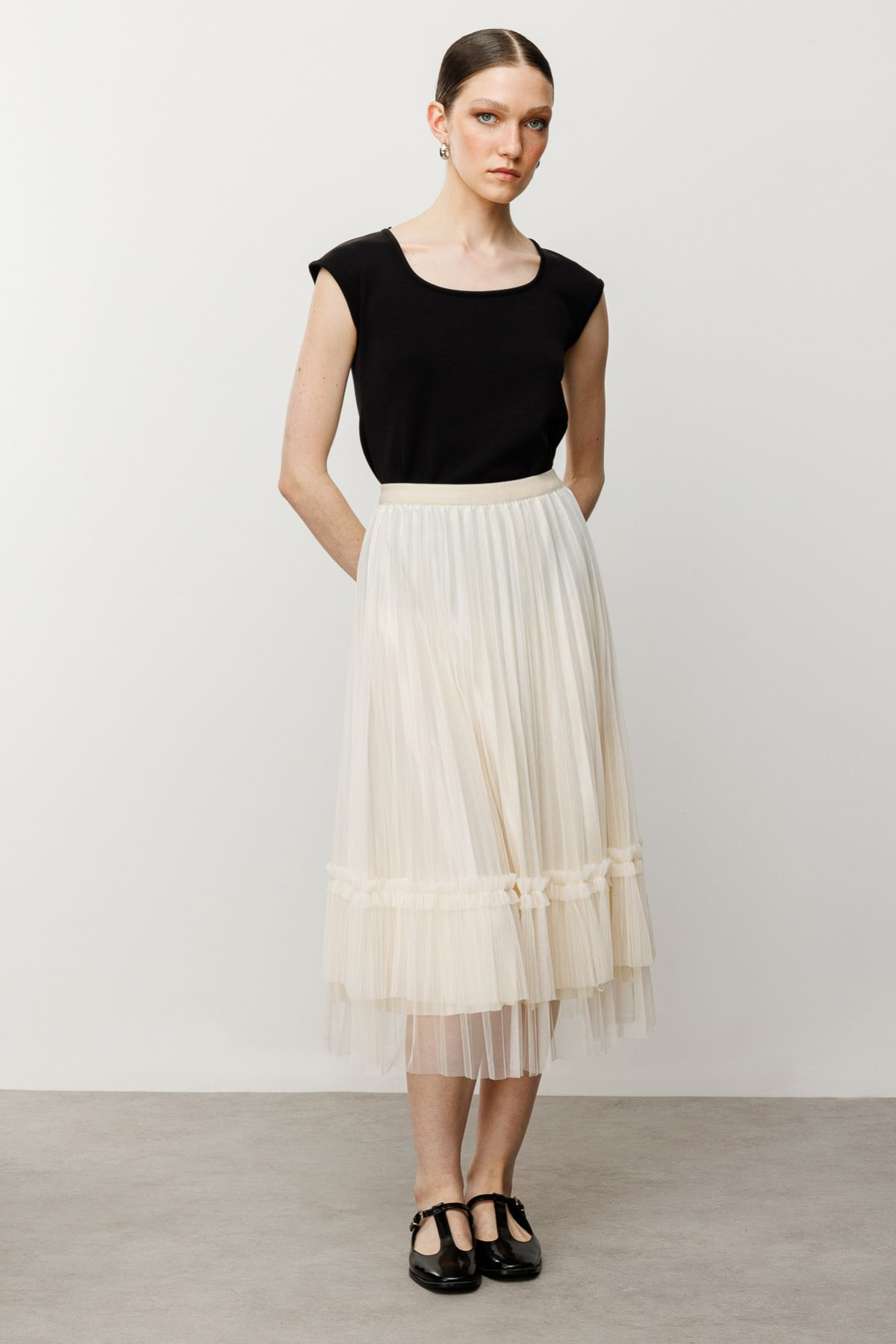 Ürün Özellikleri:Beli lastikli, astarlı,midi boy, tül piliseli