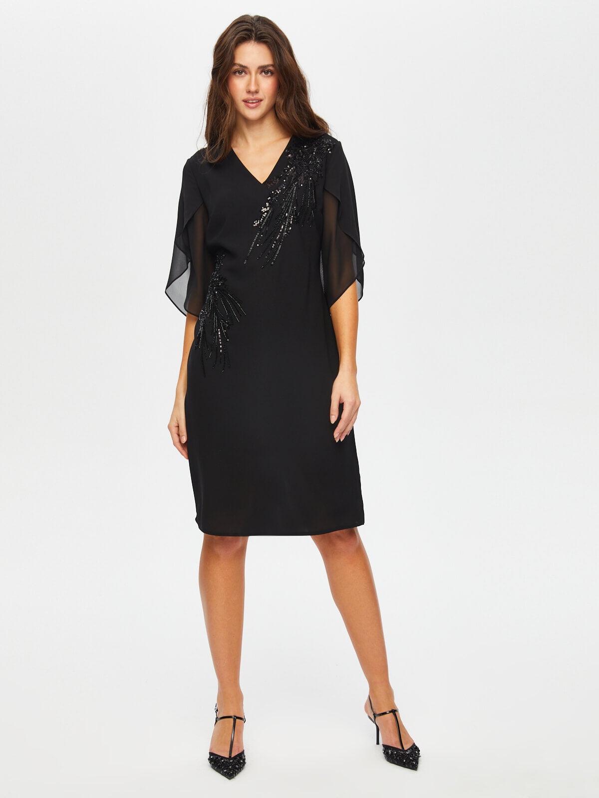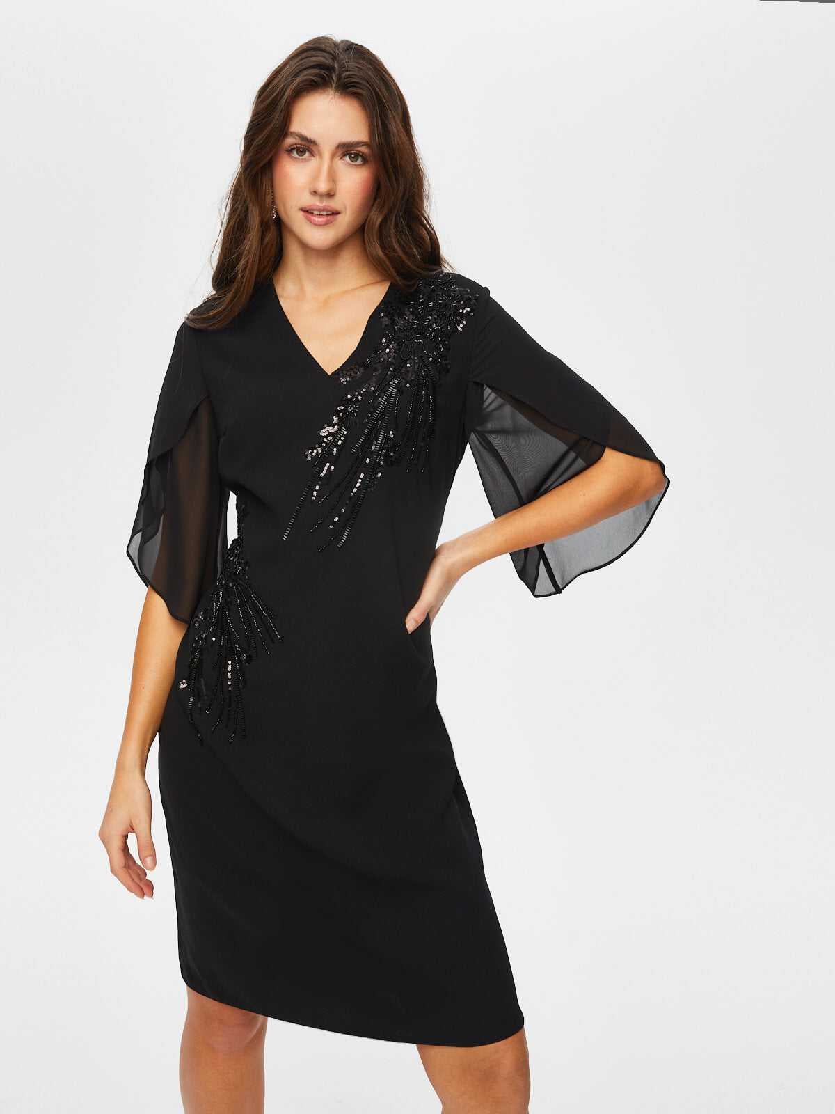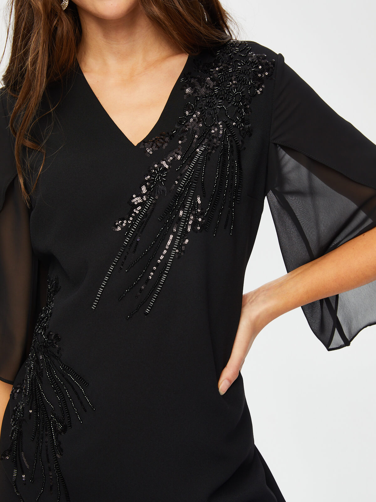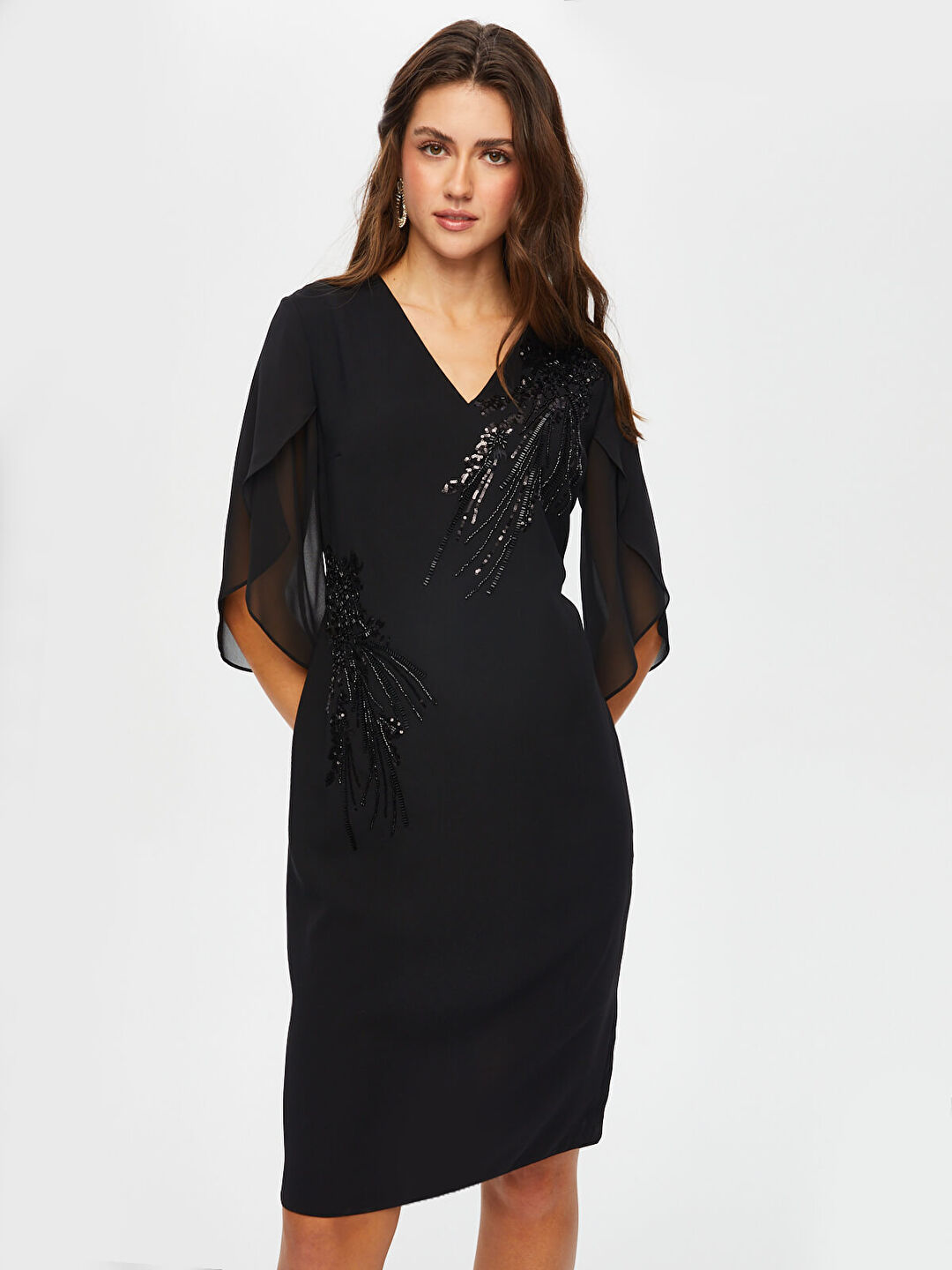 Taş Ve Boncuk Süslemeli Şifon Kollu V Yaka Abiye Elbise  Faik Sönmez%100 Polyester