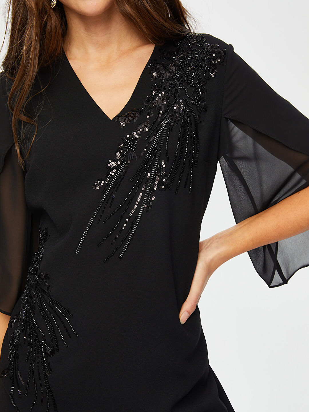 Taş Ve Boncuk Süslemeli Şifon Kollu V Yaka Abiye Elbise  Faik Sönmez