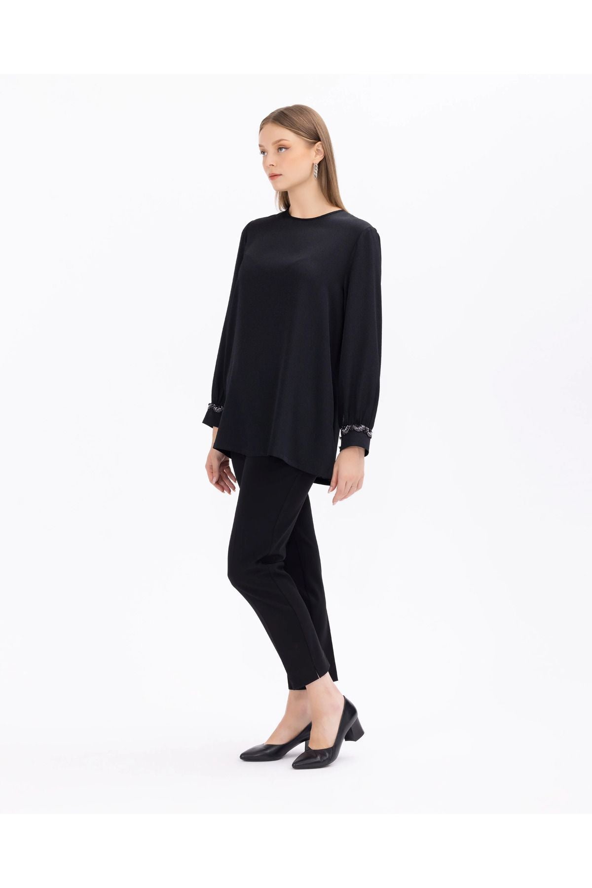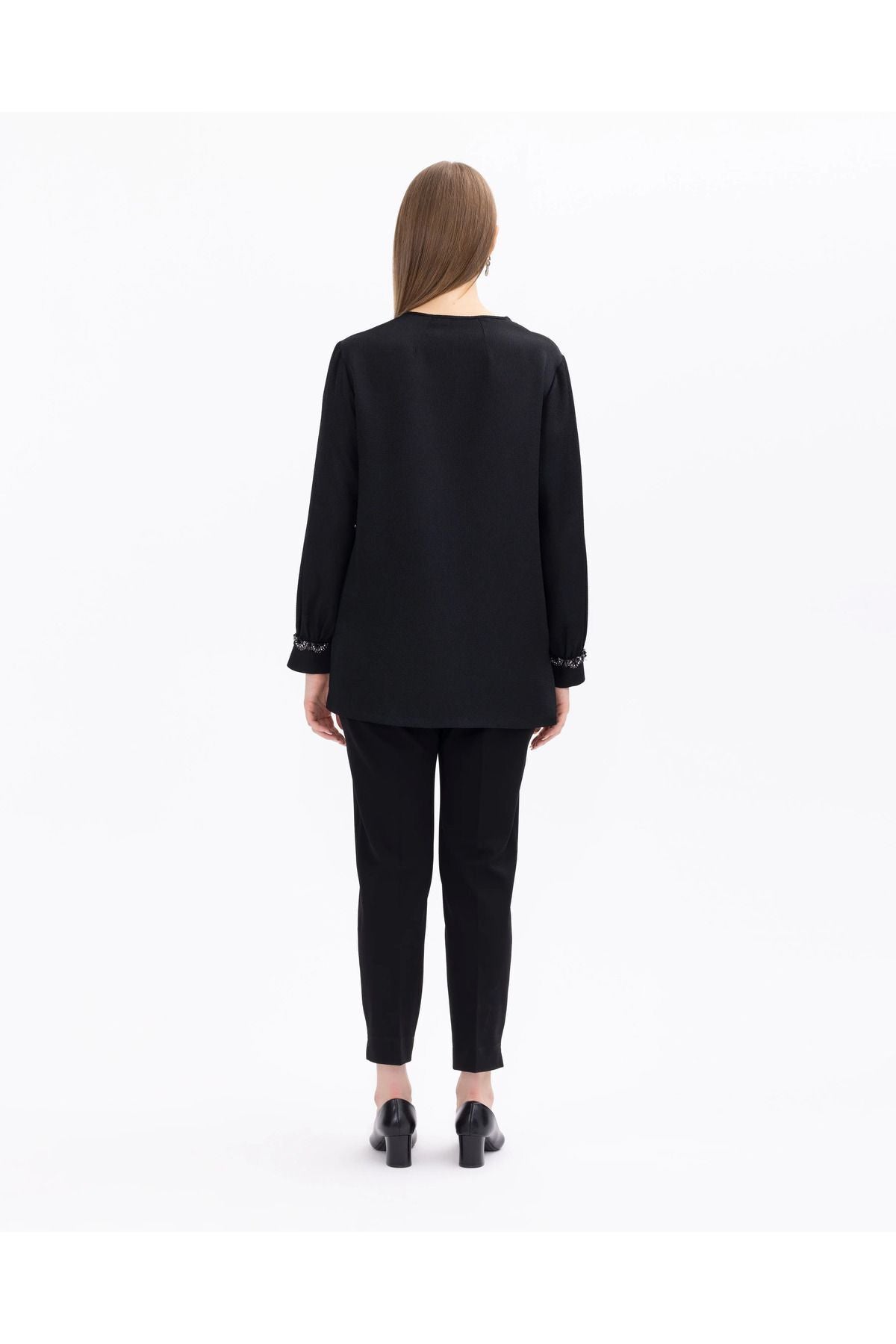 Zarif detaylarla süslenmiş büyük beden bluz. Taş işlemeli yuvarlak yaka, şıklığı vurgularken rahat kesimi gün boyu konfor...
