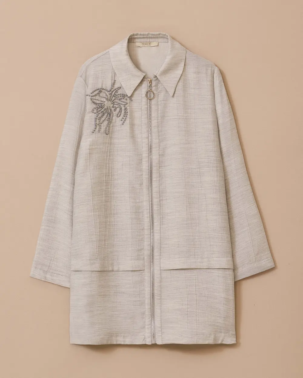 Büyük Beden Nakış Detaylı Fermuarlı Kap, rahat kalıbı ve zarif işlemeleriyle günlük şıklığa modern bir dokunuş katar.