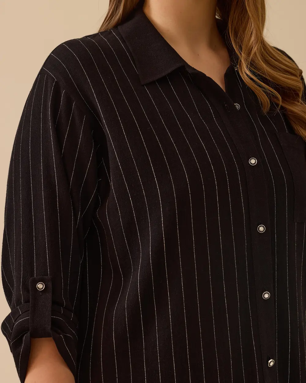 Büyük Beden Çizgili Düğmeli Gömlek, klasik çizgili deseni ve rahat kesimiyle hem günlük hem ofis şıklığı için ideal bir parçadır.