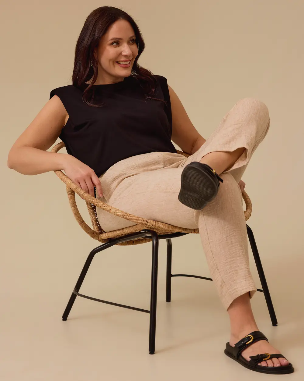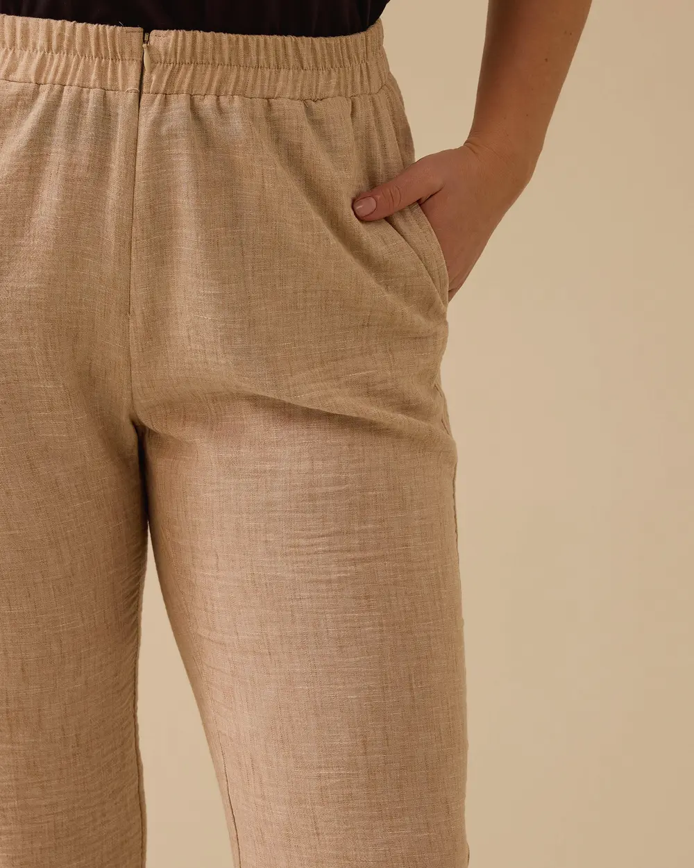 Büyük Beden Elastik Bel Keten Görünümlü Pantolon, rahat kesimi ve esnek beliyle gün boyu konfor sunar, hafif kumaşıyla şıklığı tamamlar.