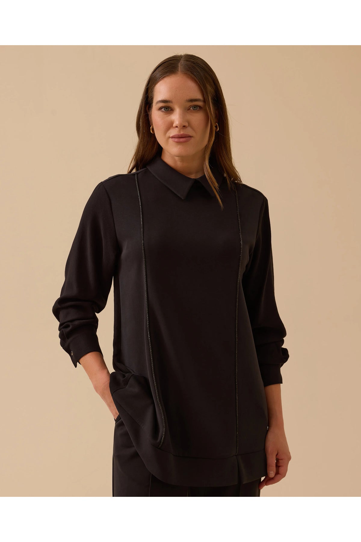 Gömlek Yaka Şerit Detaylı Sweatshirt, modern tasarımıyla şıklık ve rahatlığı bir arada sunar.