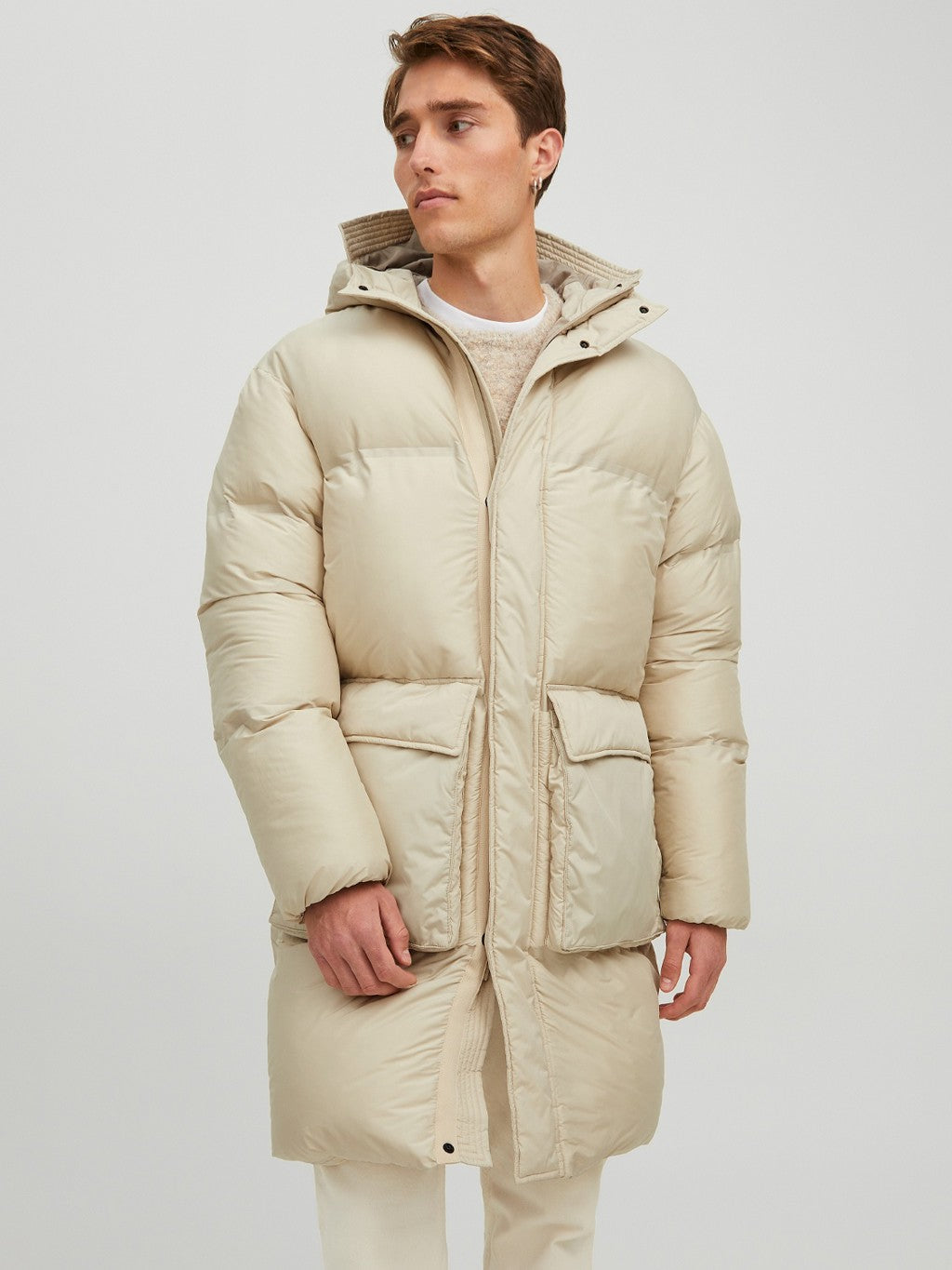 Şişme kaban; Ekstra sıcaklık için polar astarlı el cepleri; Uzun- Suya dayanıklı- Sentetik elyaf dolgulu; Tamamen fermuarlı fırtına patı- İç cep; Ribanalı manşetler- Fırtına manşetleri- %100 Geri dönüştürülmüş polyester astar ile tamamen astarlı; Donuk Yüzeyli kumaş- Kış günleri için rahat model- Yüksek Yaka; Model L beden giyiyor ve 186 cm boyunda- JACK & JONES PREMIUM; 100 polyester;