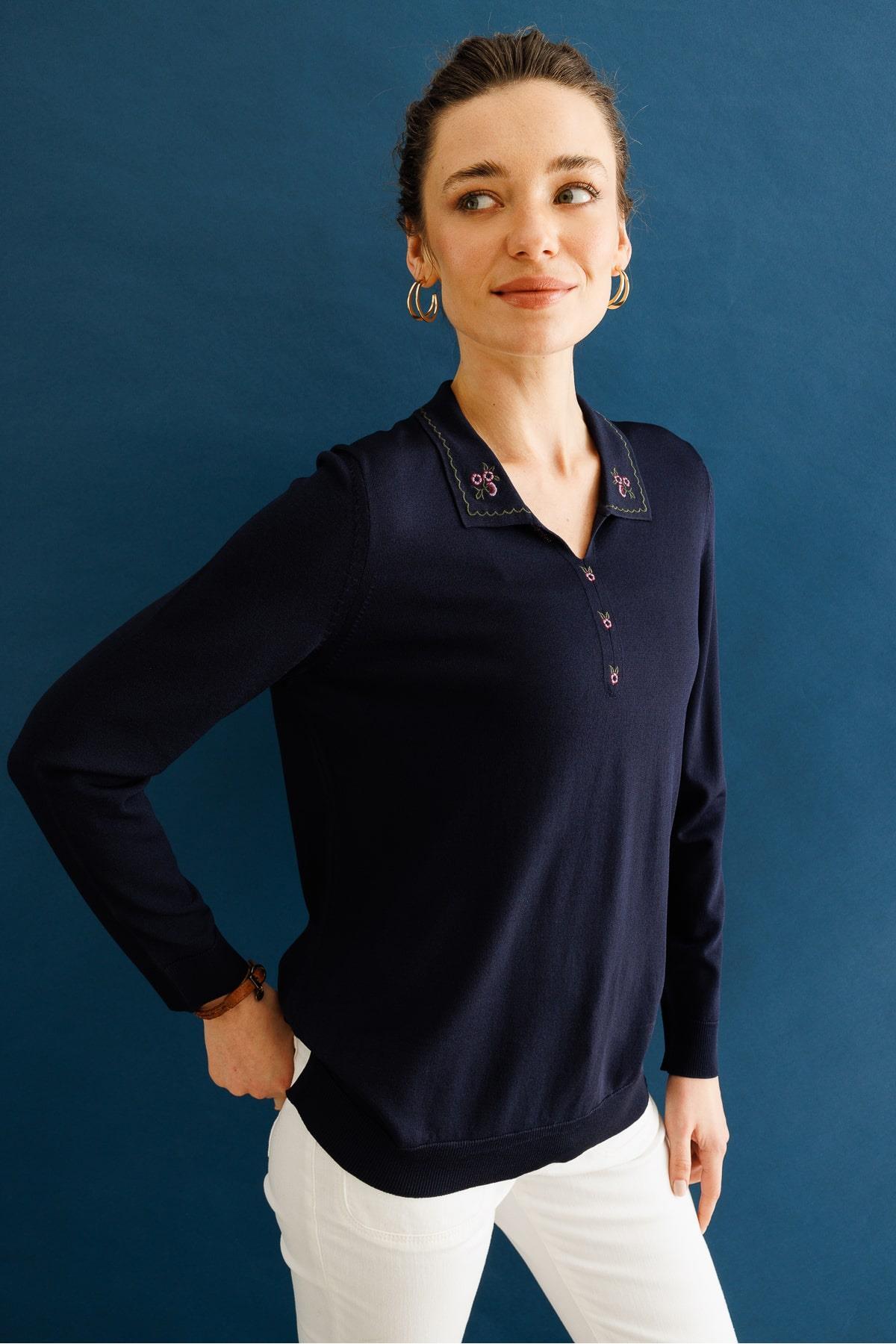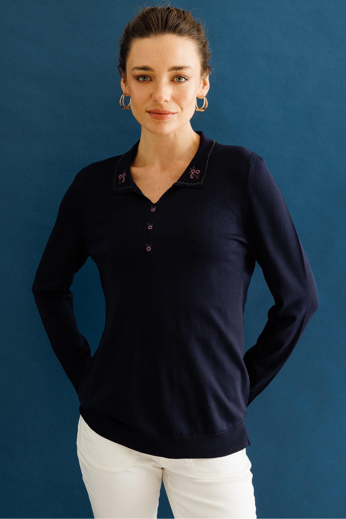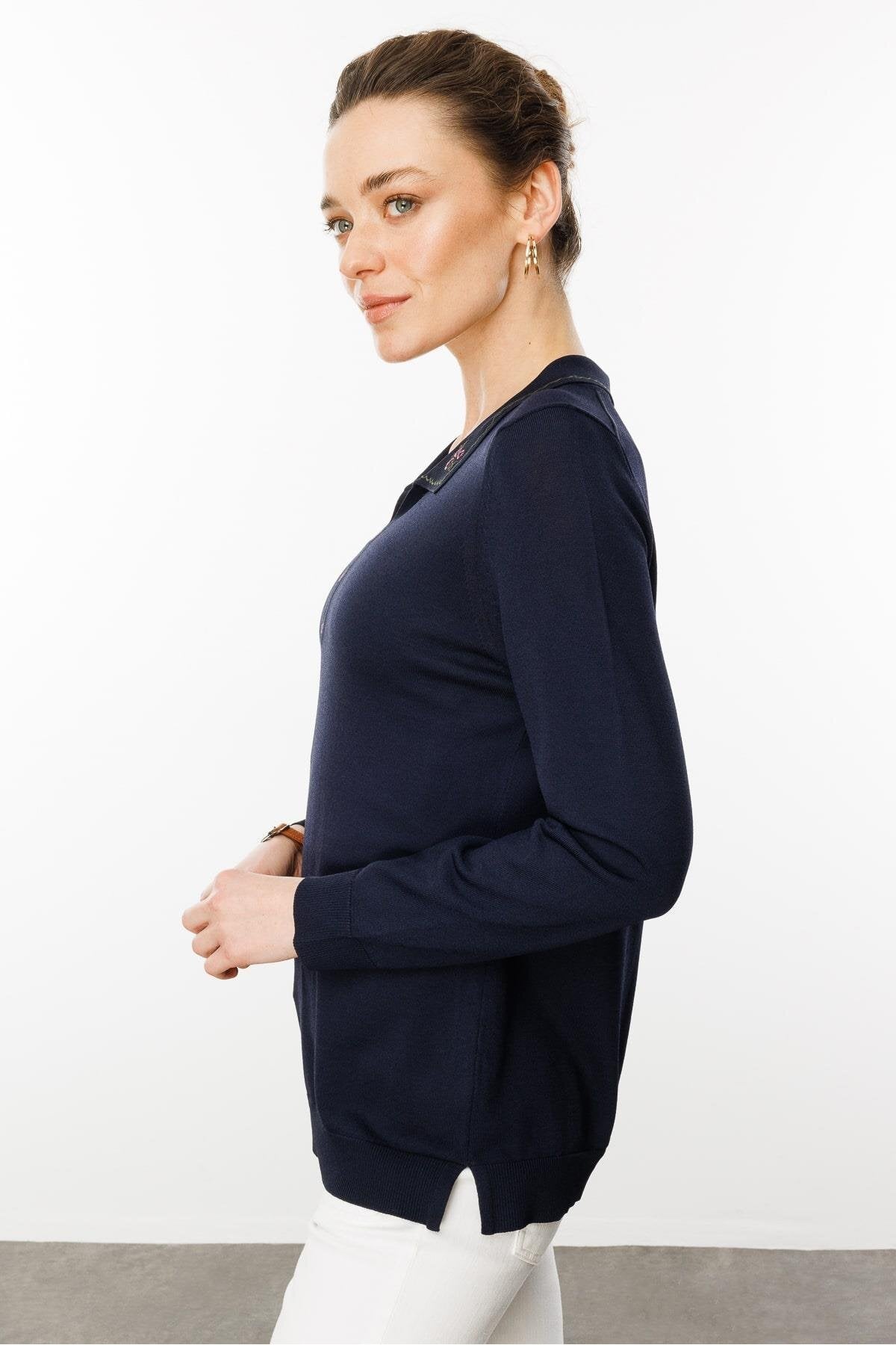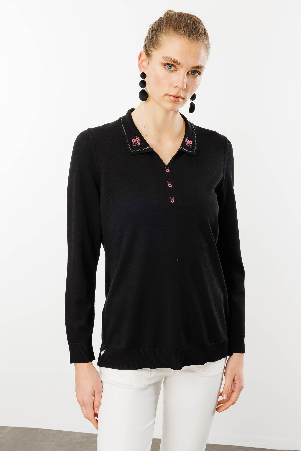 Kadın Polo Yaka Yakası Nakışlı Yazlık Triko Bluz Desen