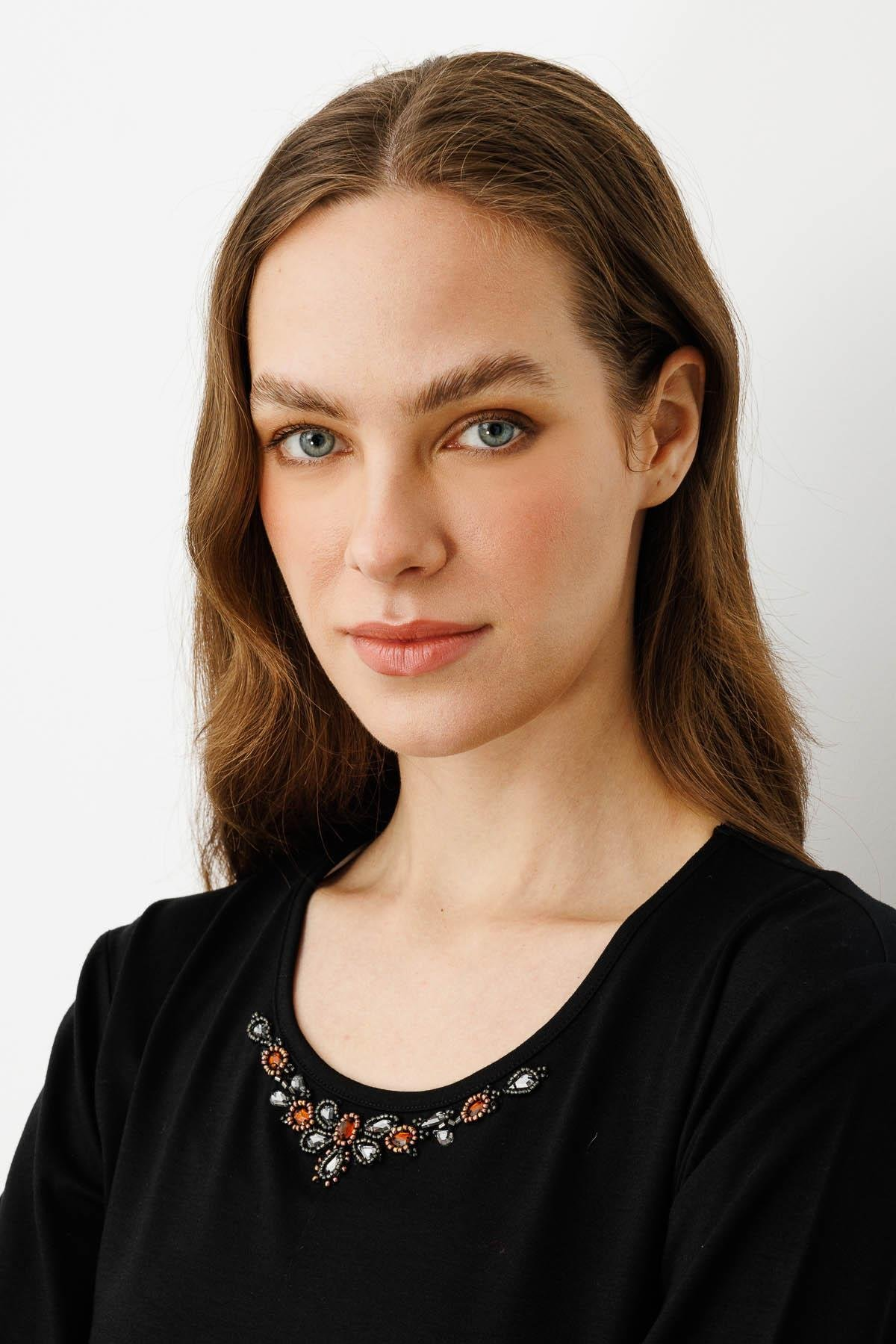 Kadın Sıfır Yaka Boncuk İşlemeli Penye Bluz SiyahDesen
