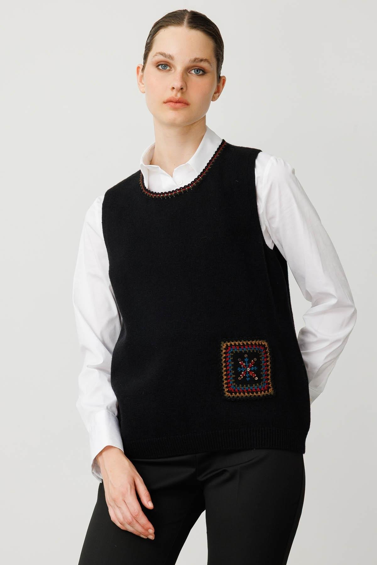 Kadın Sıfır Yaka Cebi ve Yakası Renkli Tığlamalı Yün Süveter Desen