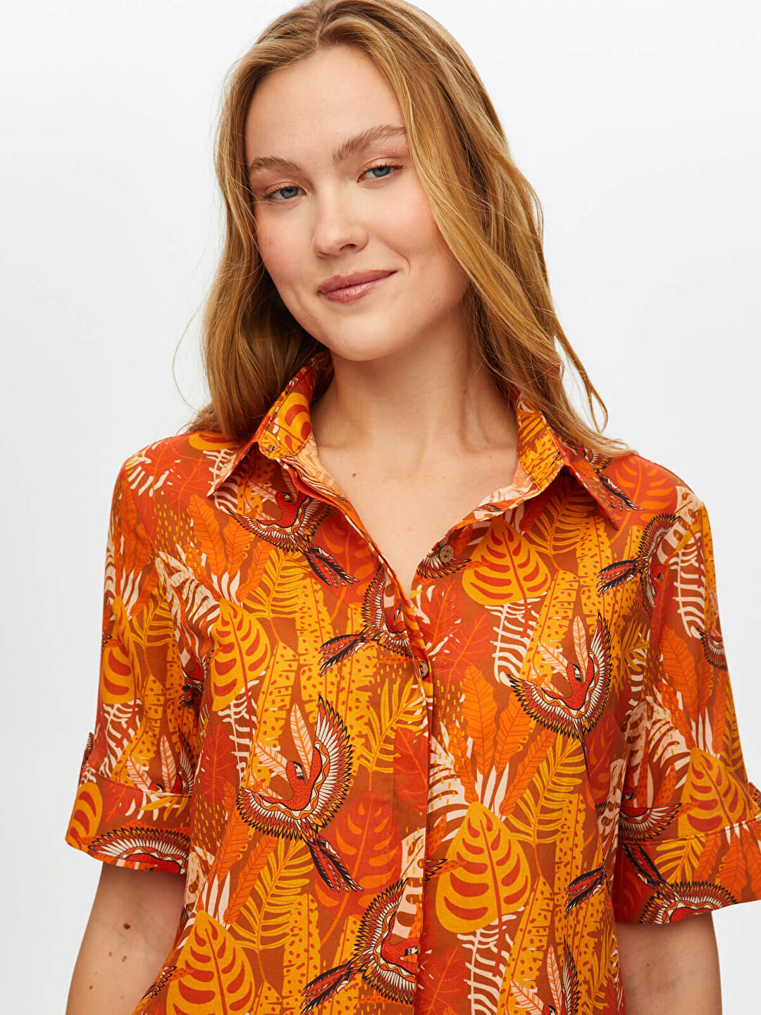 Kadın Tropik Desen Kısa Kol Pamuk Vual Gömlek Faik Sönmez