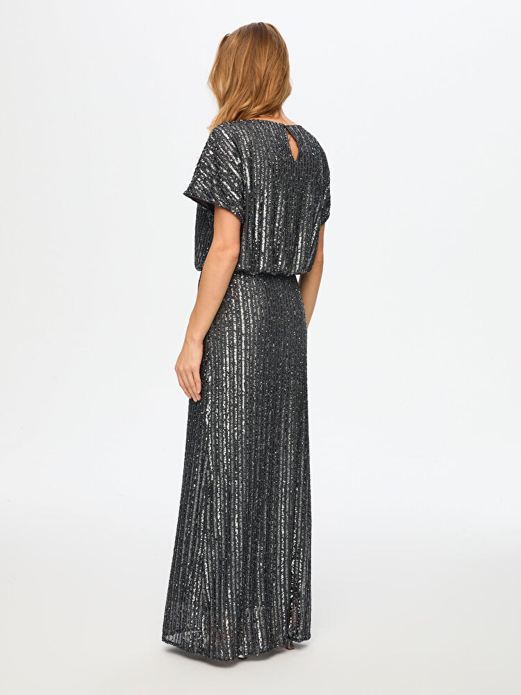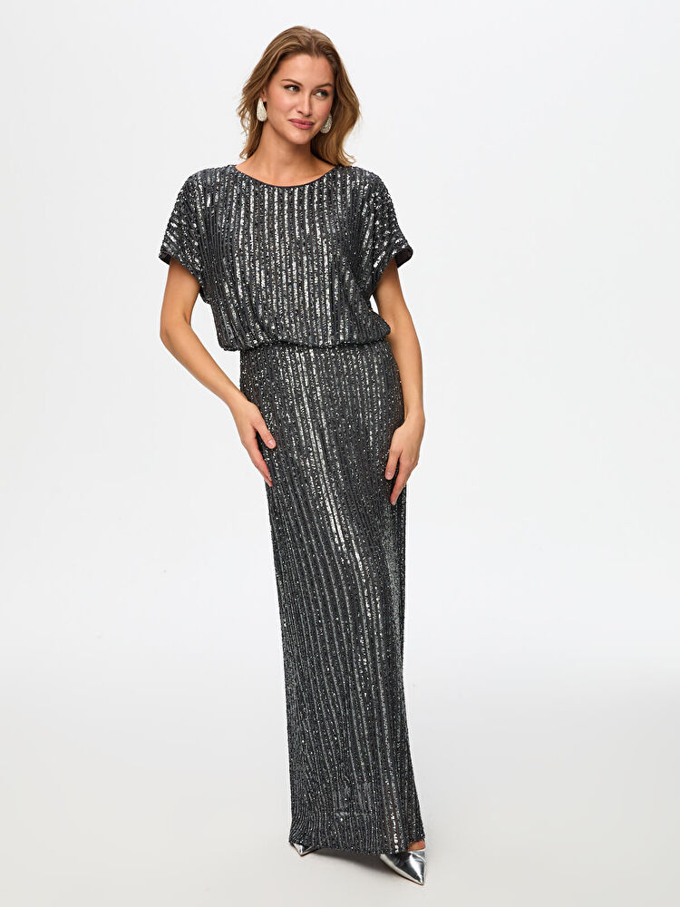 Kayık Yaka Kısa Kol Payetli Uzun Abiye Elbise Faik Sönmez