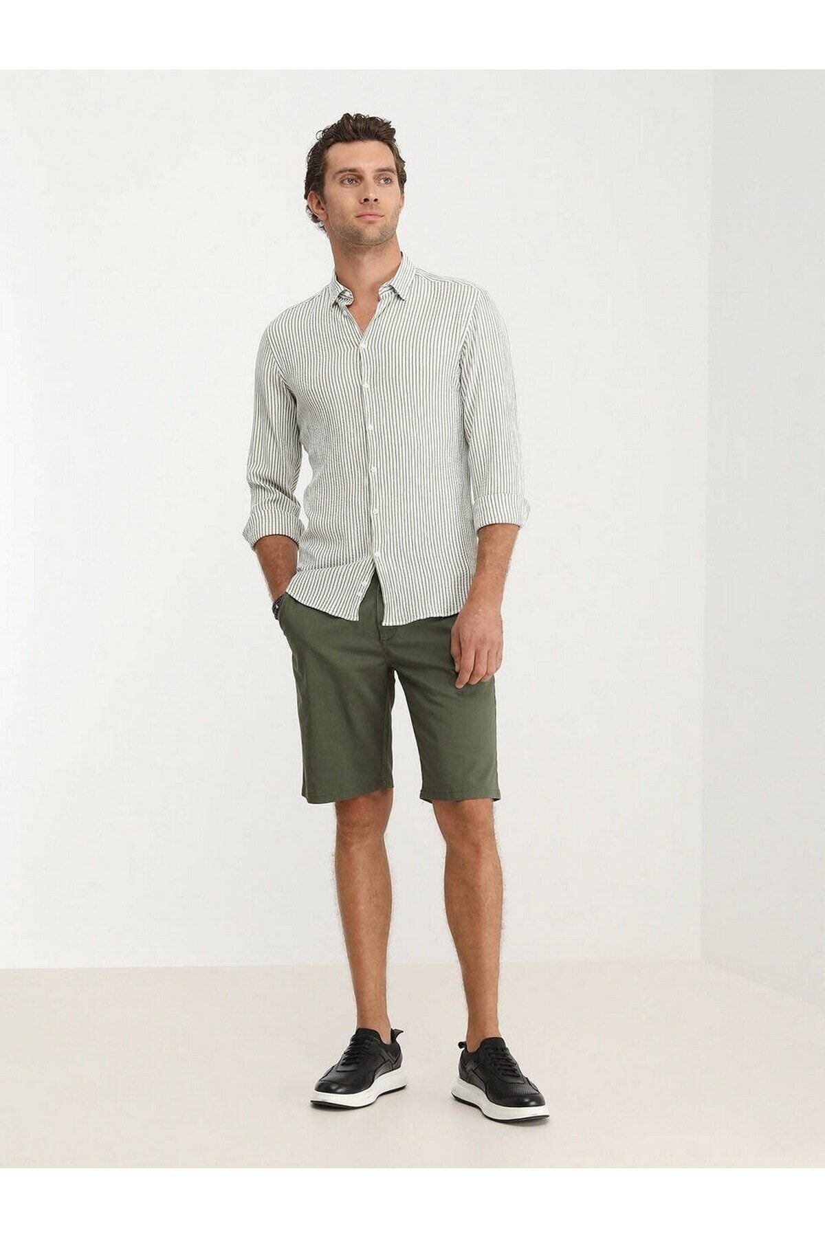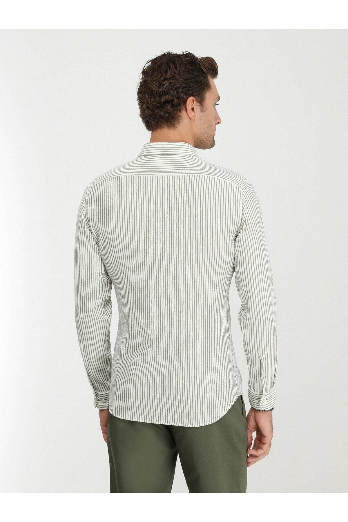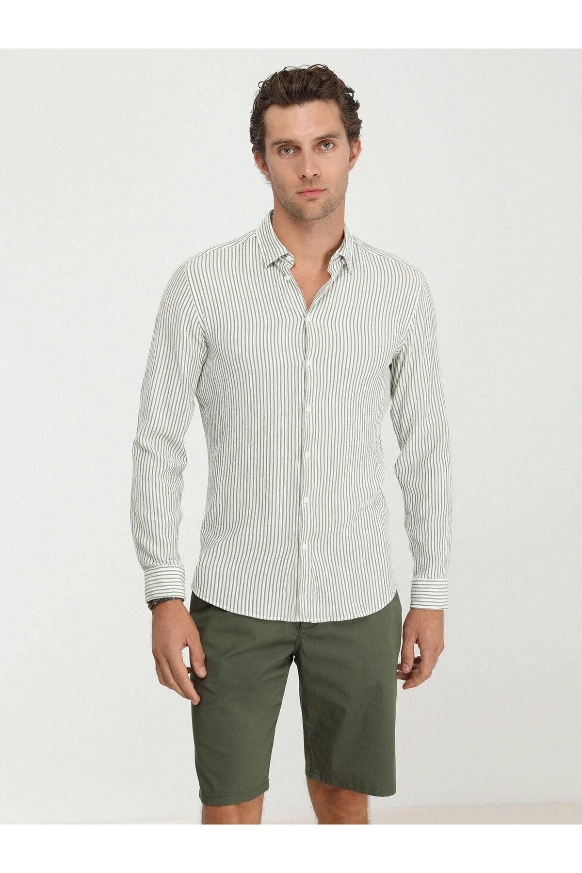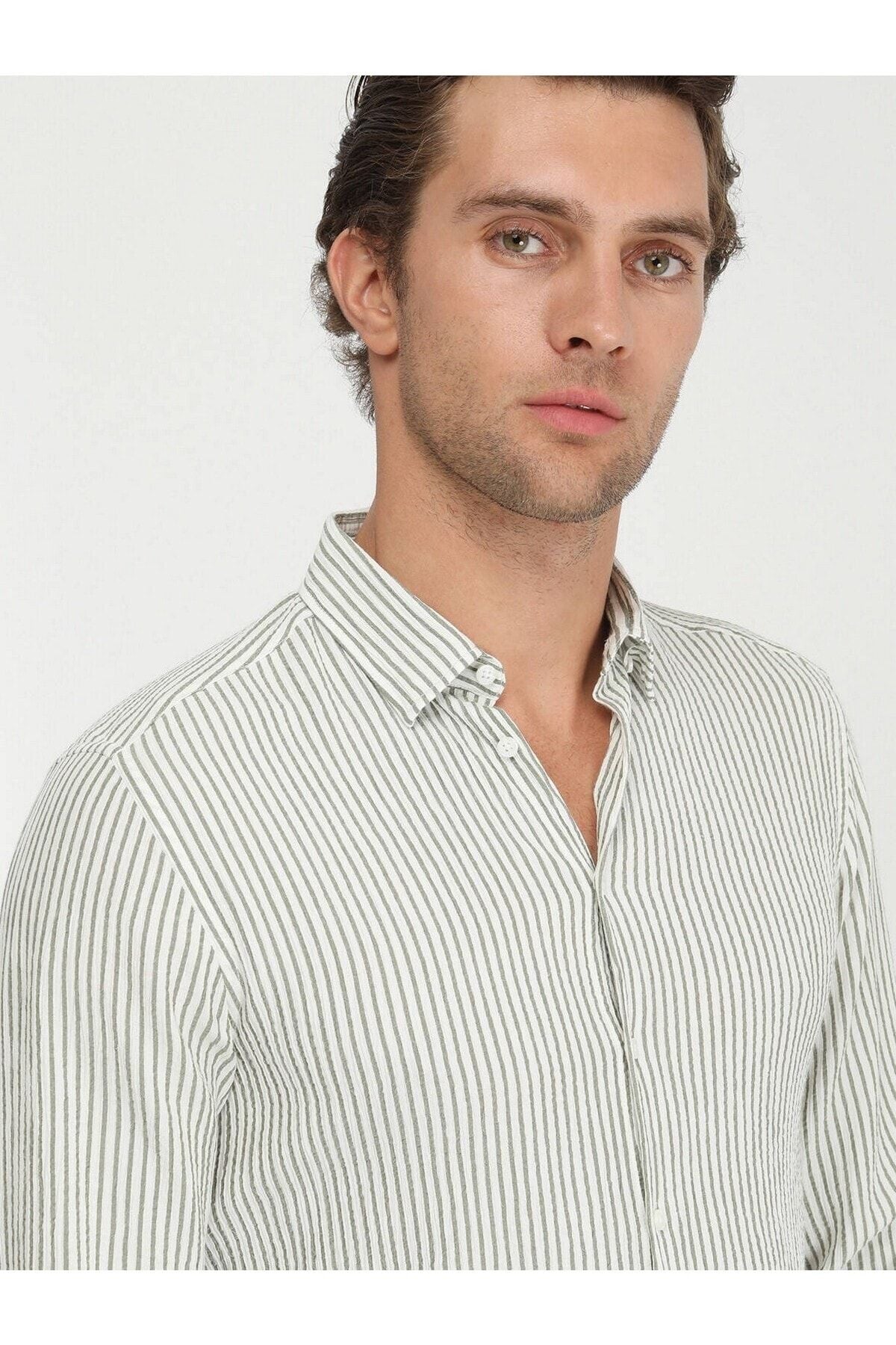 Gömlek; Desen: Çizgili; Line: Casual; Yaka: Alttan Britli Yaka; Doku: Seersucker; Fit: Slim Fit; Karışım: %68 Viskon, %32 Polyester;