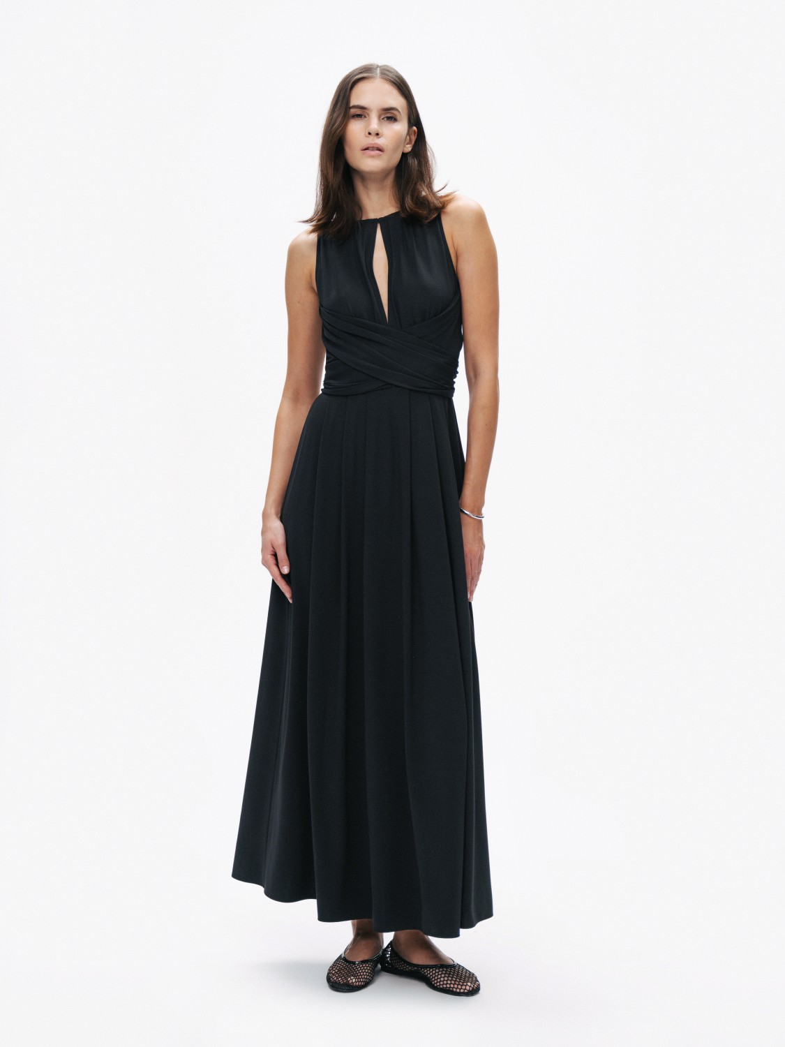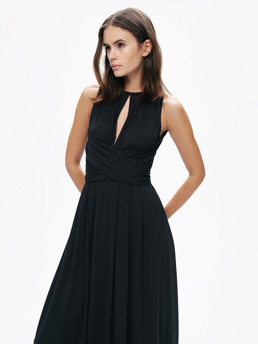 Ürün Açıklaması: Regular fit, tam kalıp, astarsız, arkadan gizli fermuar kapamalı, sıfır yaka, enseden ipli, ön ve arka pencere detaylı, omuzdan bele kuşak bağlamalı maxi boy elbise