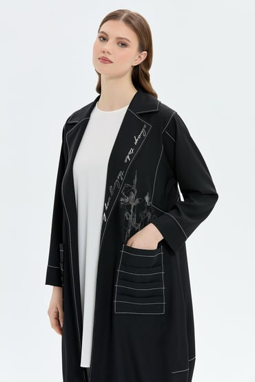 Dokuma kumaş İç tunik kolsuz Spor dikişli cepli Gümüş baskı detaylı içli dışlı takım Tam kalıp Dış kap boyu 120 cm İç tunik boyu 94 cm