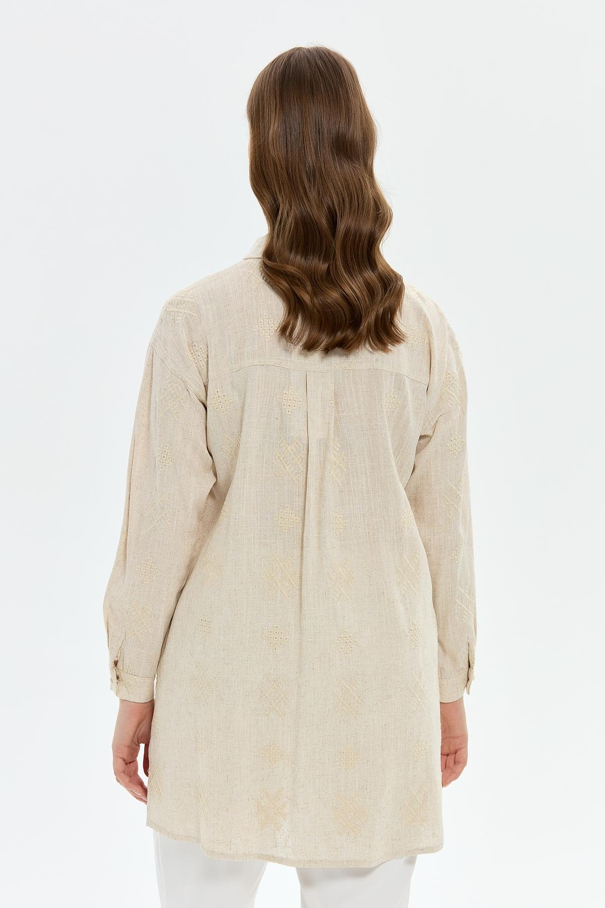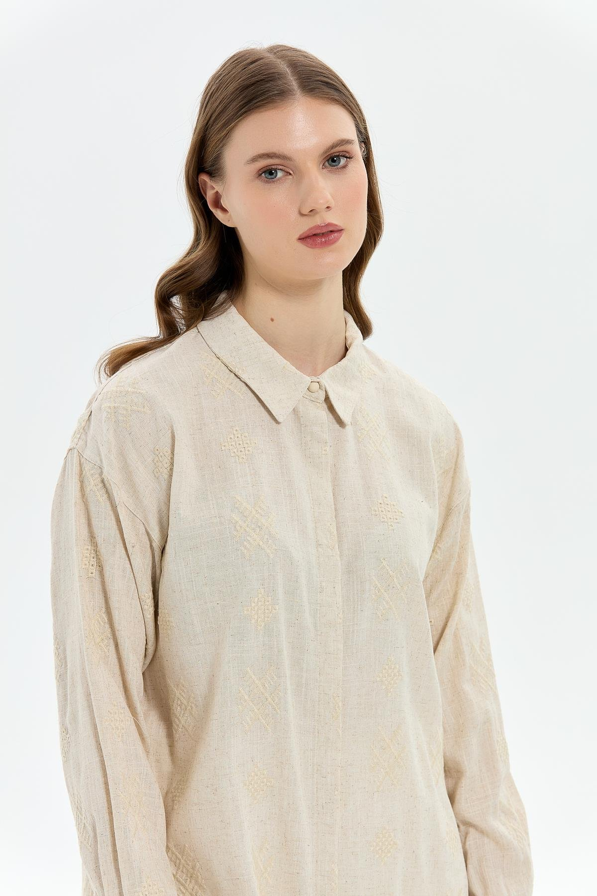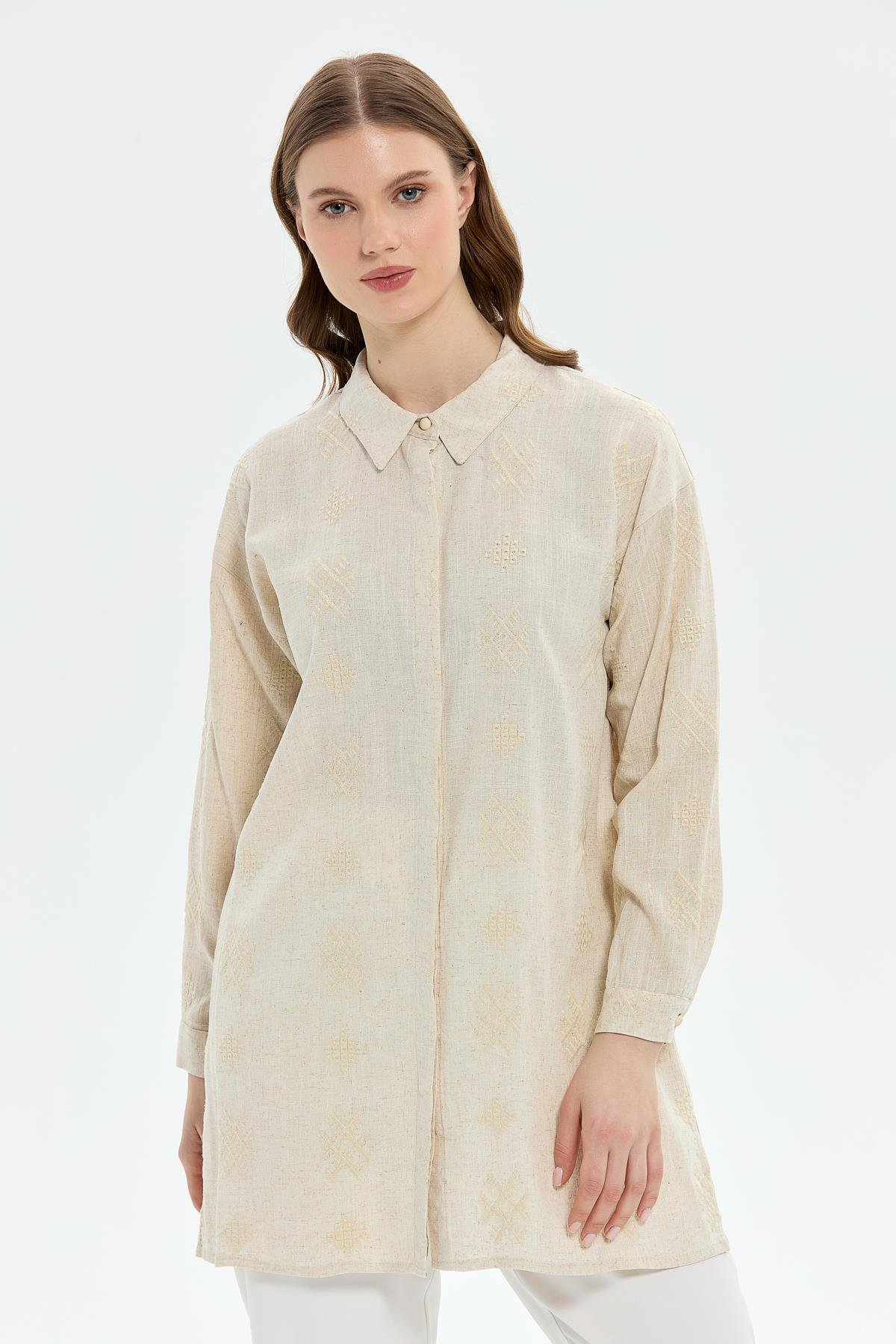 Dokuma kumaş İthal keten kendinden nakışlı Gizli düğme kapamalı gömlek Tam kalıp Gömlek boyu 85 cm