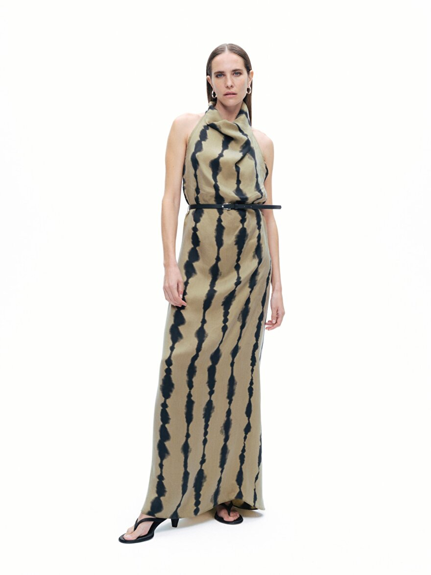 Ürün Açıklaması: Regular fit, tam kalıp, astarsız, boyundan düğme kapamalı, degaje yaka, sırt dekolteli, kemer detaylı desenli maxi boy elbise