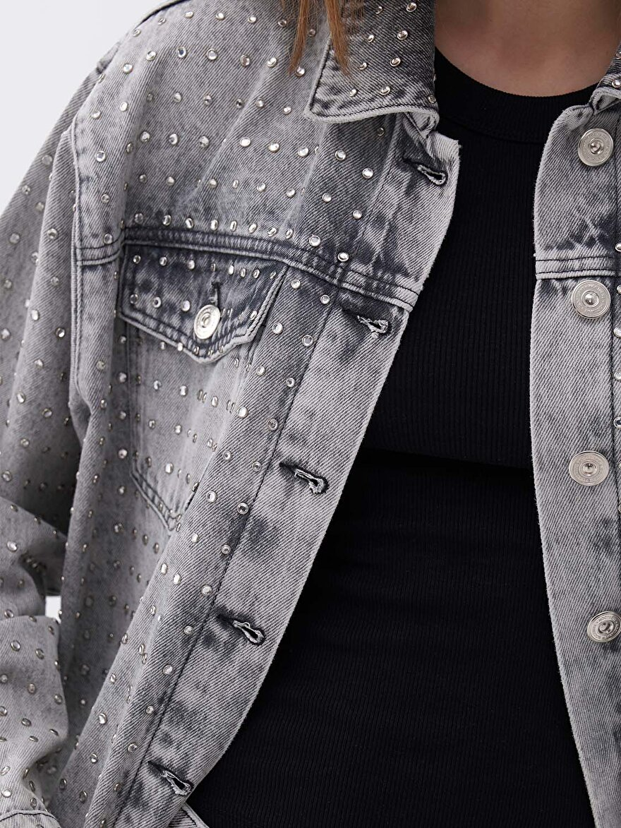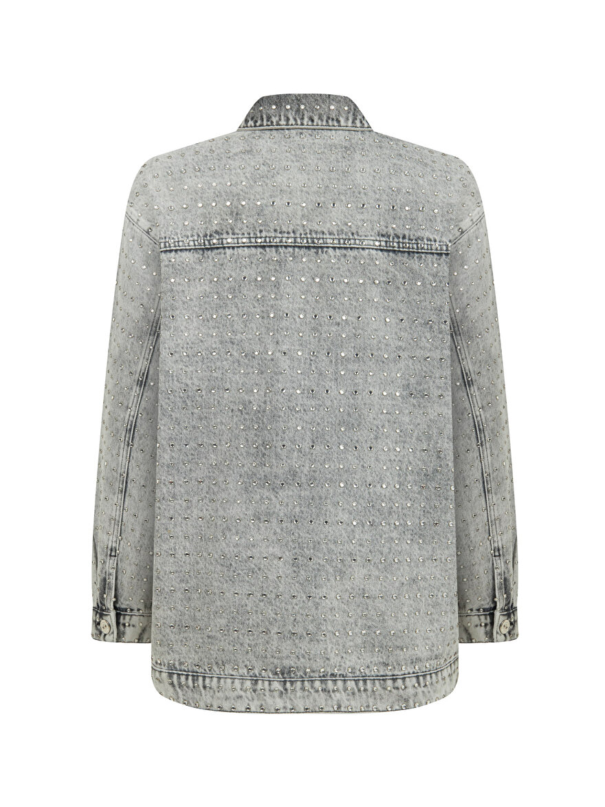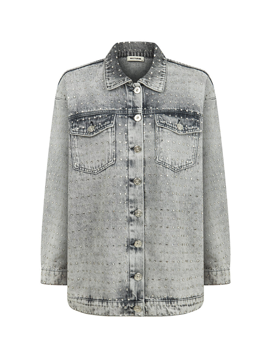 Ürün Açıklaması: Oversize, tam kalıp, uzun kollu, astarlı, garnisiz, dokuma, gömlek yaka, önden düğme kapamalı, cepli, yapıştırma parlak taş tasarımlı jean ceket