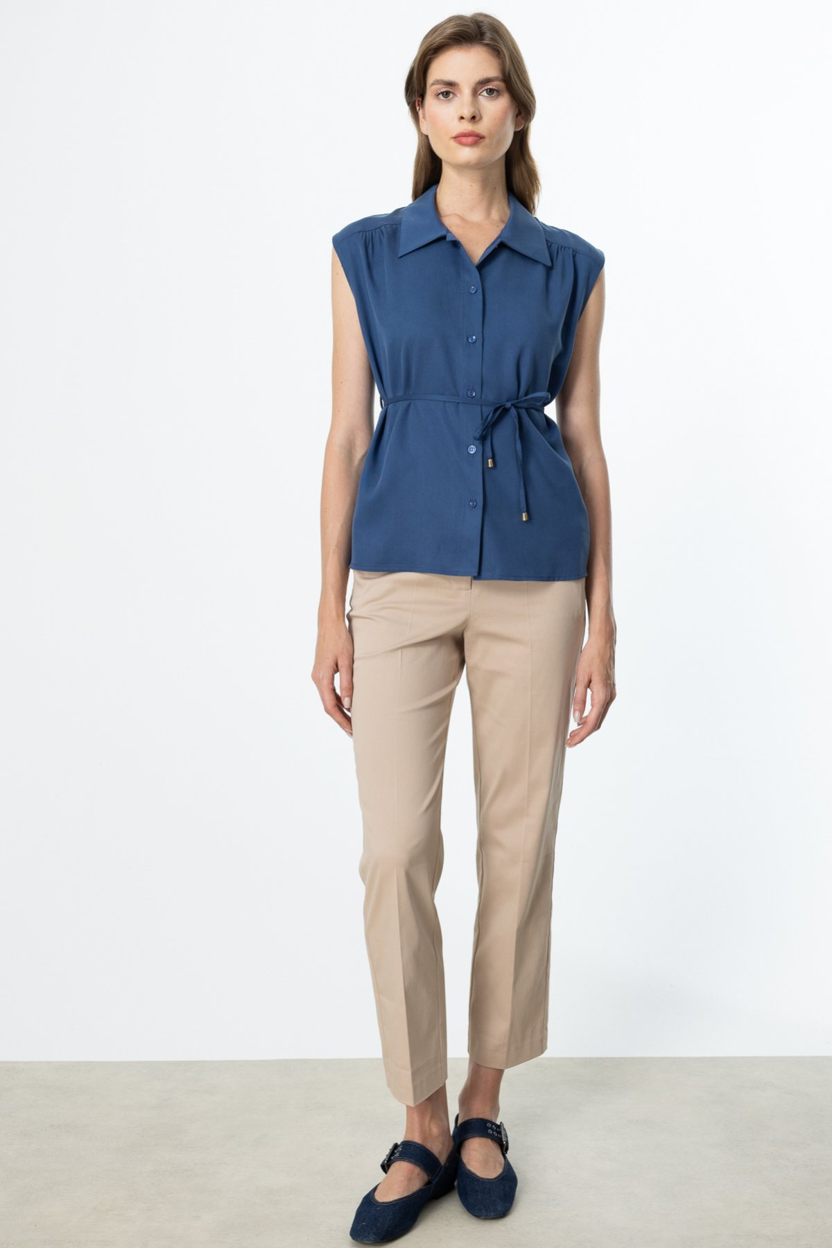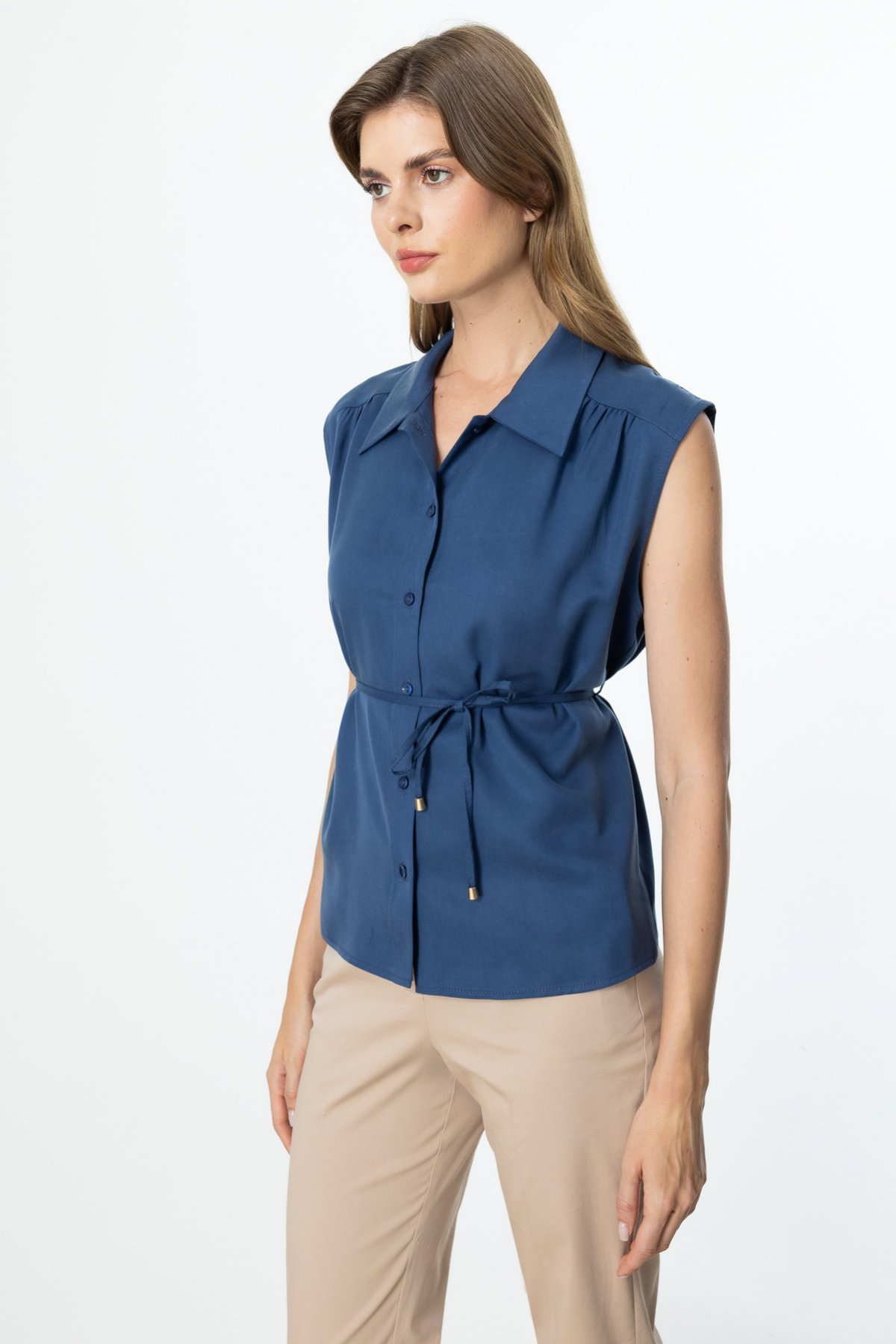 On Beli İp Bağcıklı Kolsuz Gömlek