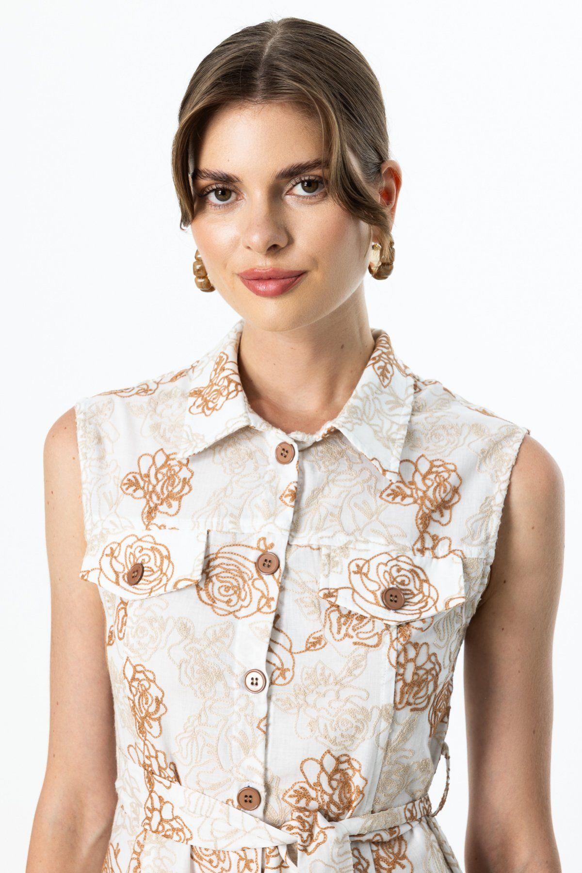 Ürün Özellikleri: Gömlek yaka, pamuk, süs kapaklı, desenli, düğme kapamalı, mini boy, kolsuz, beli kuşaklı