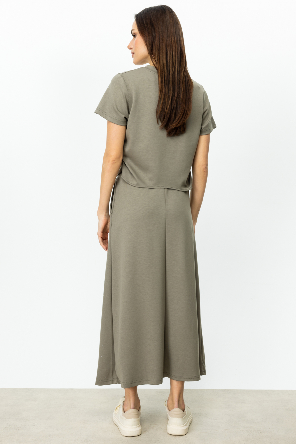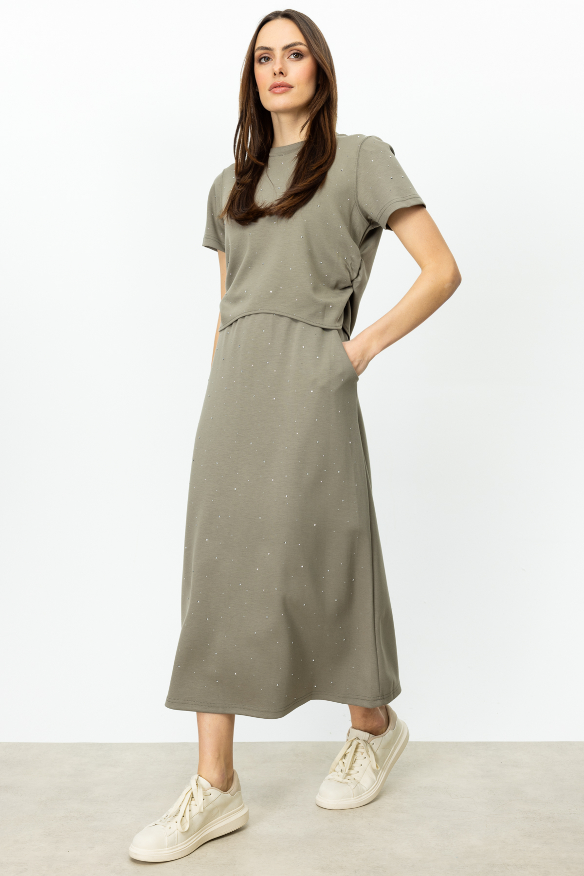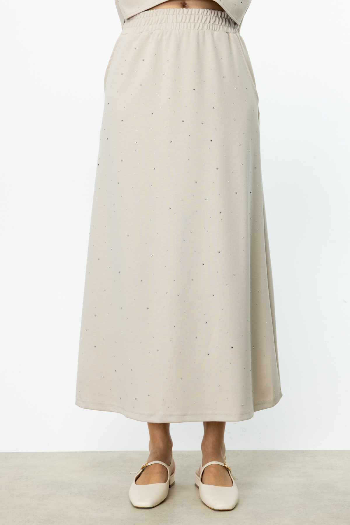 Ürün Özellikleri:Beli lastikli, yandan cepli, maxi boy, taşlı