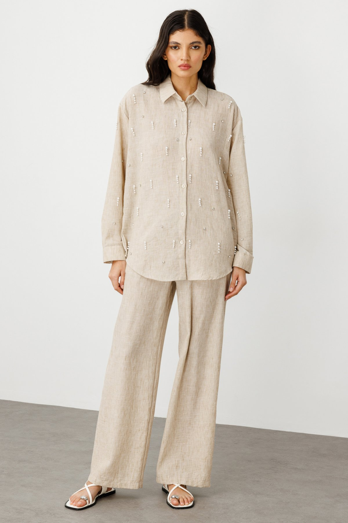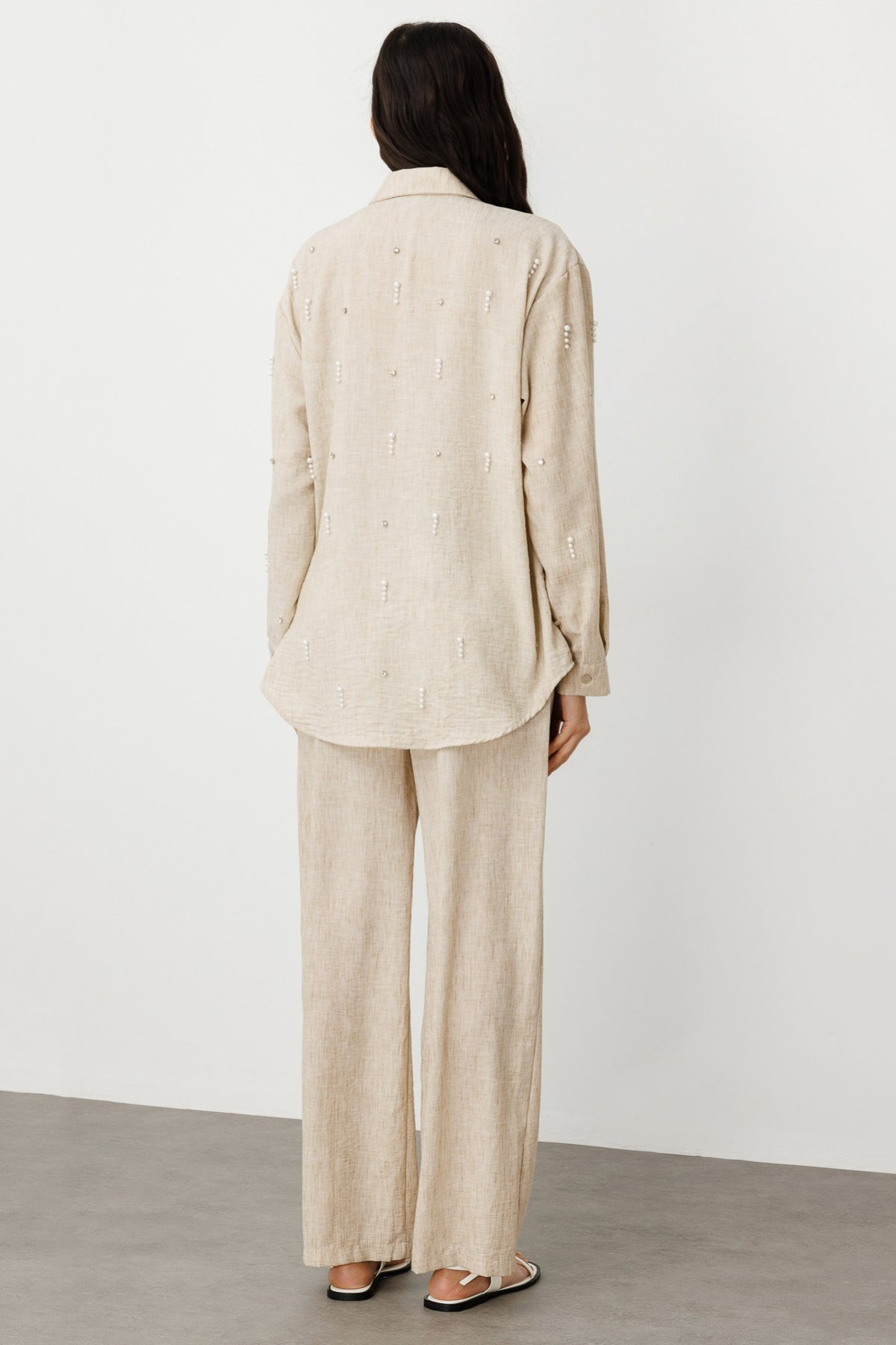 Ürün Özellikleri: Önü incili, düğme kapamalı, uzun kollu, keten kumaşlı
