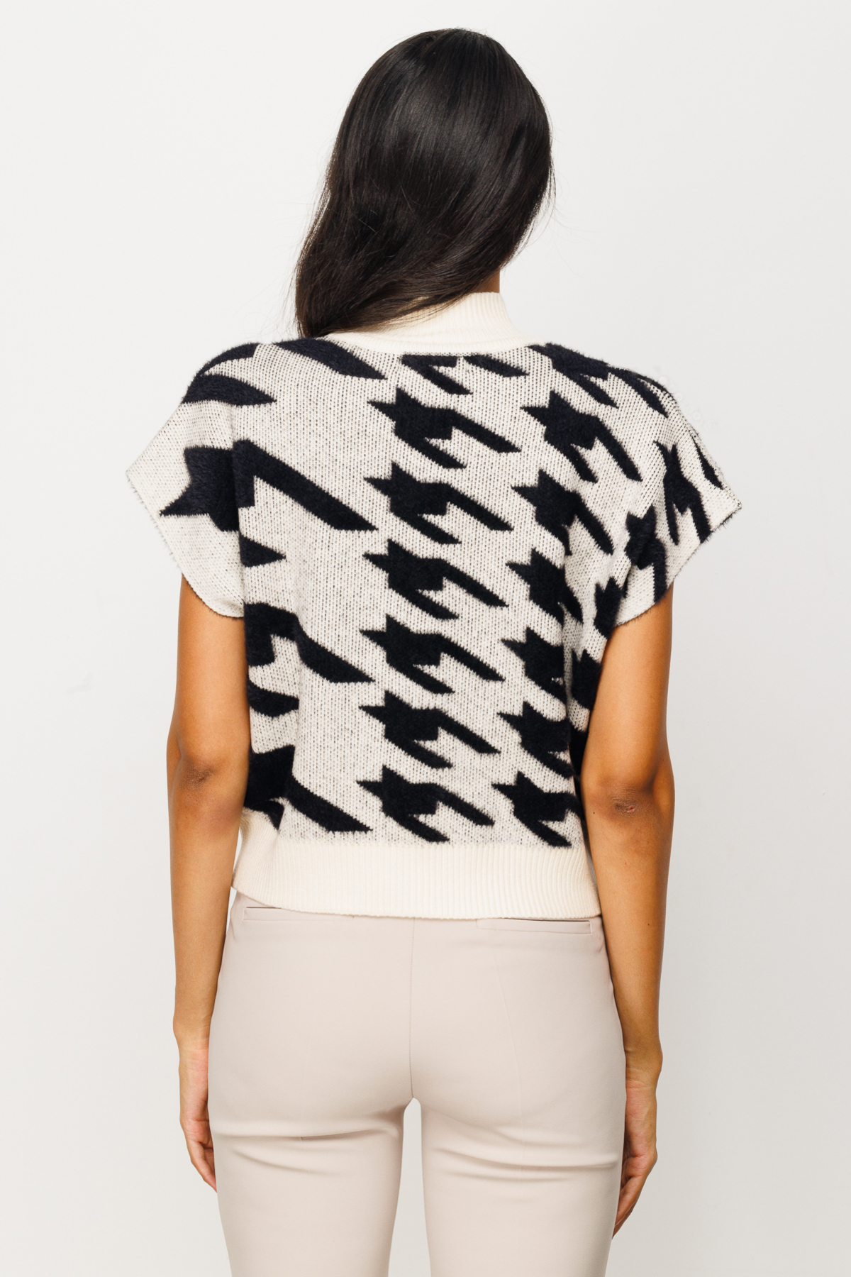 Kazayağı desenli, kolsuz, dik yaka