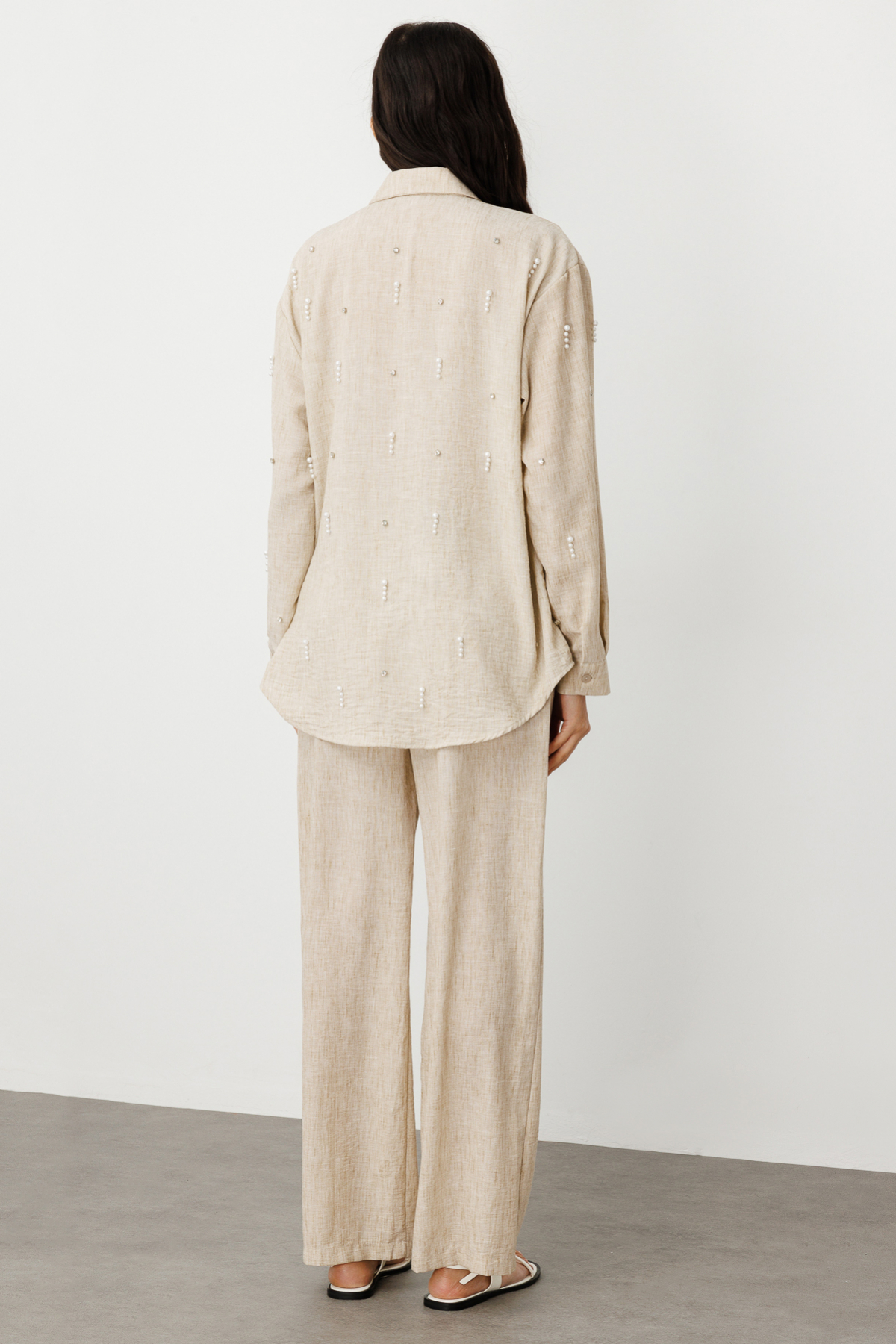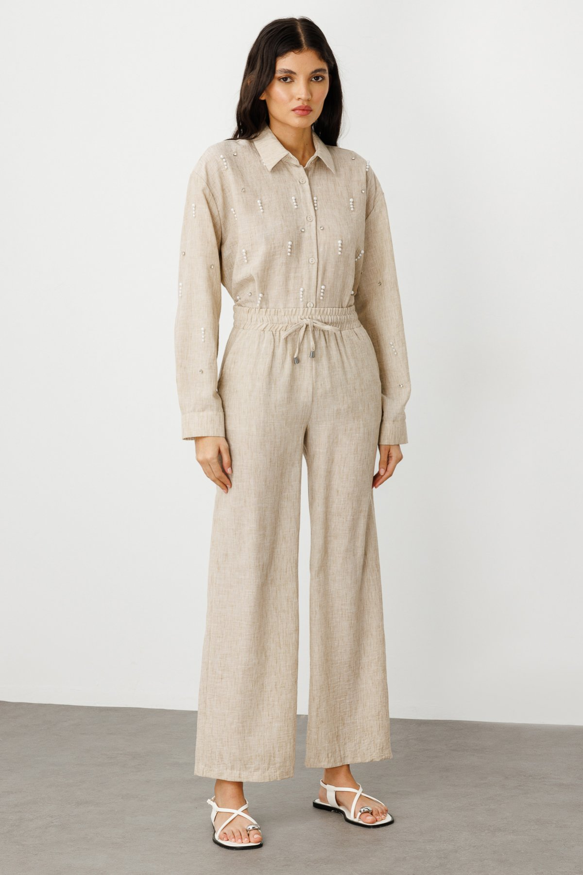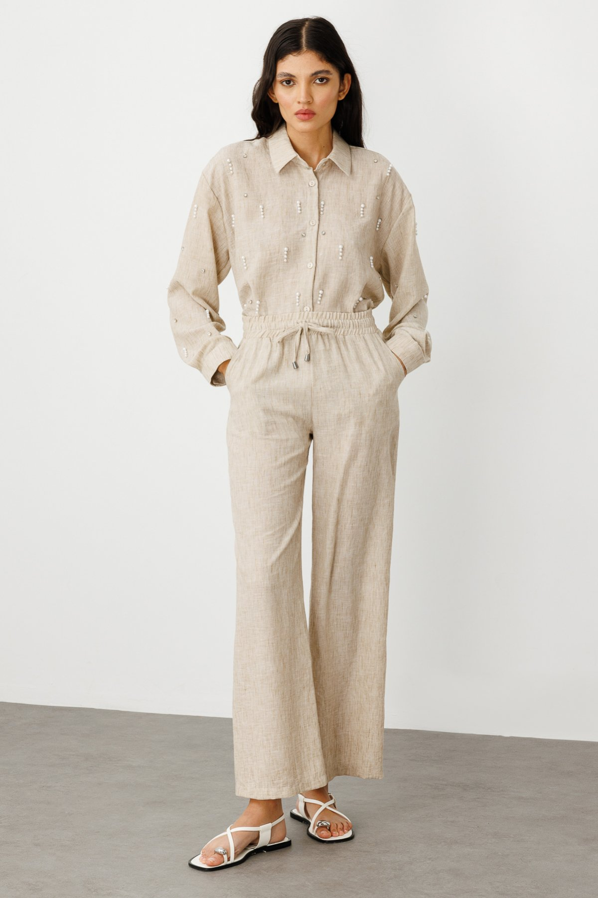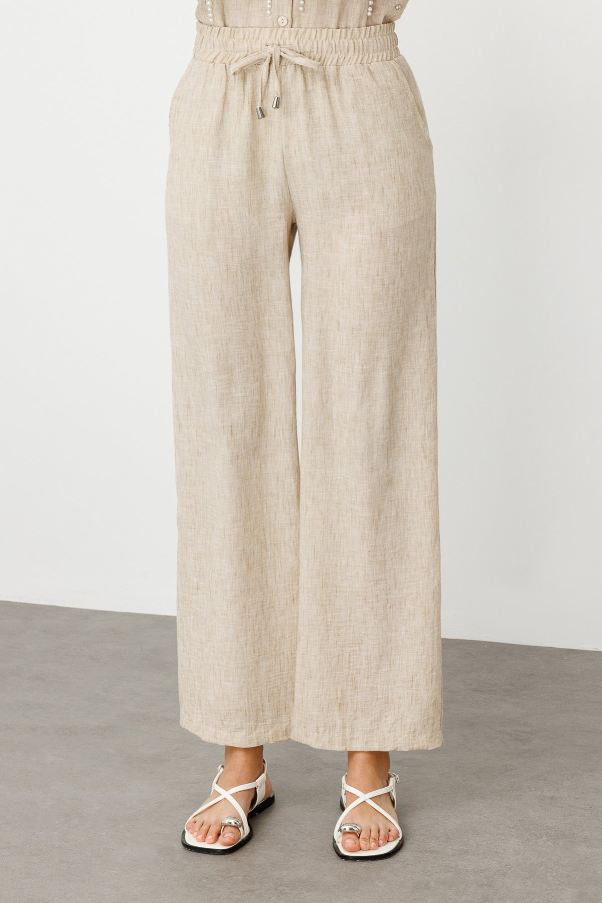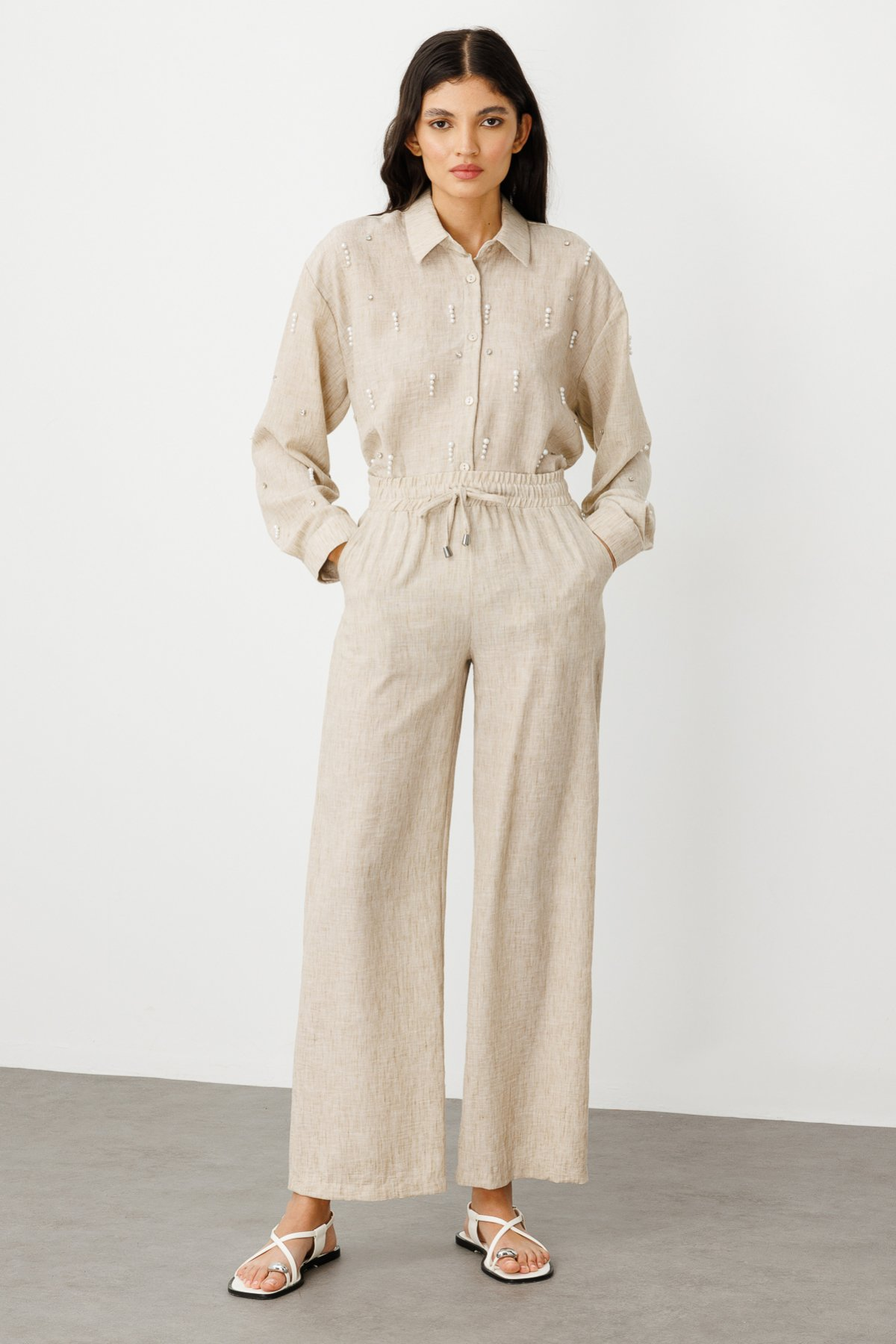 Ürün Özellikleri: Beli lastikli, bağcıklı, bol paça, keten kumaşlı, yandan cepli