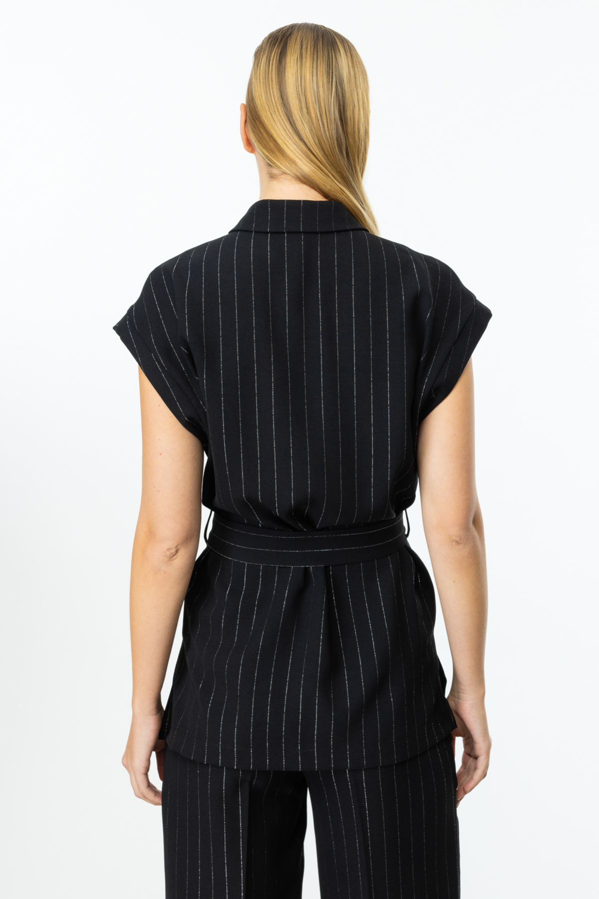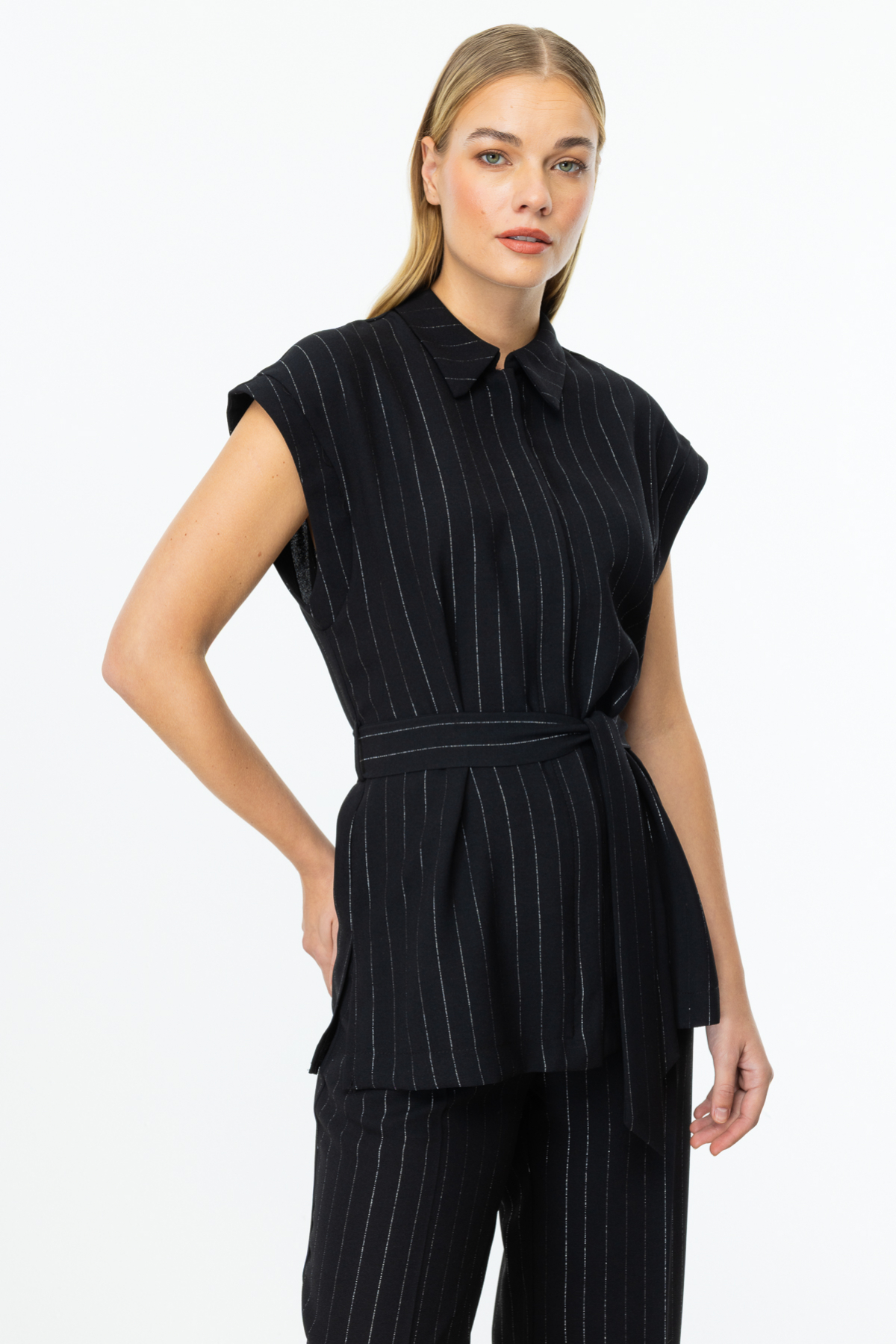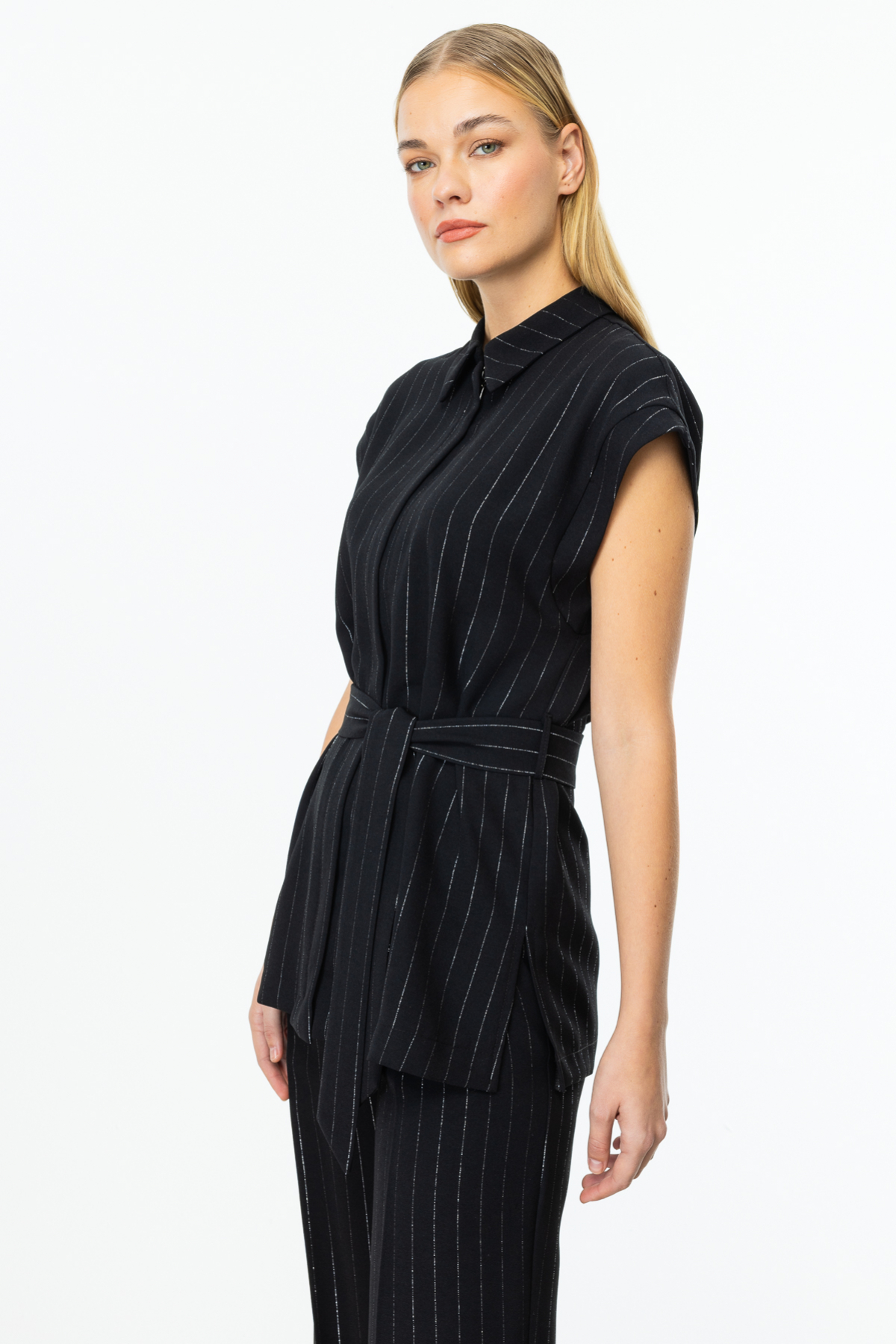 Ürün Özellikleri:Beli kuşaklı, simli çizgili, fermuarlı, astarsız, cepsiz, yanları hafif yırtmaçlı