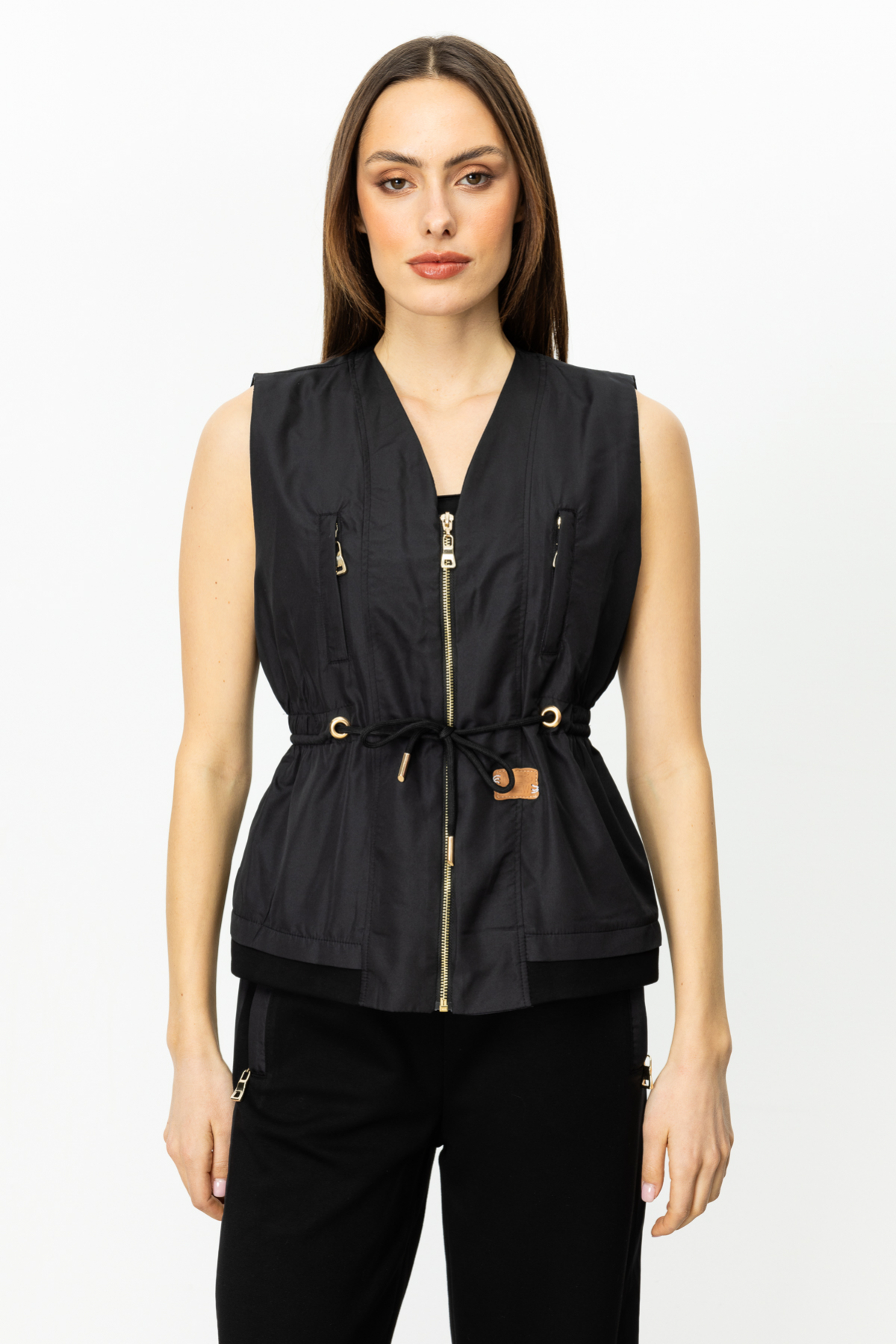 Ürün Özellikleri:V yaka, kolsuz, fermuar kapamalı, astarlı, cepsiz, beli bağcıklı, süs fermuarlı
