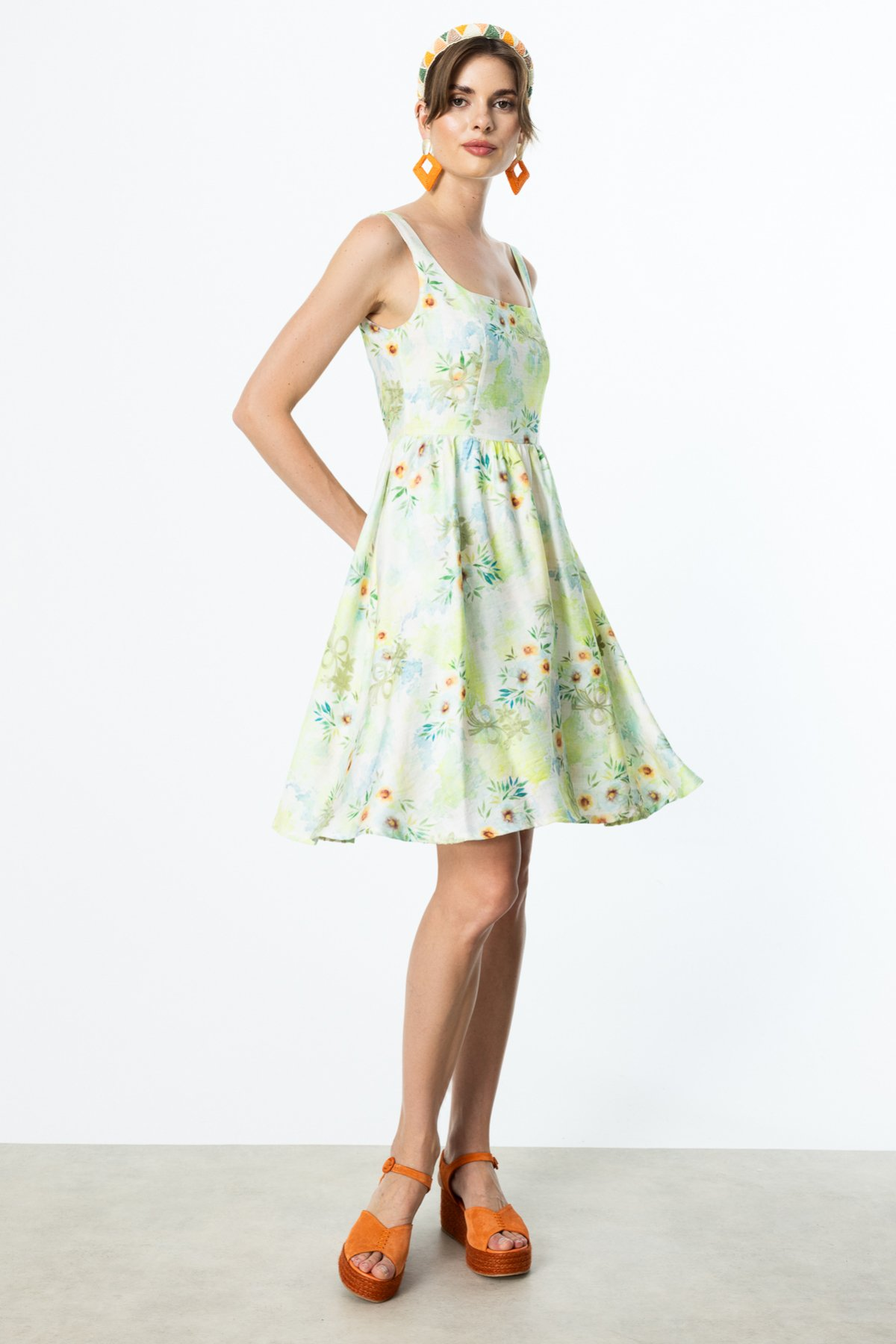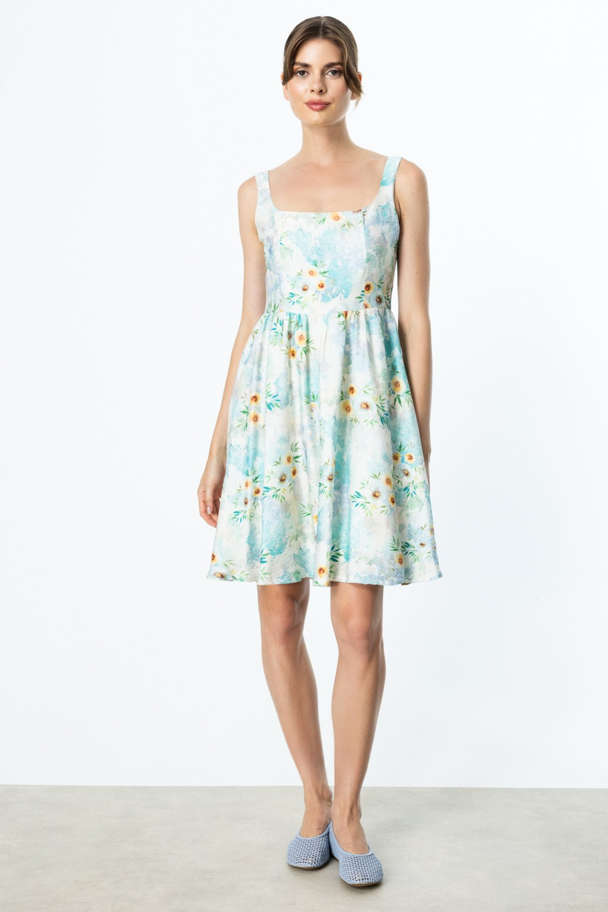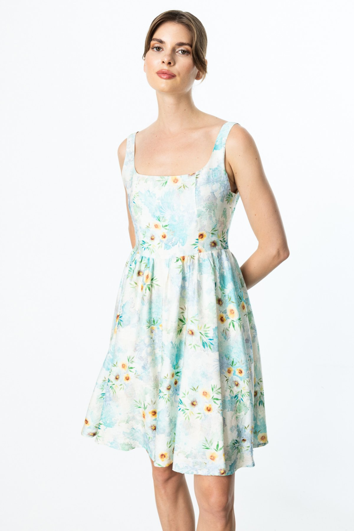 Ürün Özellikleri: Kare yaka, kalın askılı, astarlı, fermuarlı, mini, pamuklu, eteği volanlı