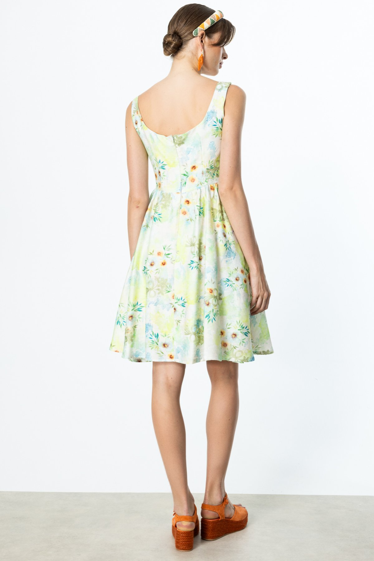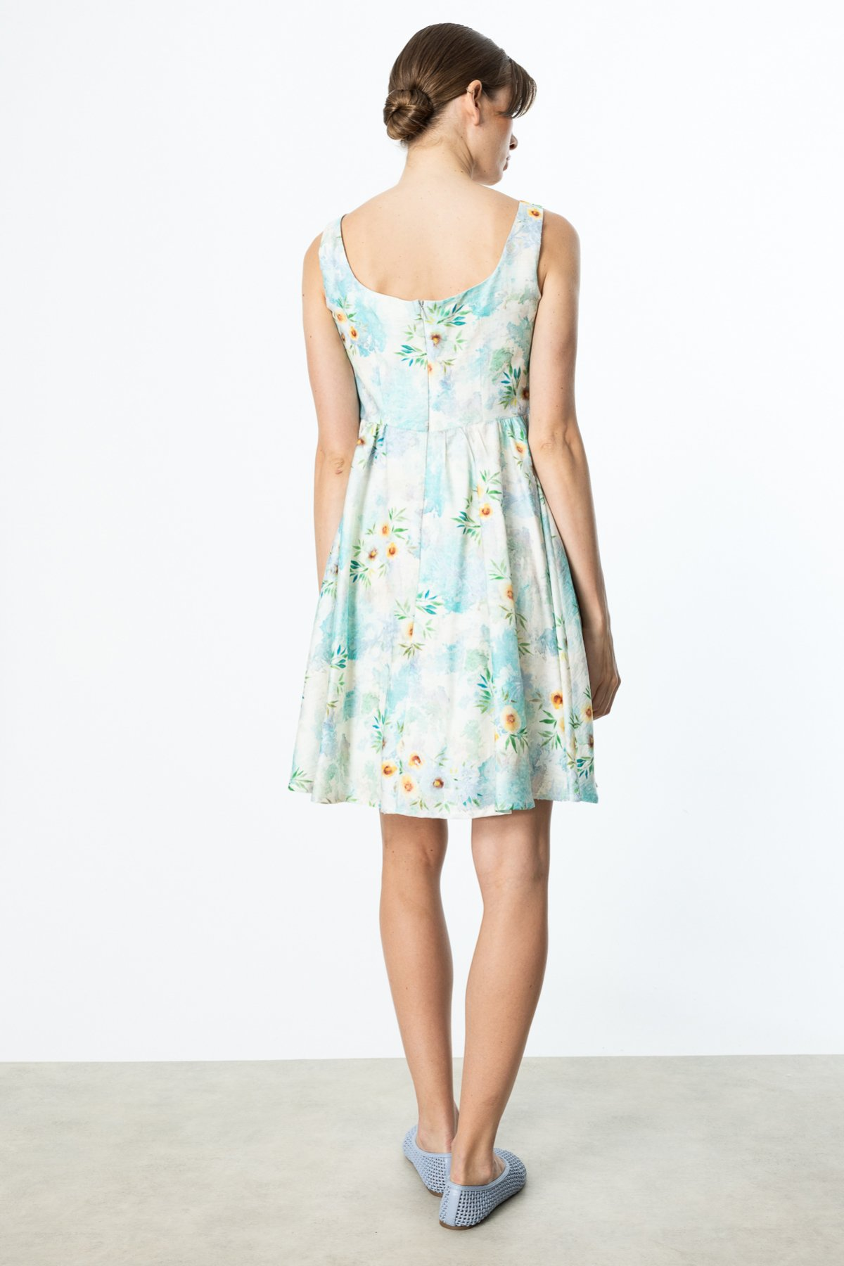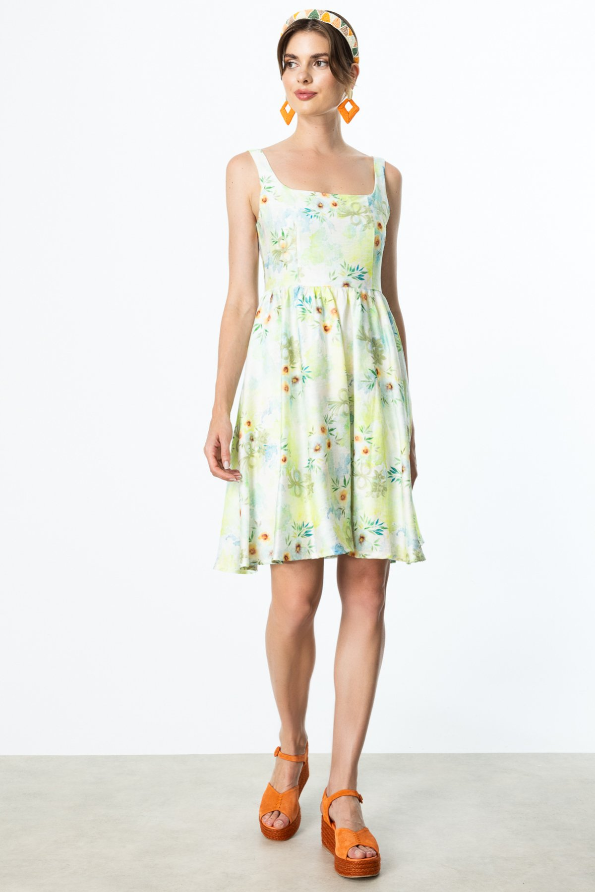 Ürün Özellikleri: Kare yaka, kalın askılı, astarlı, fermuarlı, mini, pamuklu, eteği volanlı