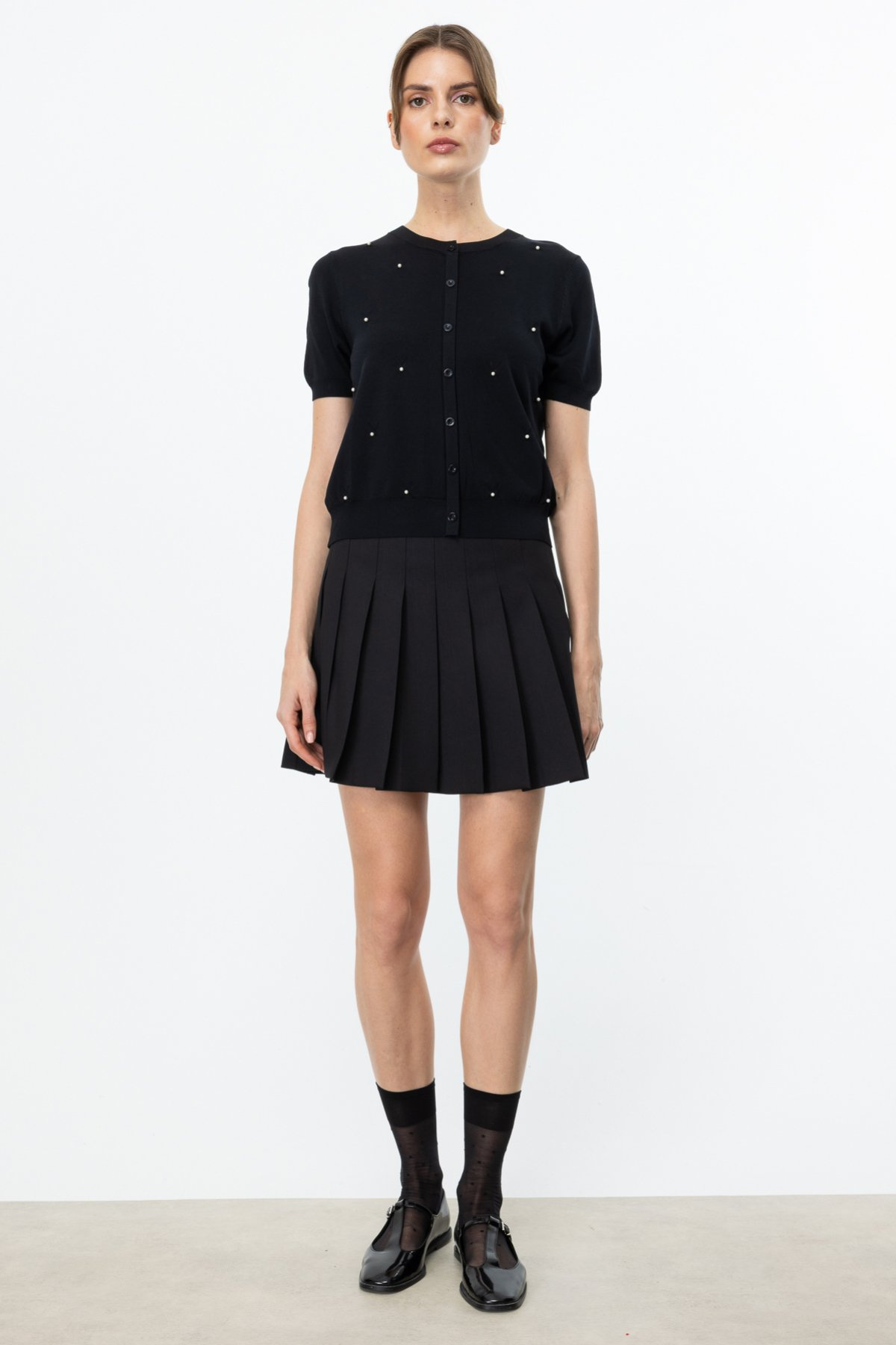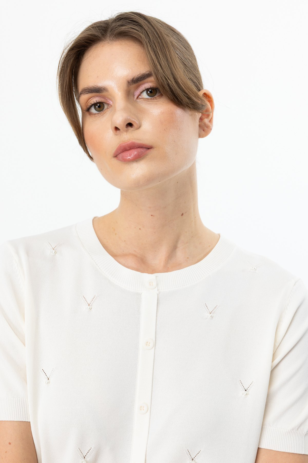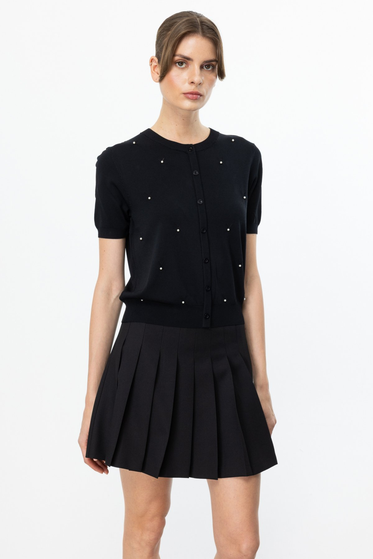 On Minimalist İnci Detaylı Kısa Kol Kadın Bluz - Günlük & Özel Gün