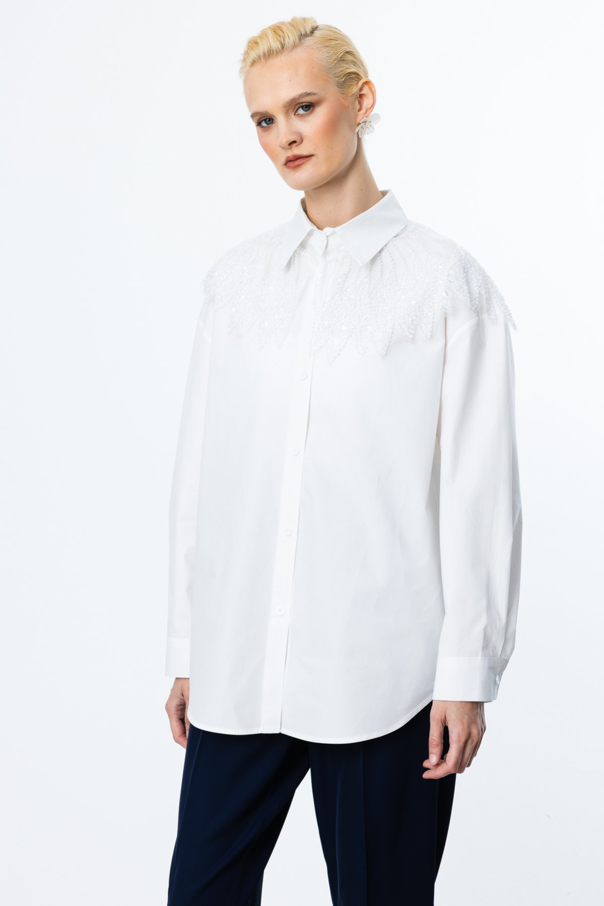 On Omuzları Parçalı Boncuk İşlemeli Pamuk Gömlek